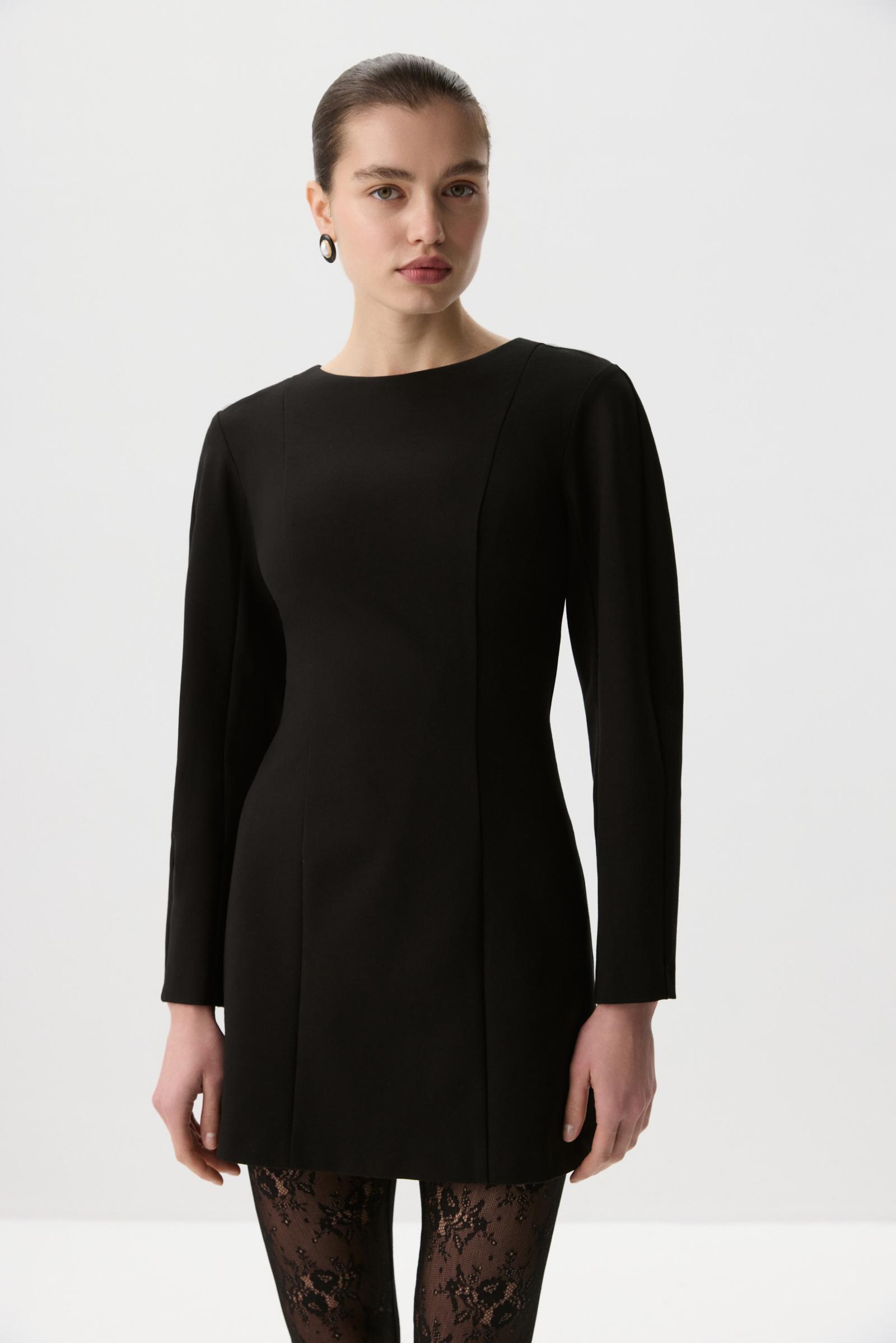 Платье мини о-образного силуэта со спущенным плечом. Модель с горловиной лодка и вертикальными рельефами, которые формируют силуэт. Изделие из плотного, но мягкого трикотажа, на подкладке с застежкой на молнию в среднем шве спинки.