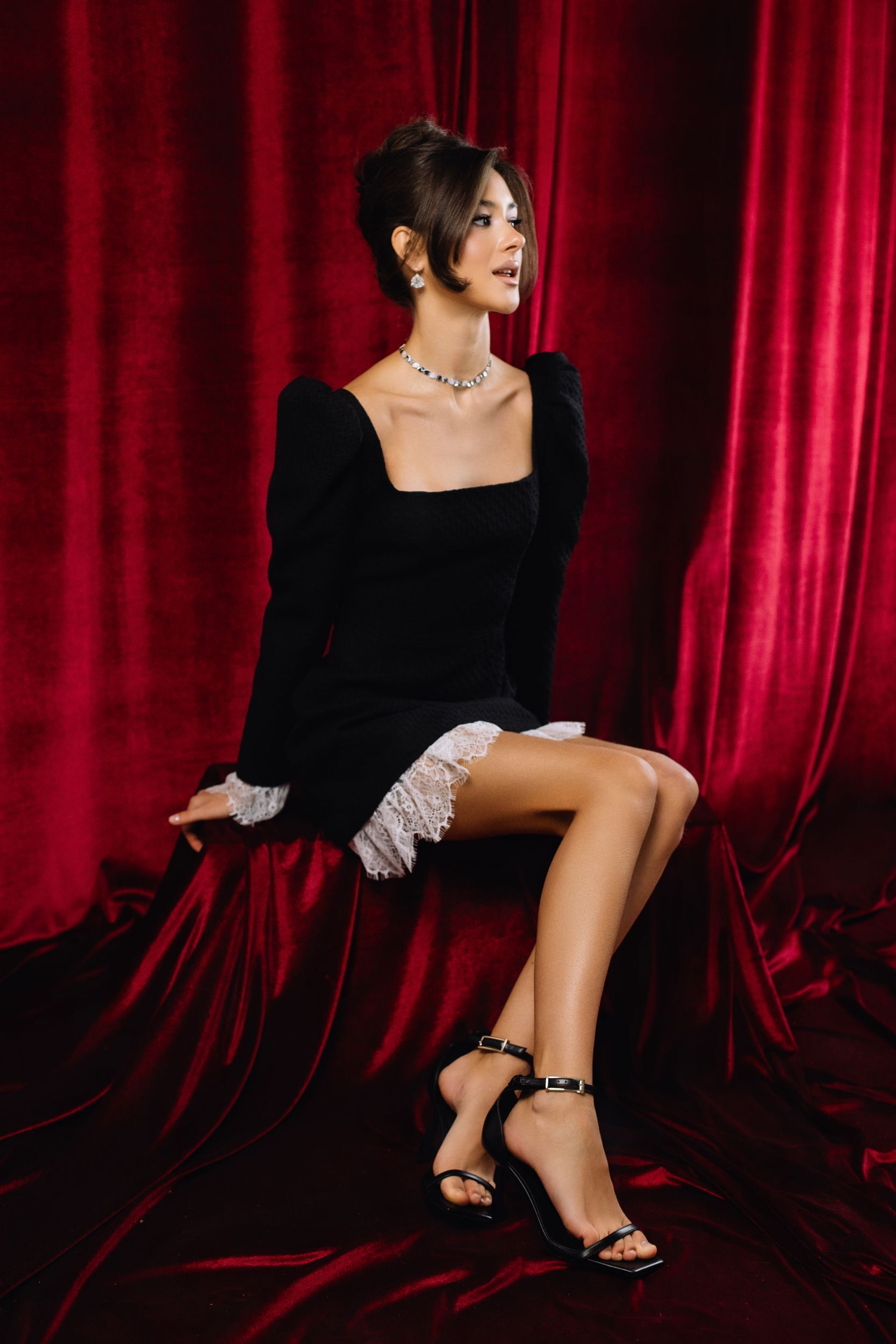 Платье из твида в черном цвете с имитацией выглядывающей кружевной подкладки.