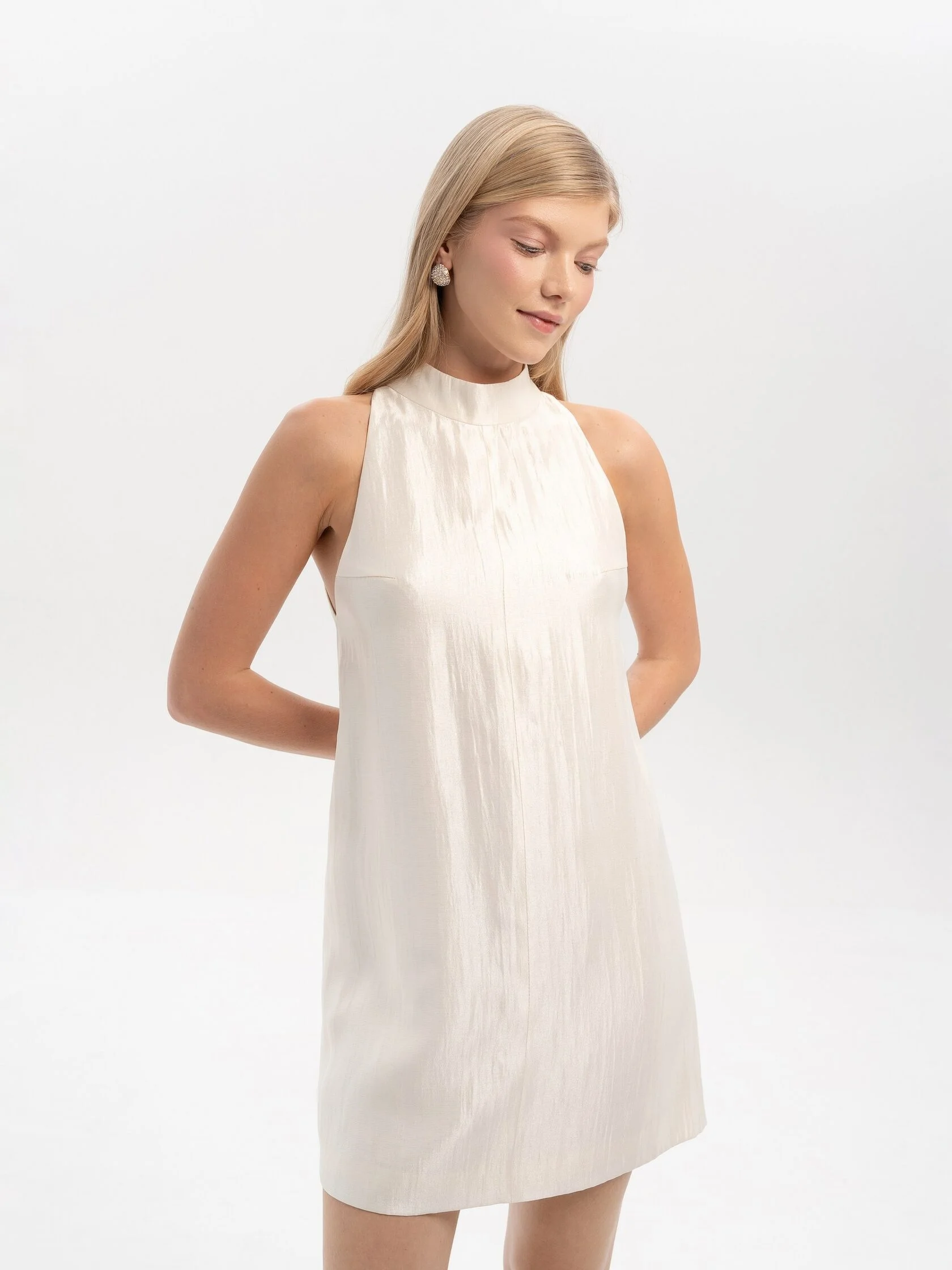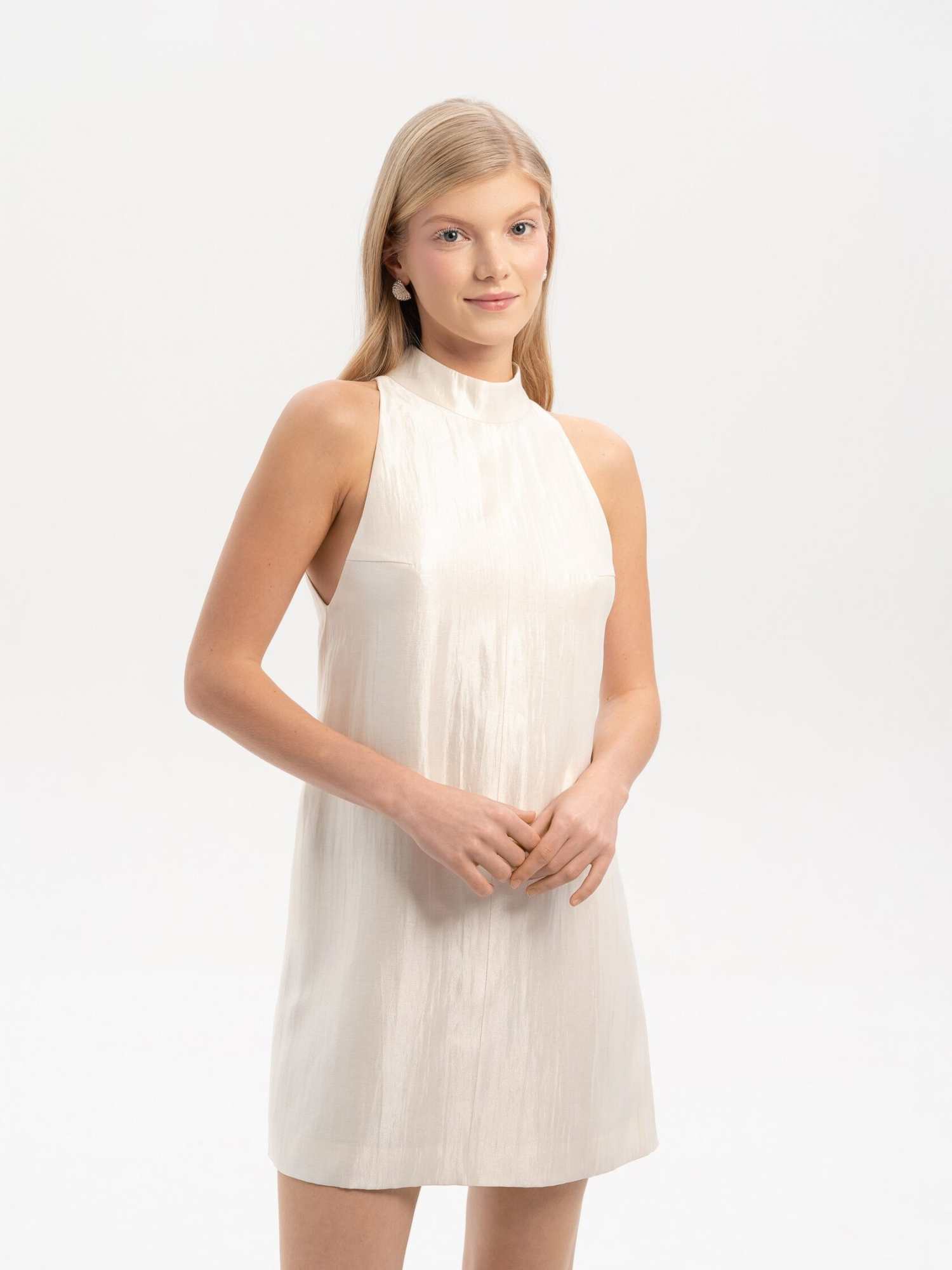Крой платья с акцентом на горловине и мягким силуэтом отсылает к эстетике 1960-х, создавая баланс игривости и сдержанности. Подкладка из вискозы обеспечивает комфорт, а деликатный блеск делает платье идеальным выбором для новогодних праздников. После торжеств его легко адаптировать под более спокойные образы и носить с жакетом, плотными колготками и ботинками.