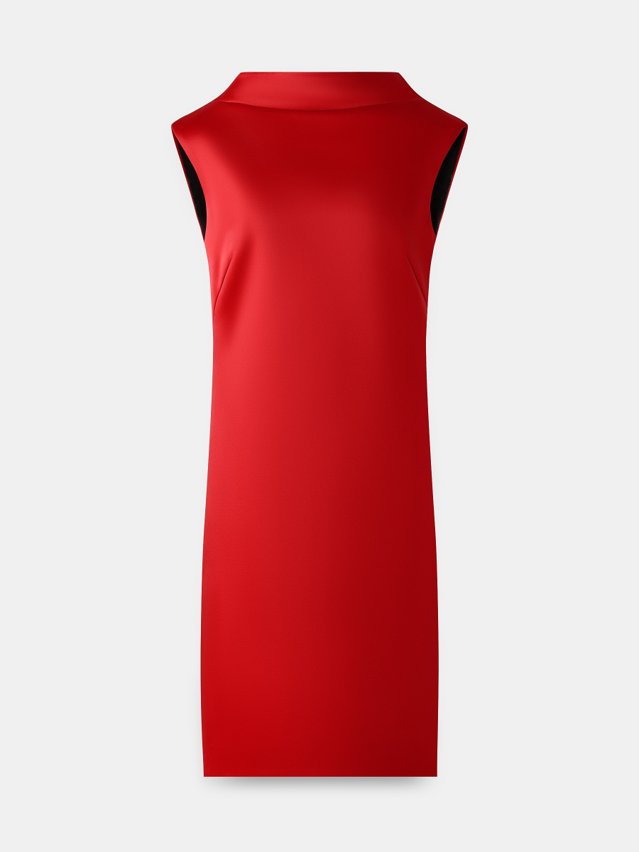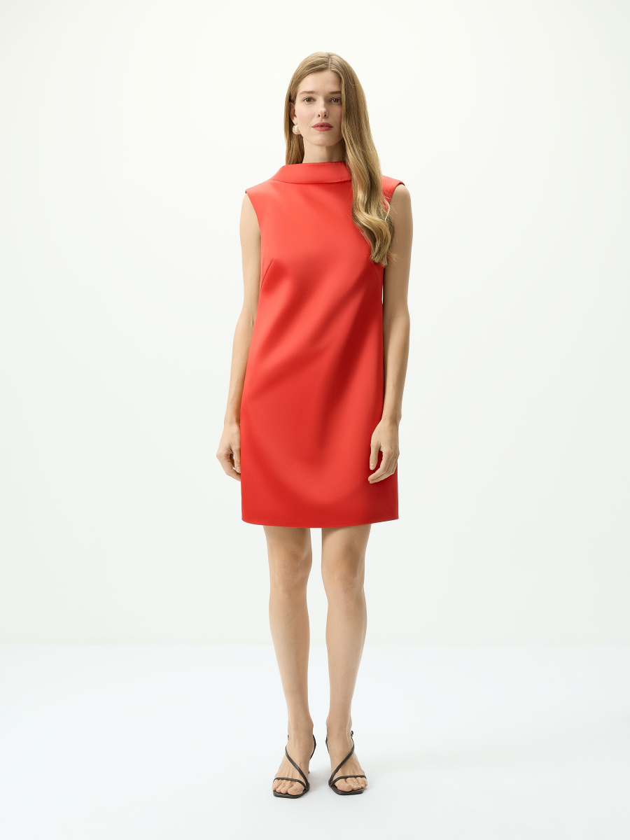 Коктейльное платье мини с контрастной подкладкой во французском стиле — закрытое спереди и с глубоким V-образным вырезом на спинке. Воротник-стойка, переходящий в декор-галстук, — элегантный штрих. Прямой, чуть приталенный силуэт обеспечивает комфортную посадку без акцента на нюансах фигуры. Плотный атласный материал не мнется и не просвечивает.