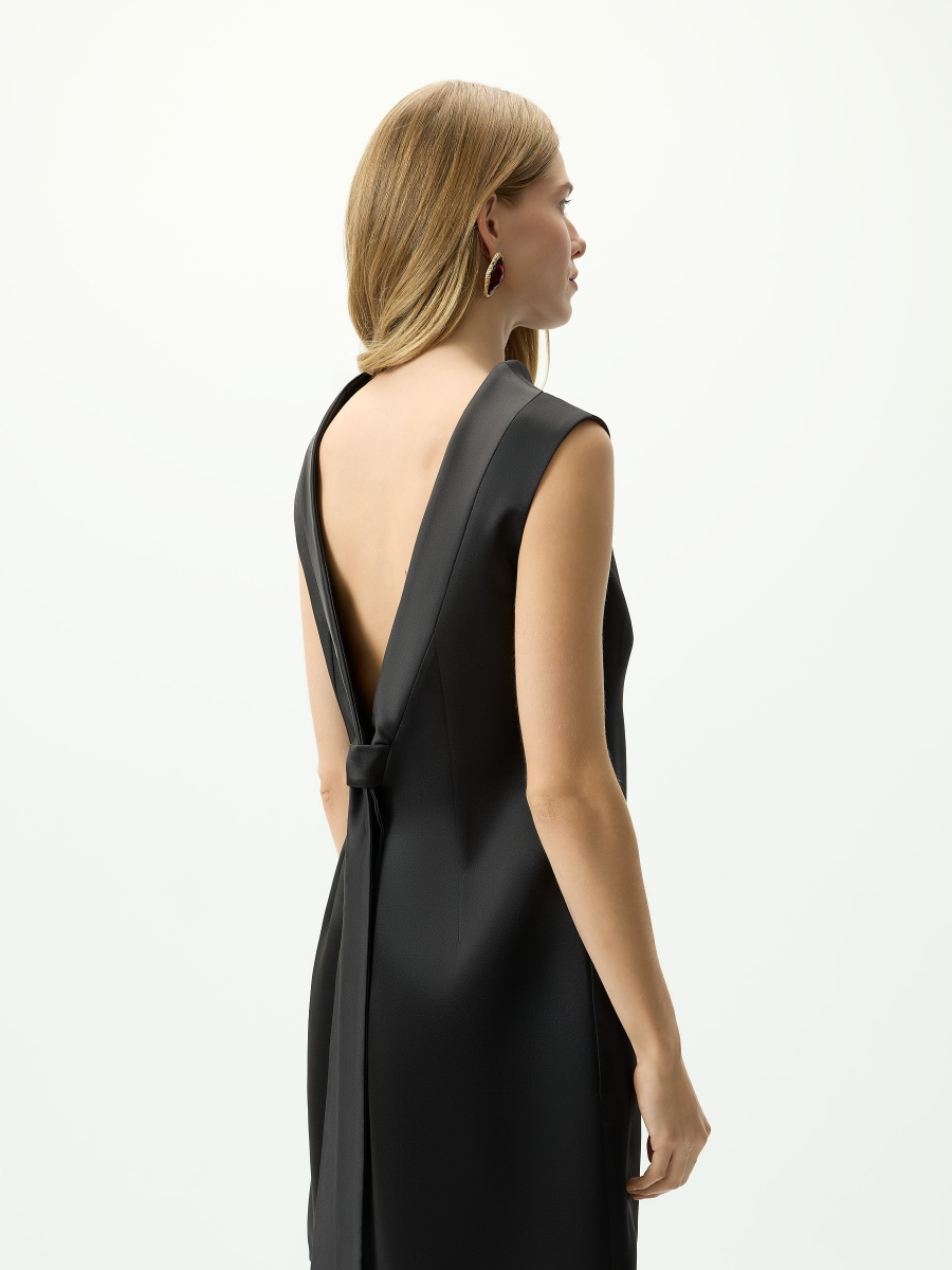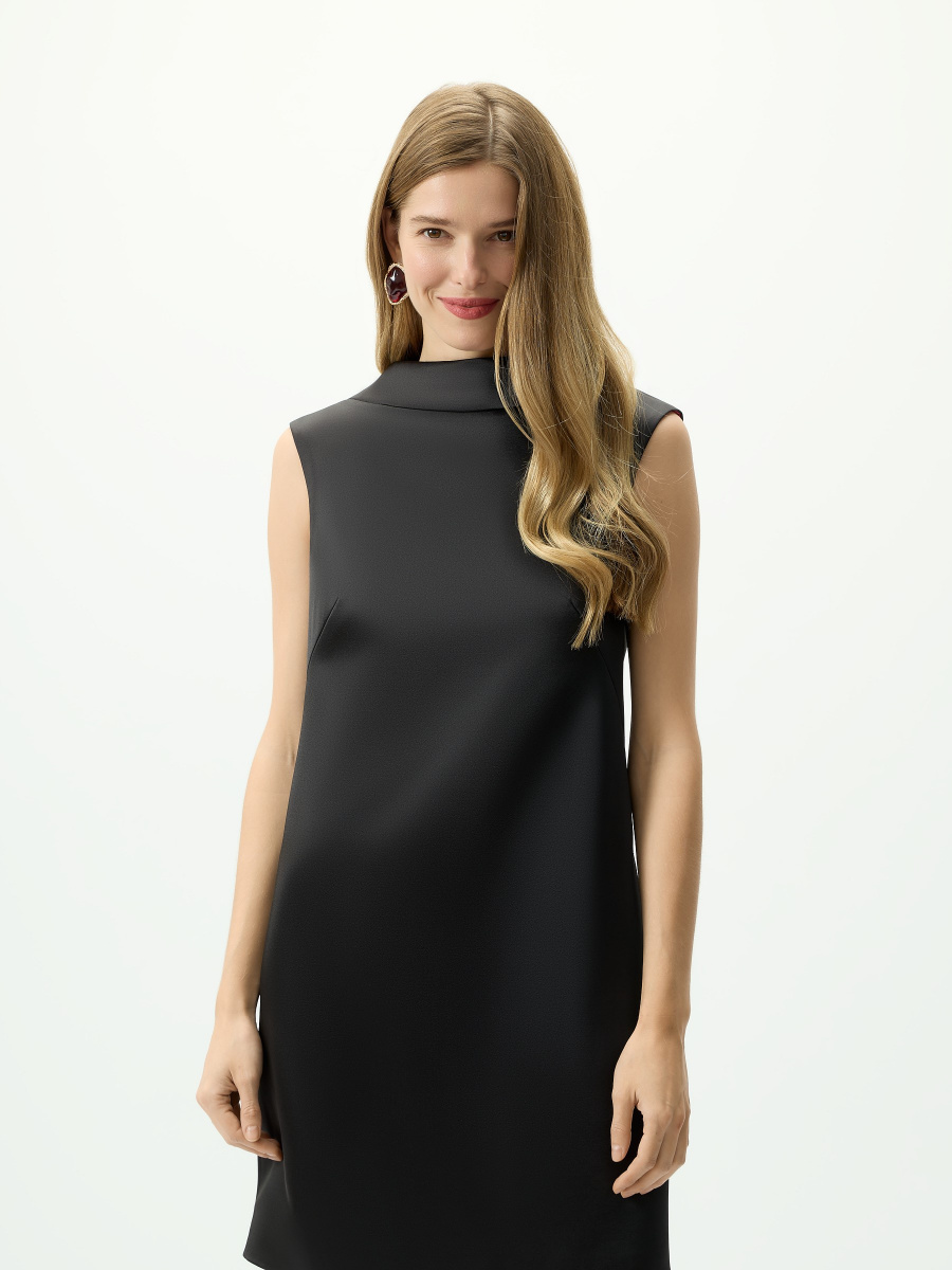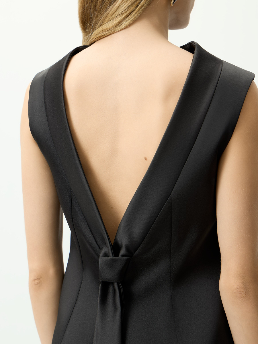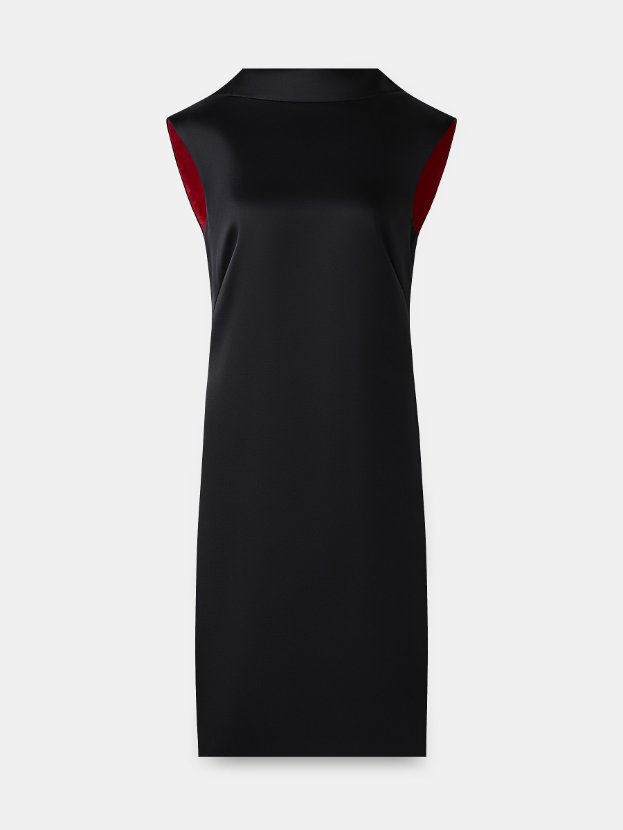 Коктейльное платье мини с контрастной подкладкой во французском стиле — закрытое спереди и с глубоким V-образным вырезом на спинке. Воротник-стойка, переходящий в декор-галстук, — элегантный штрих. Прямой, чуть приталенный силуэт обеспечивает комфортную посадку без акцента на нюансах фигуры. Плотный атласный материал не мнется и не просвечивает.