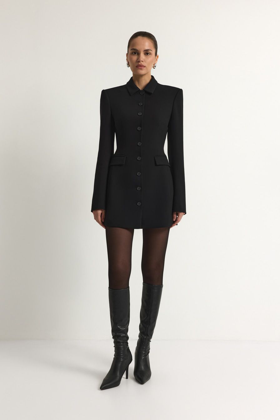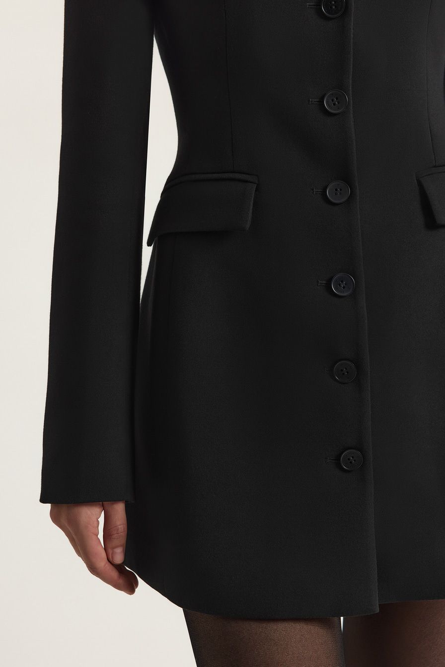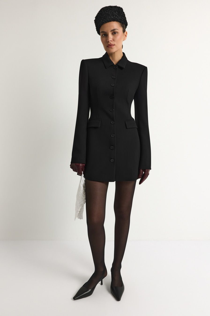 Черное платье- жакет из смесовой вискозы – модель приталенного кроя. Платье дополнено небольшим отложным воротником, боковыми карманами с клапанами и застежкой на пуговицы.