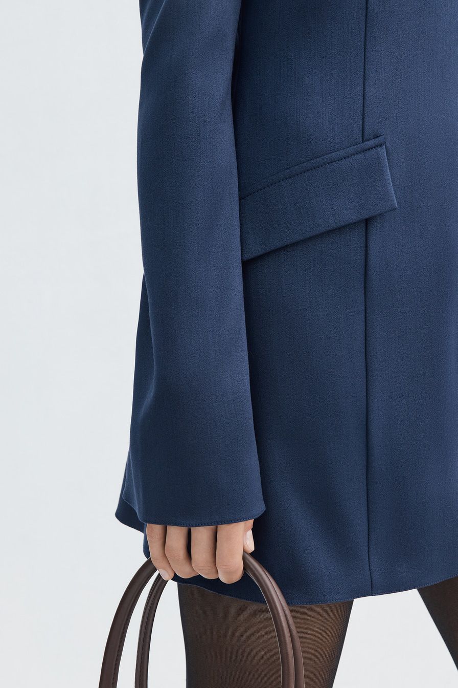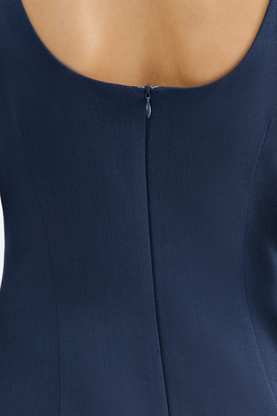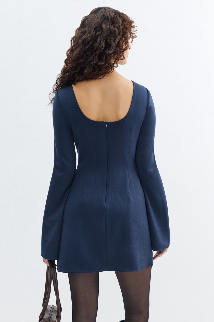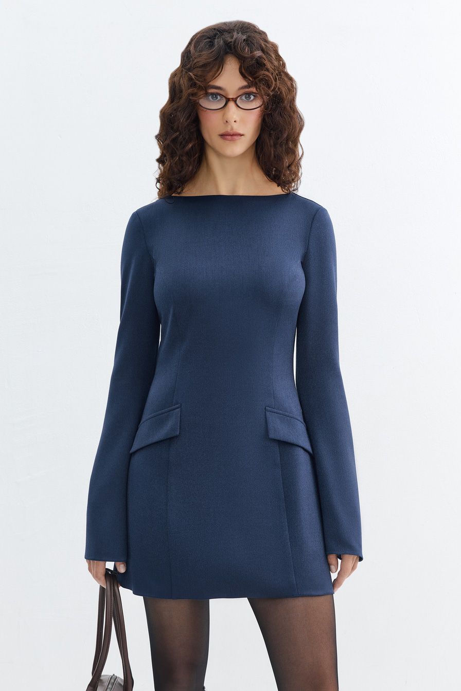 Темно-синее платье-мини с длинными рукавами – модель приталенного кроя с глубоким вырезом на спине. Платье дополнено декоративными боковыми карманами с клапанами.