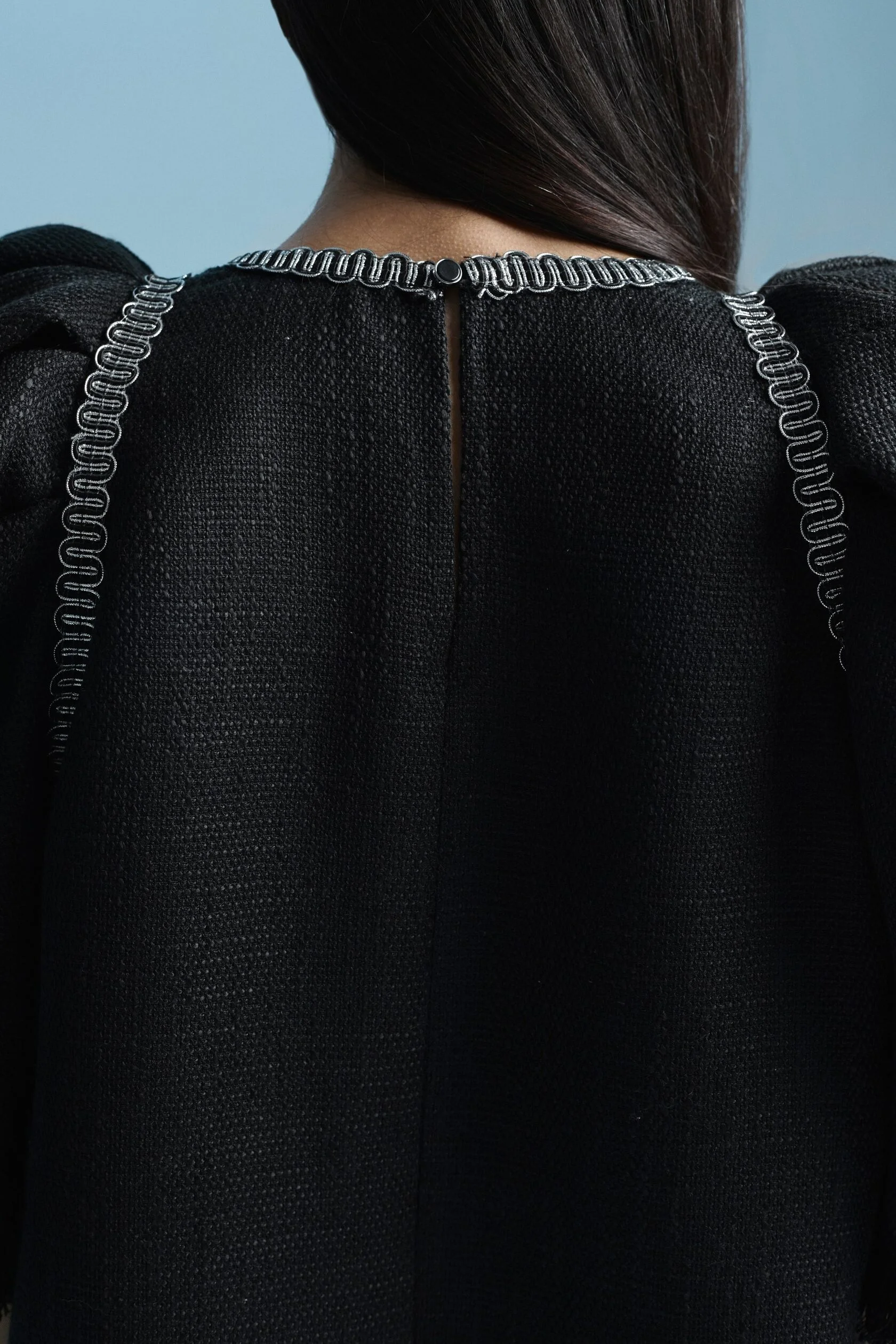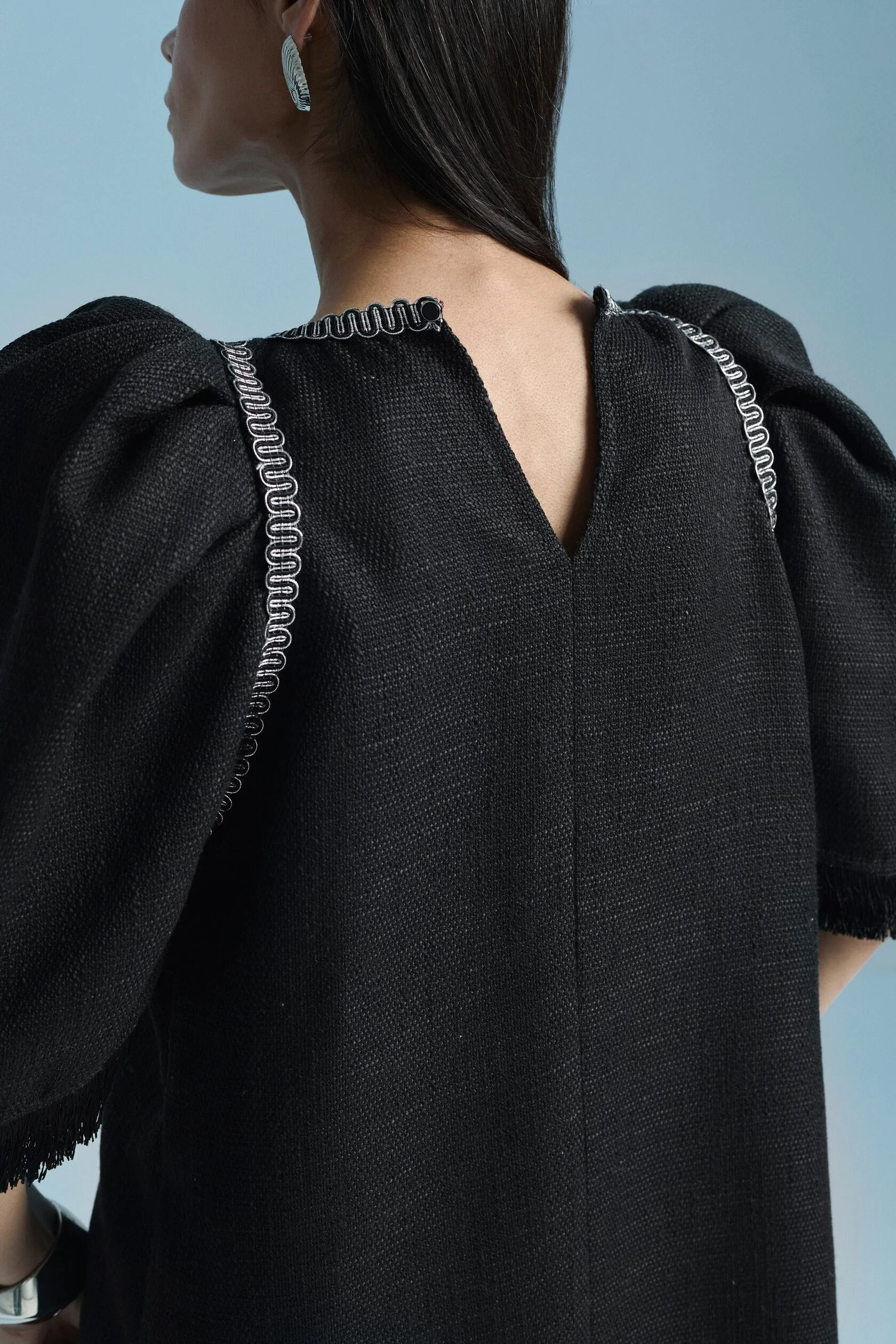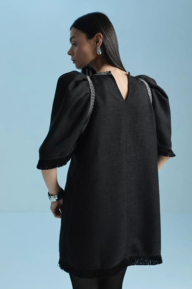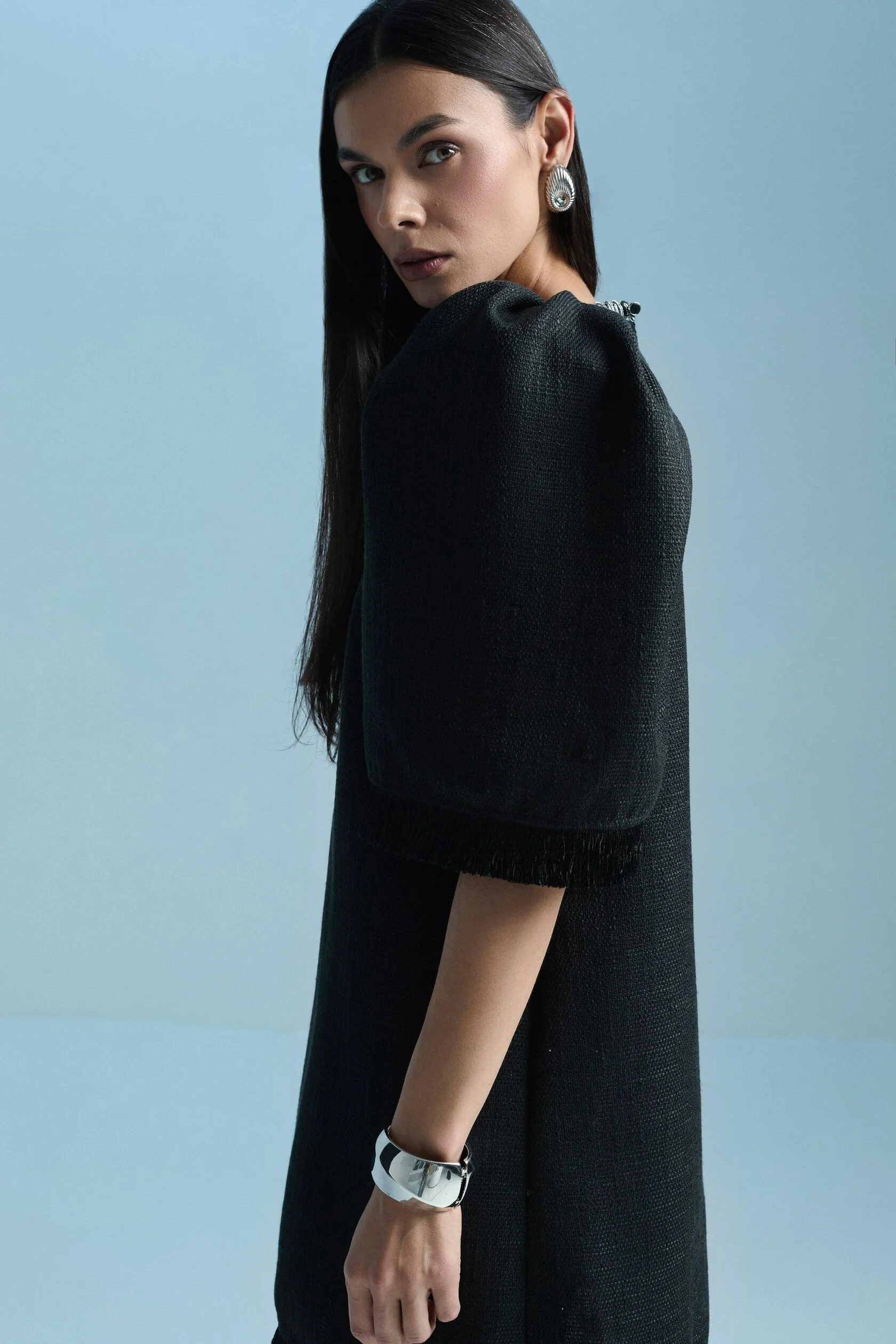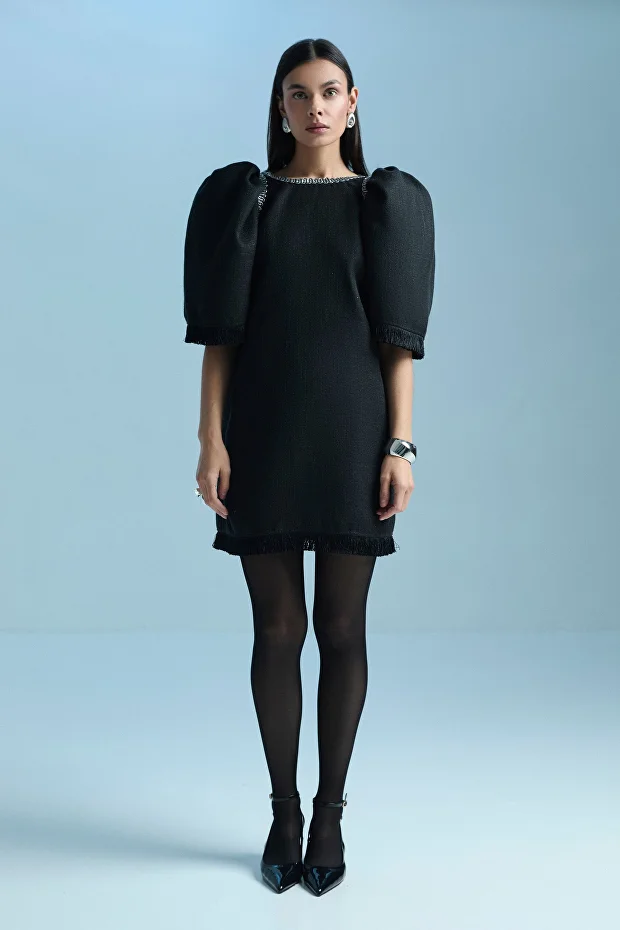 Платье WIND из твида — это сочетание классики и современного силуэта: структурный, фактурный материал и романтичные объёмные рукава-фонарики создают баланс между строгой элегантностью и лёгкой игривостью.
