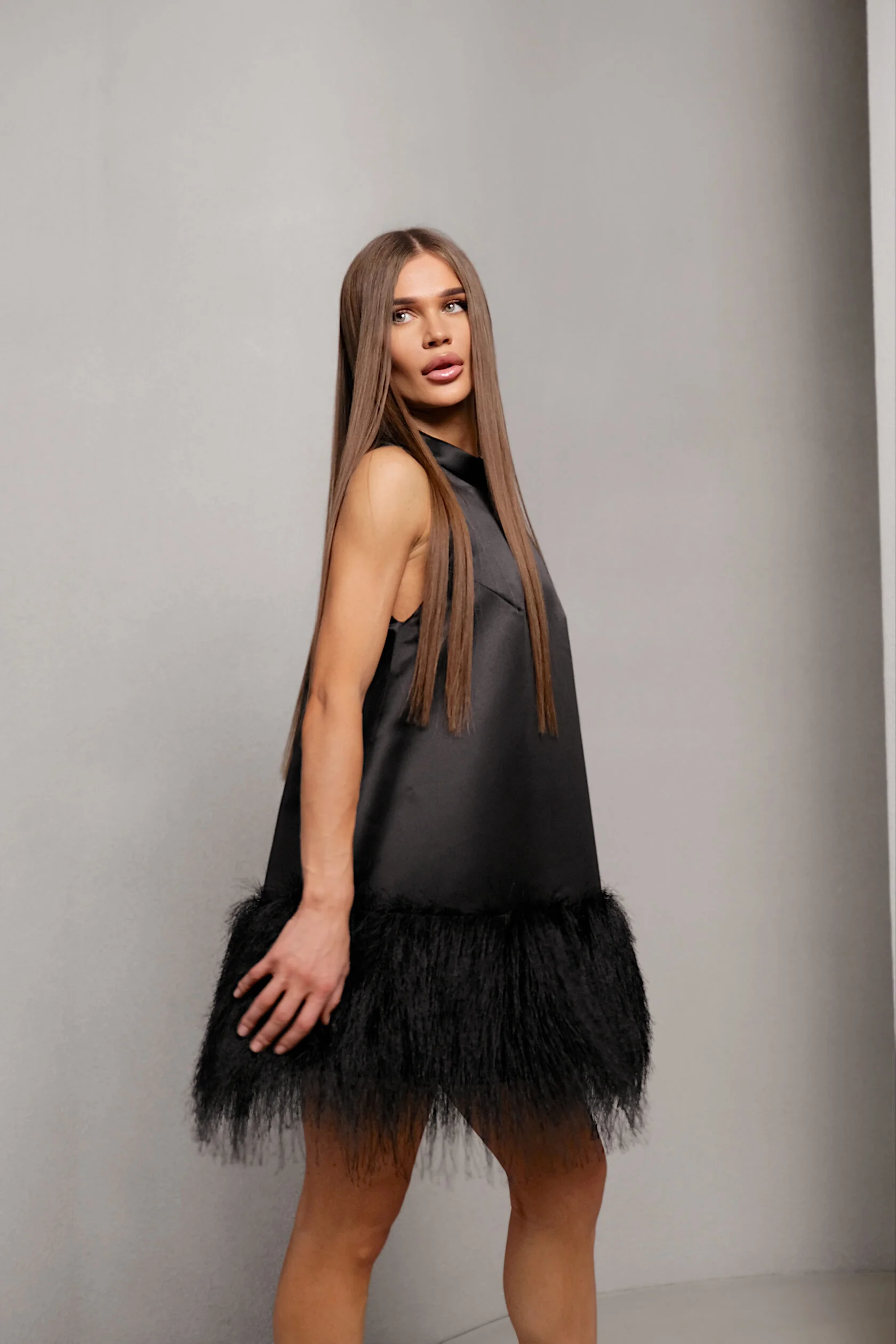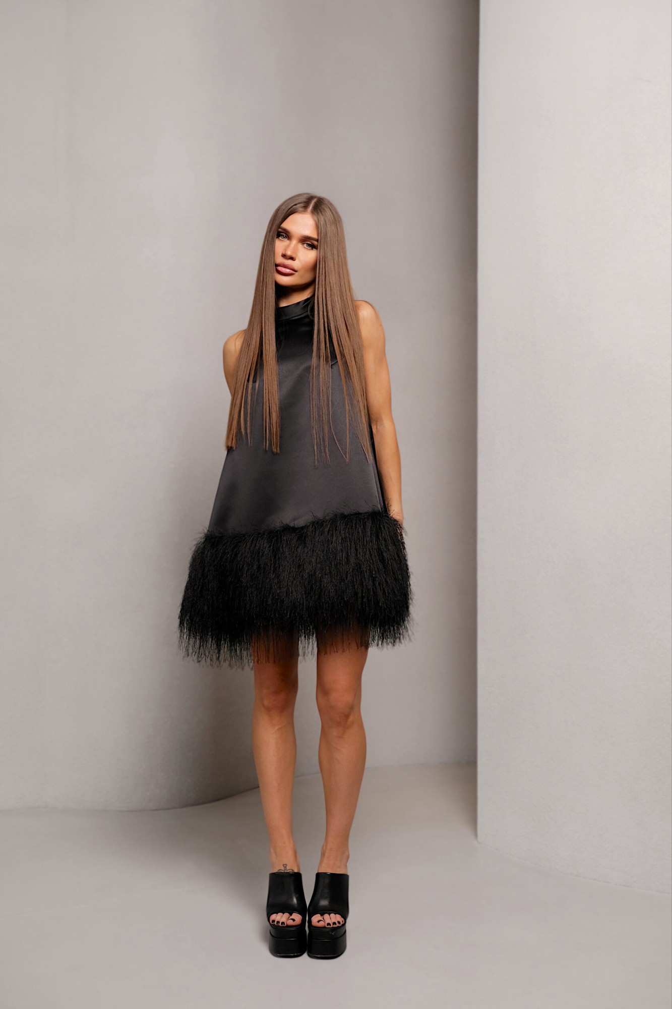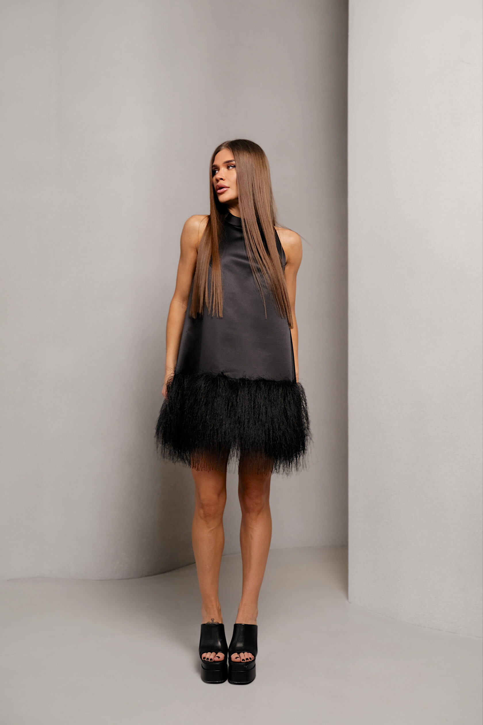 Платье длины мини с высоким воротником и эффектной вставкой по низу.