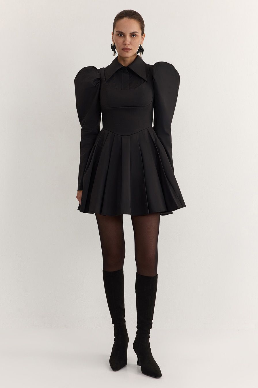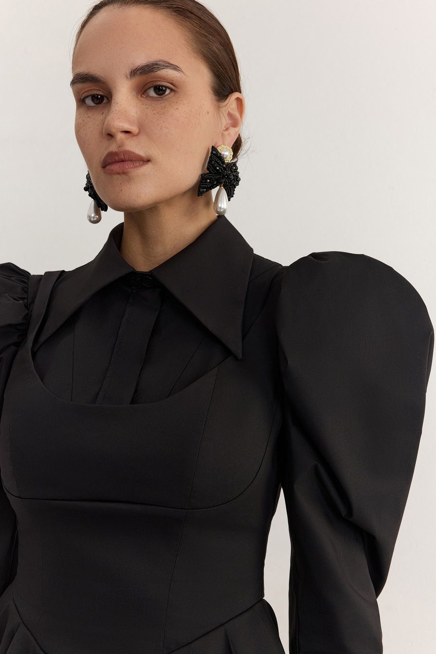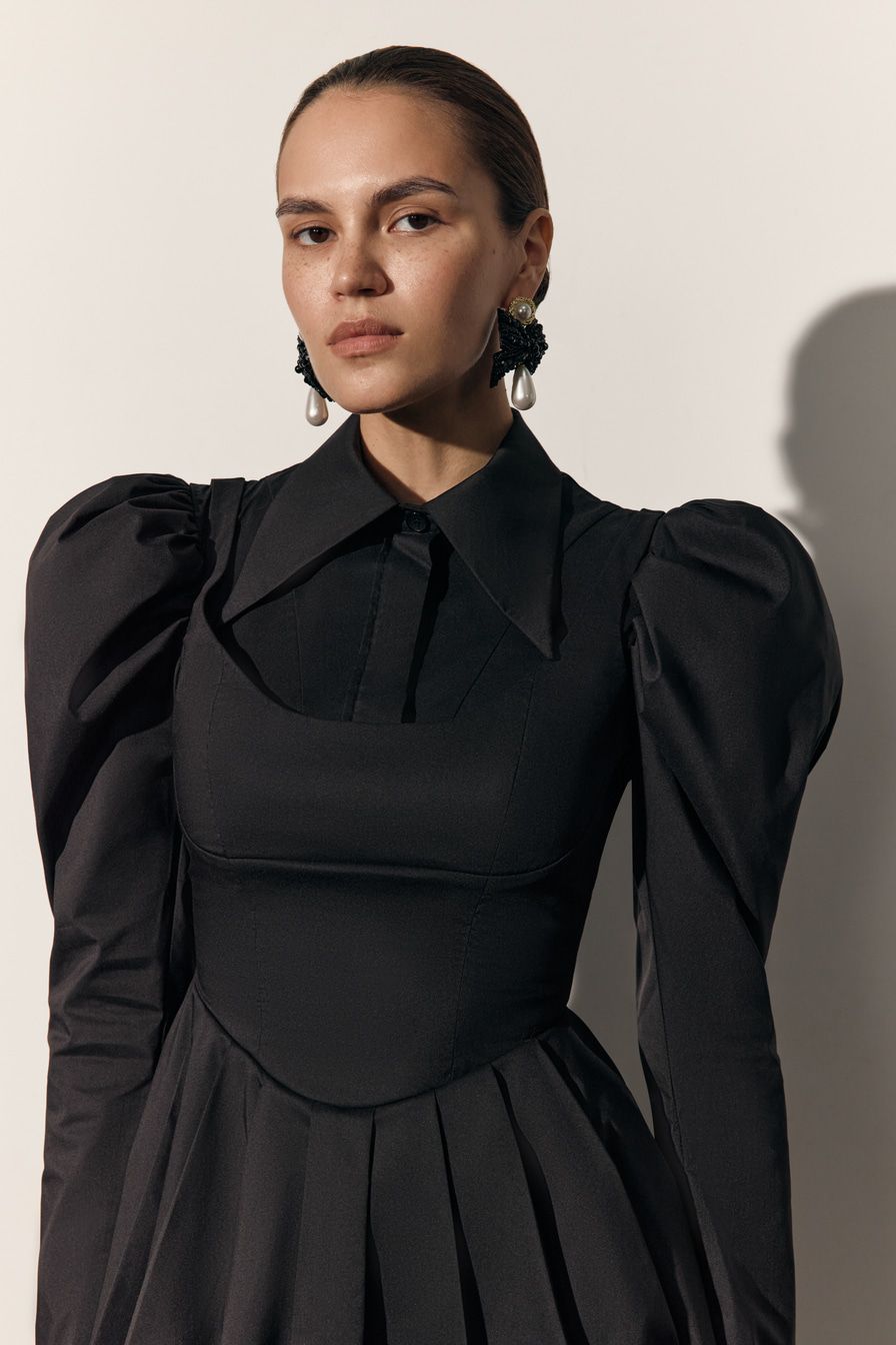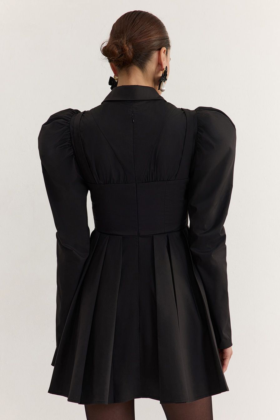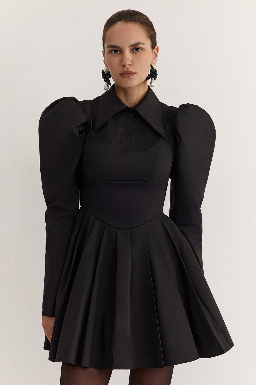 Черное платье-мини из смесового хлопка – модель приталенного кроя с корсетной основой и пышной юбкой. Платье дополнено длинными рукавами «жиго» с акцентными плечами, складками на юбке и декоративной вставкой, которая имитирует рубашку, надетую под платье.