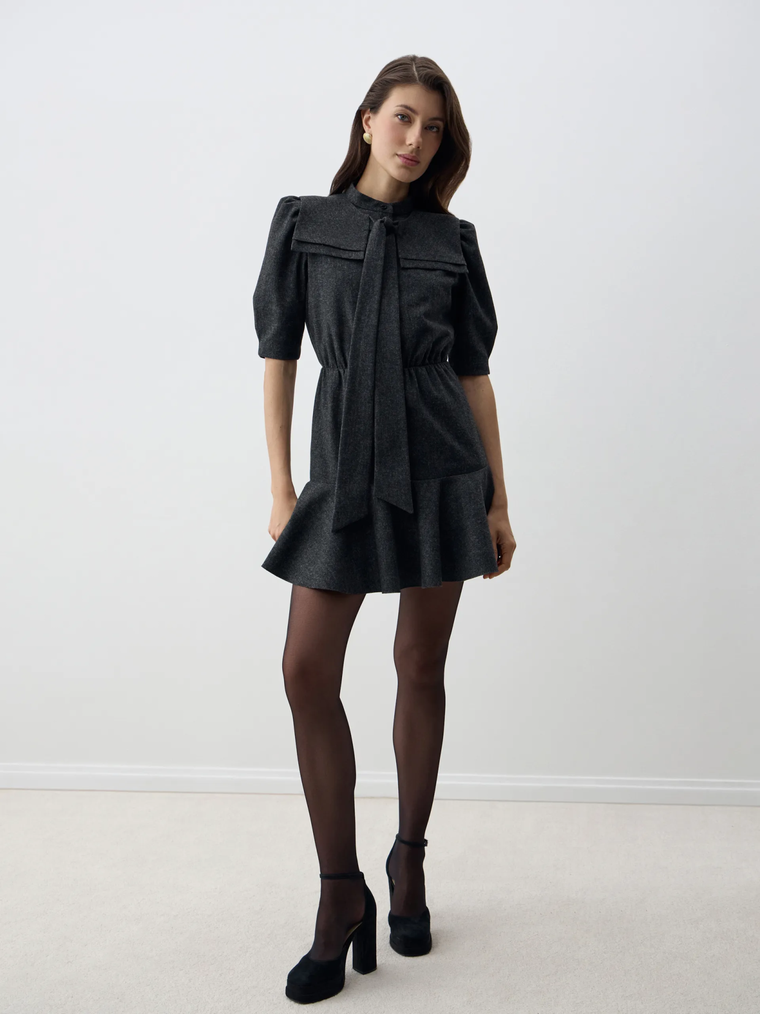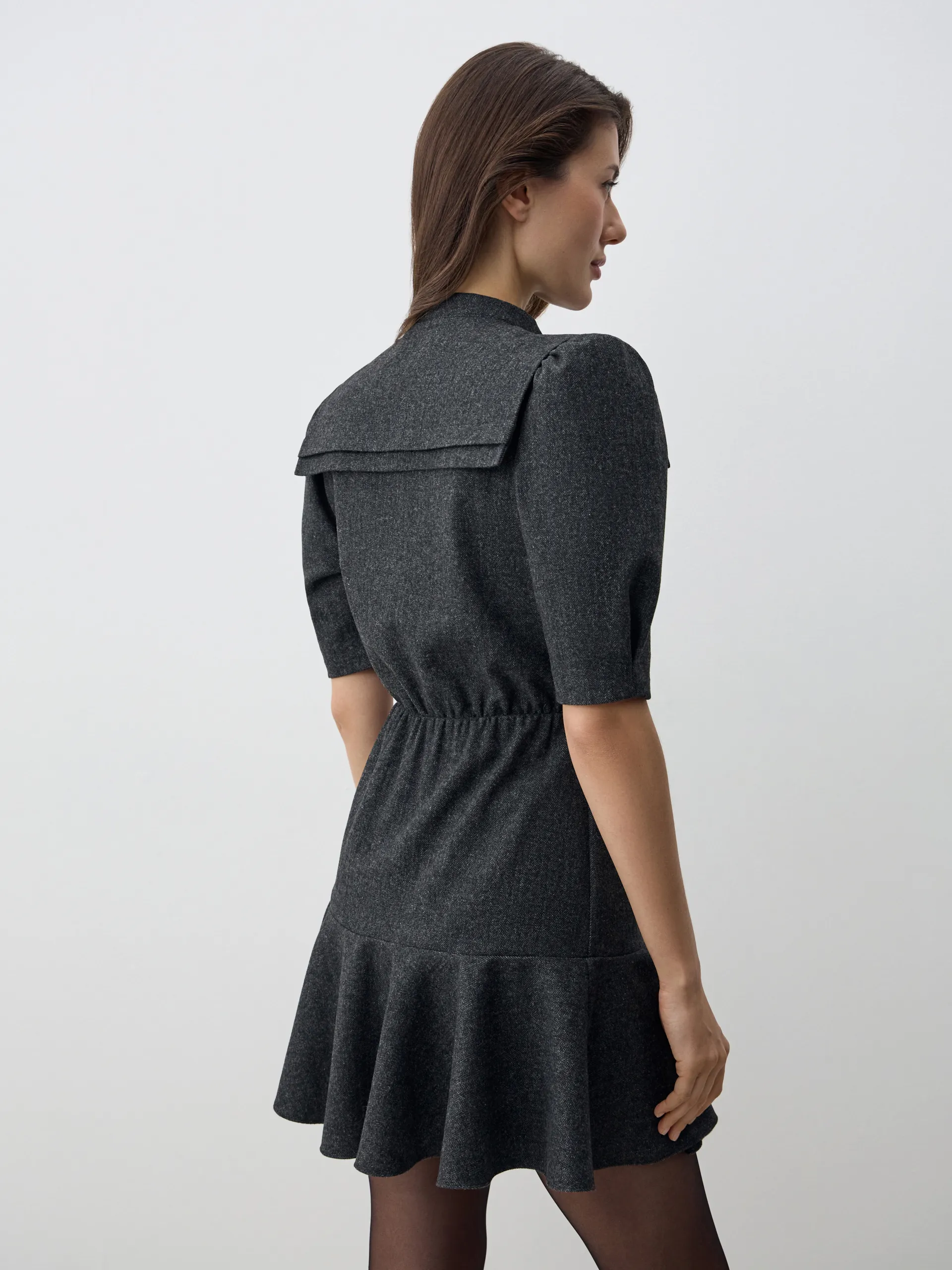 Платье-мини Nissa в благородном графитовом оттенке выполнено из костюмной ткани с содержанием 30% шерсти, благодаря чему оно мягкое, тёплое и держит форму. Приталенный силуэт подчеркивает фигуру, а сборка по линии талии и волан по низу придают образу женственность и динамику. Съёмный воротник и рукава-фонарики длиной до локтя добавляют выразительности и акцента. Платье полностью на подкладке, комфортное в носке и идеально садится по фигуре. Элегантное, современное и универсальное — подойдёт как для офиса, так и для особых случаев.
