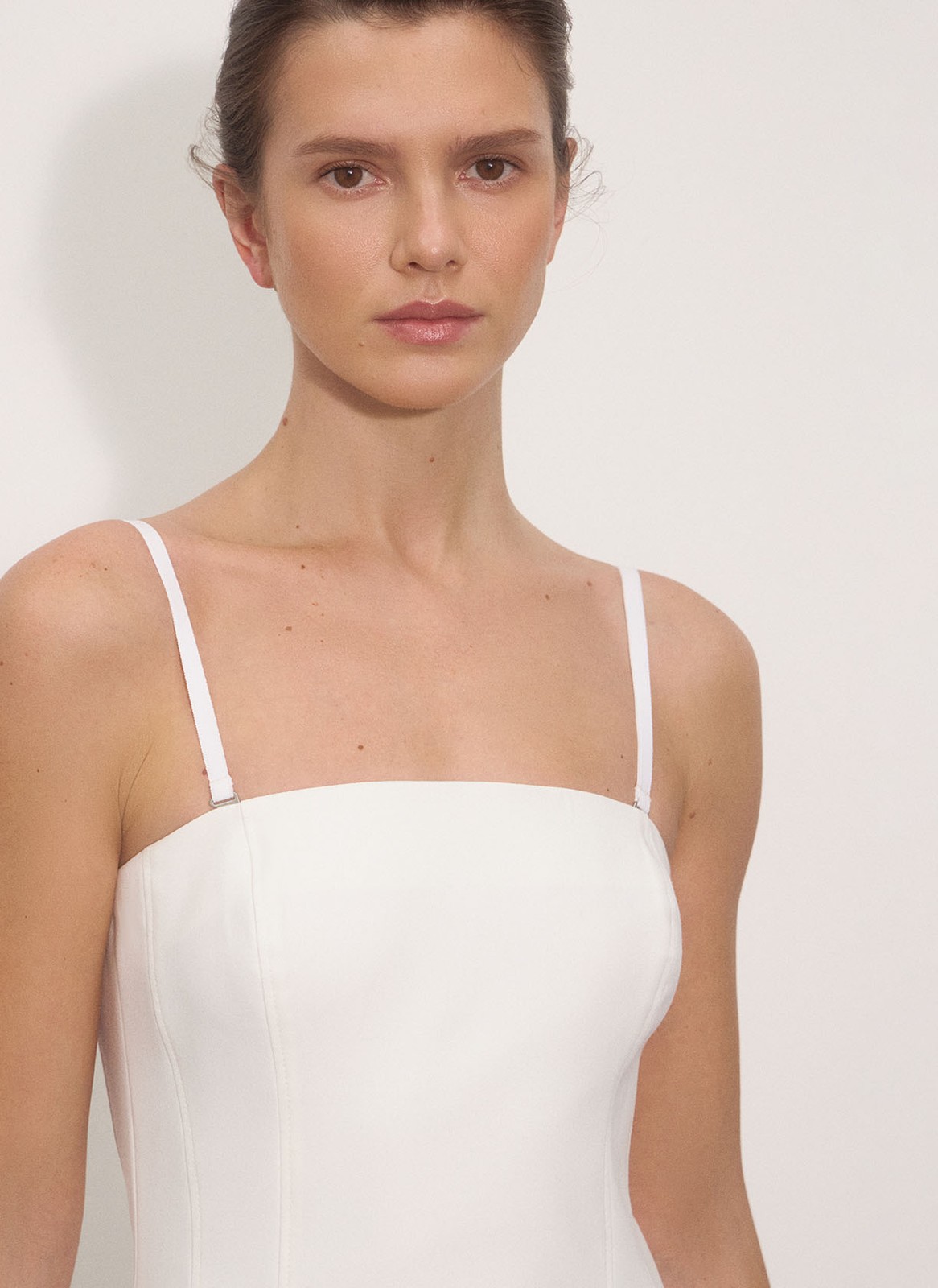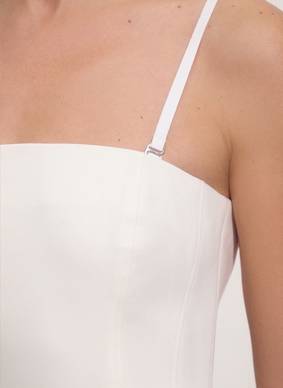 Облегающий силуэт эффектно подчёркивает фигуру, а возможность снять бретели позволяет носить платье с полностью открытыми плечами.