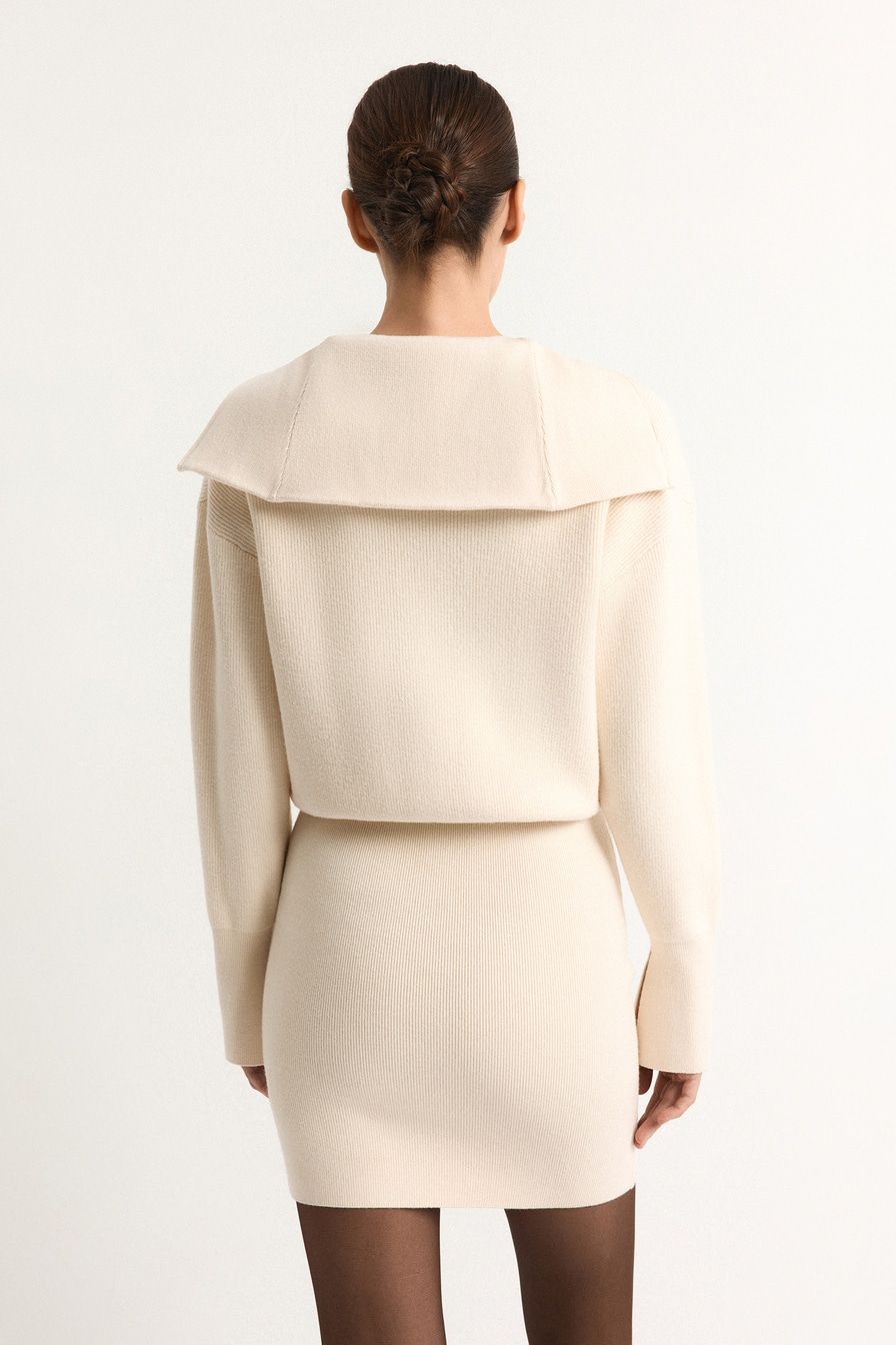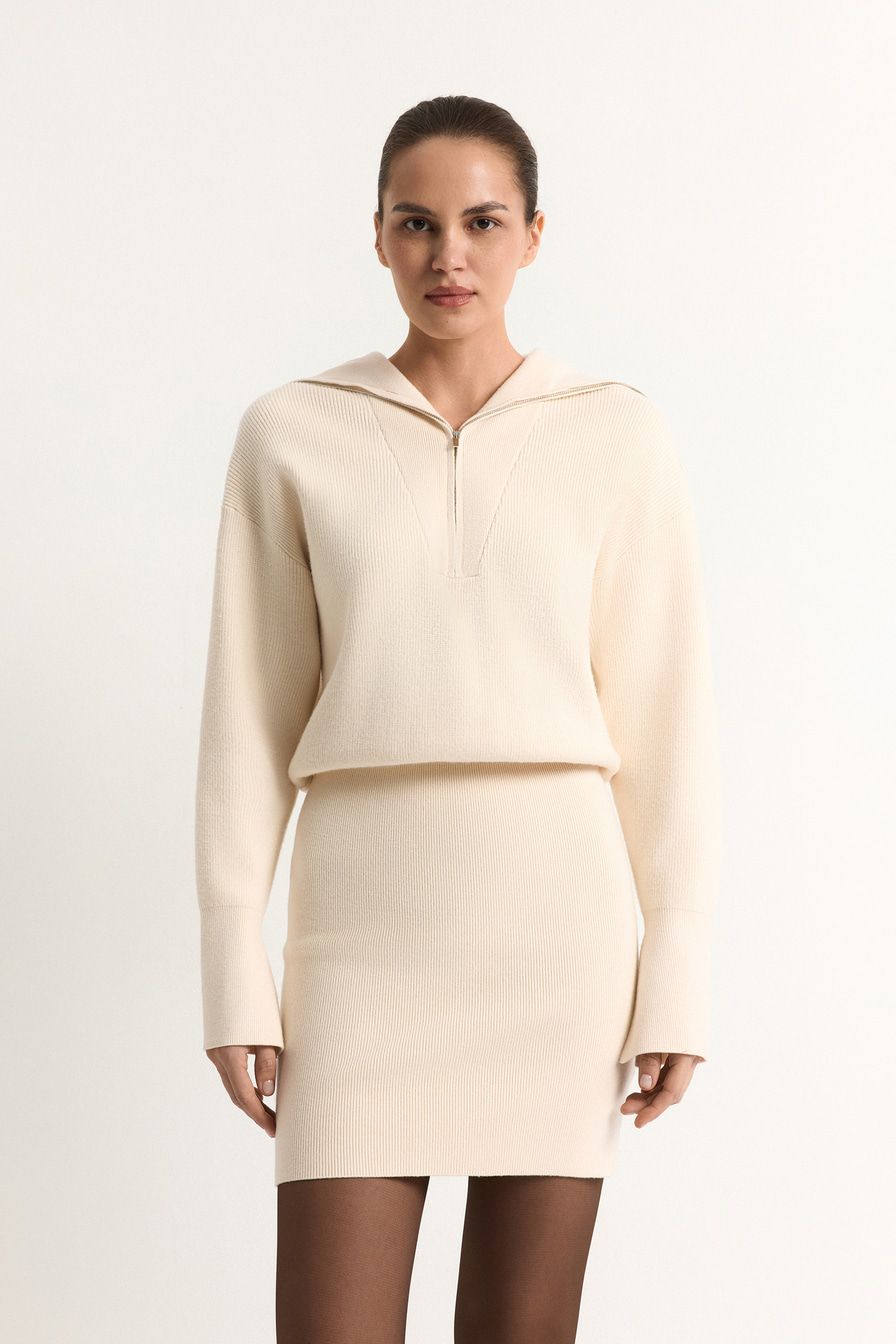 Трикотажное платье из смесовой вискозы имитирует комплект, который состоит из облегающей юбки-мини и джемпера свободного кроя с широким воротником на молнии.