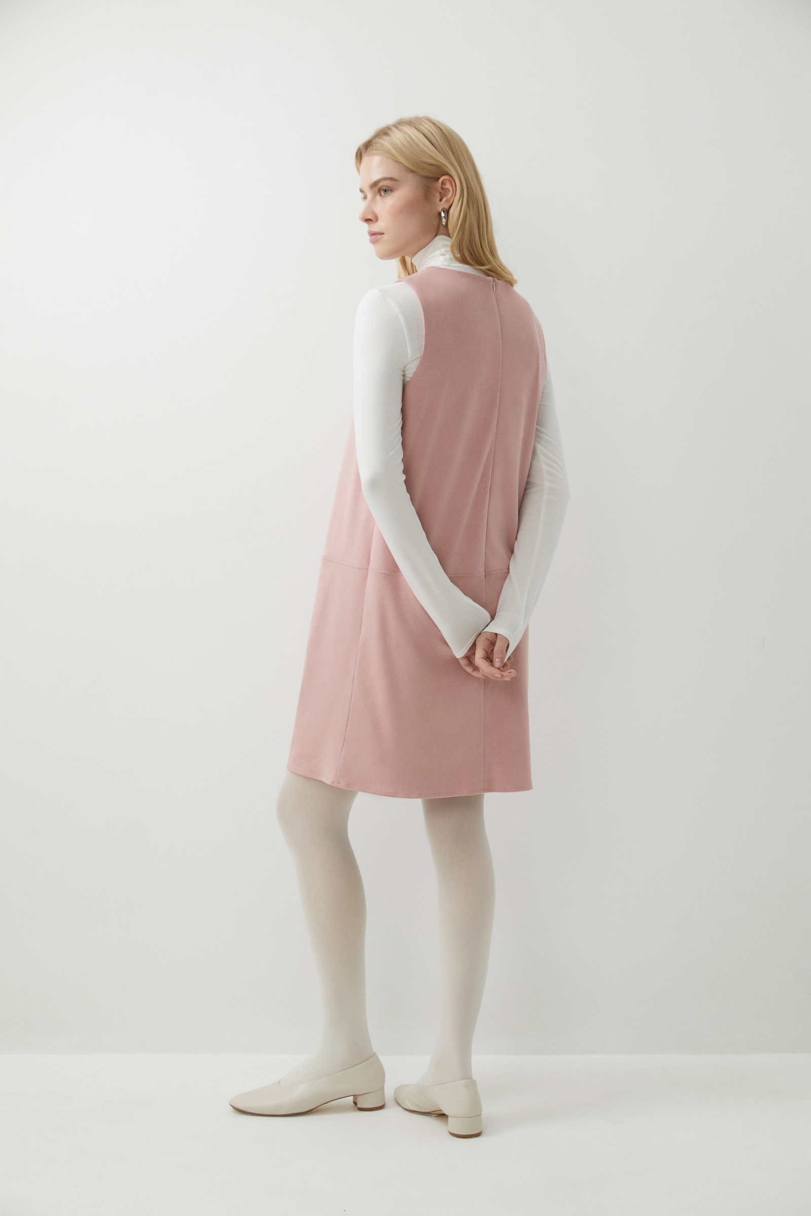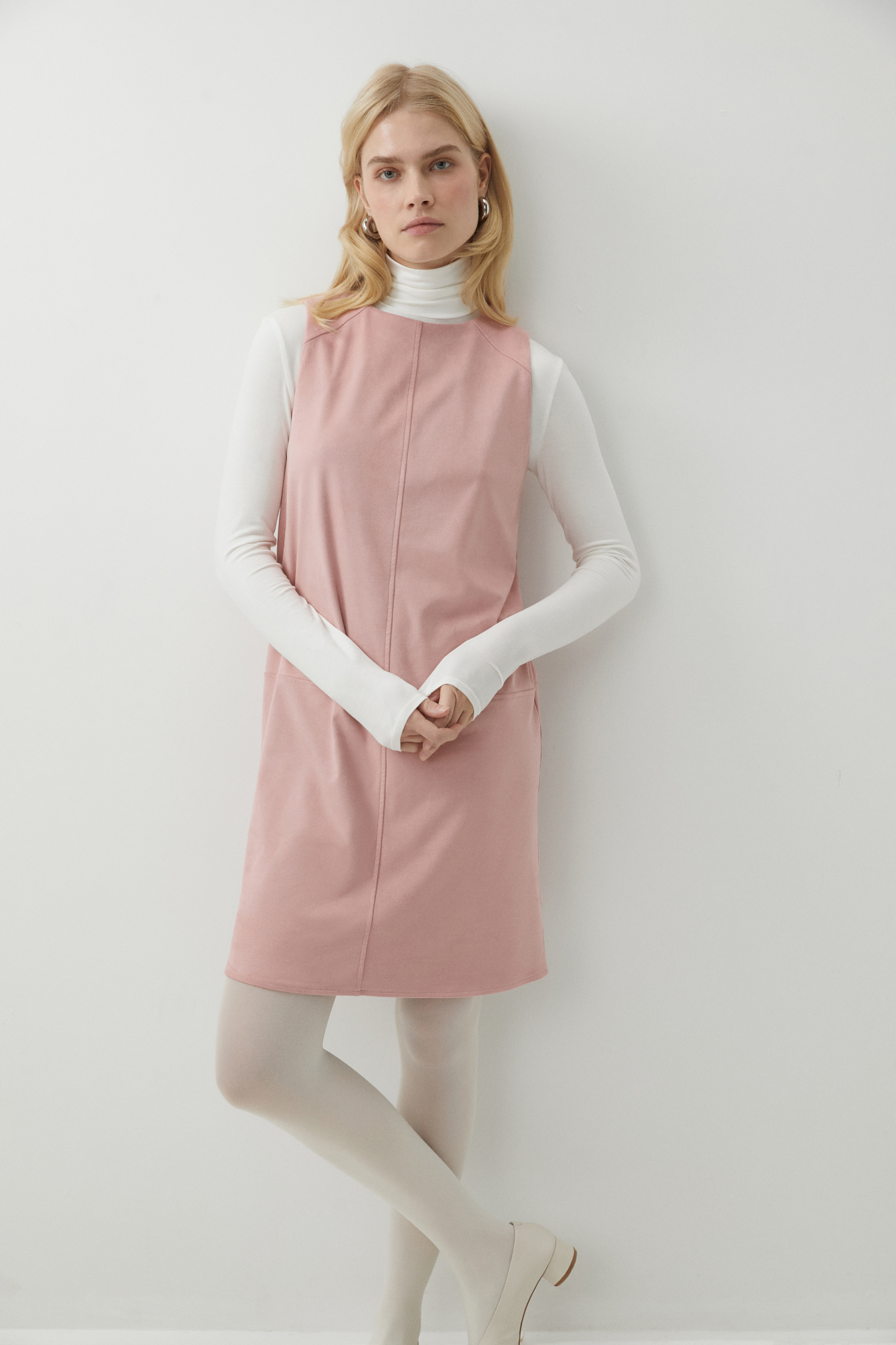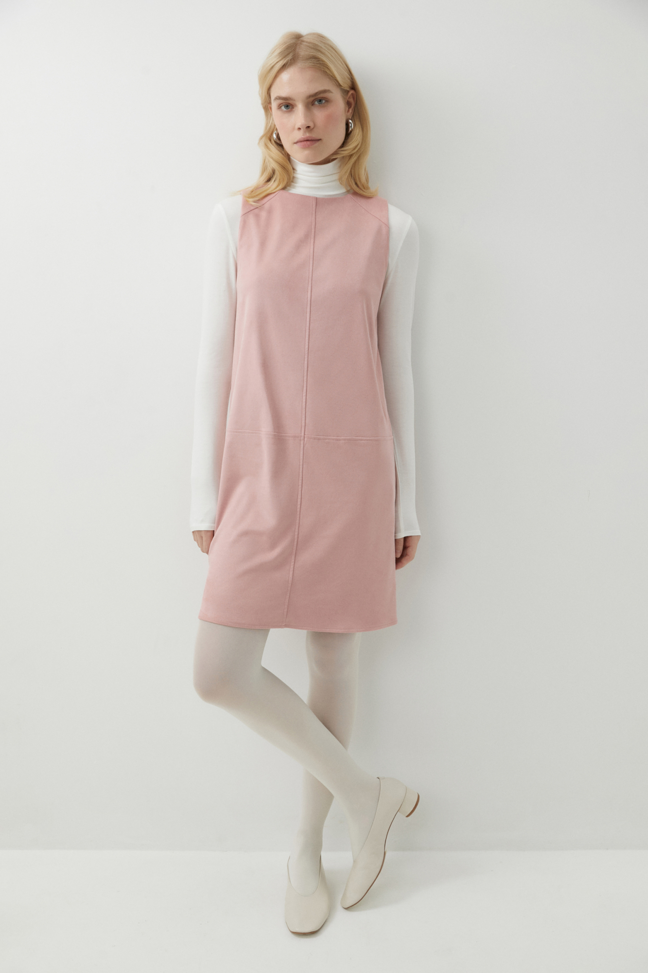 Элегантное и лаконичное платье мини, с круглой горловиной без рукавов. Платье силуэта трапеция с акцентными отстрочками. Застежка на потайную молнию в среднем шве спинки. Платье выполнено из мягкой и пластичной замши с ровным велюровым ворсом.