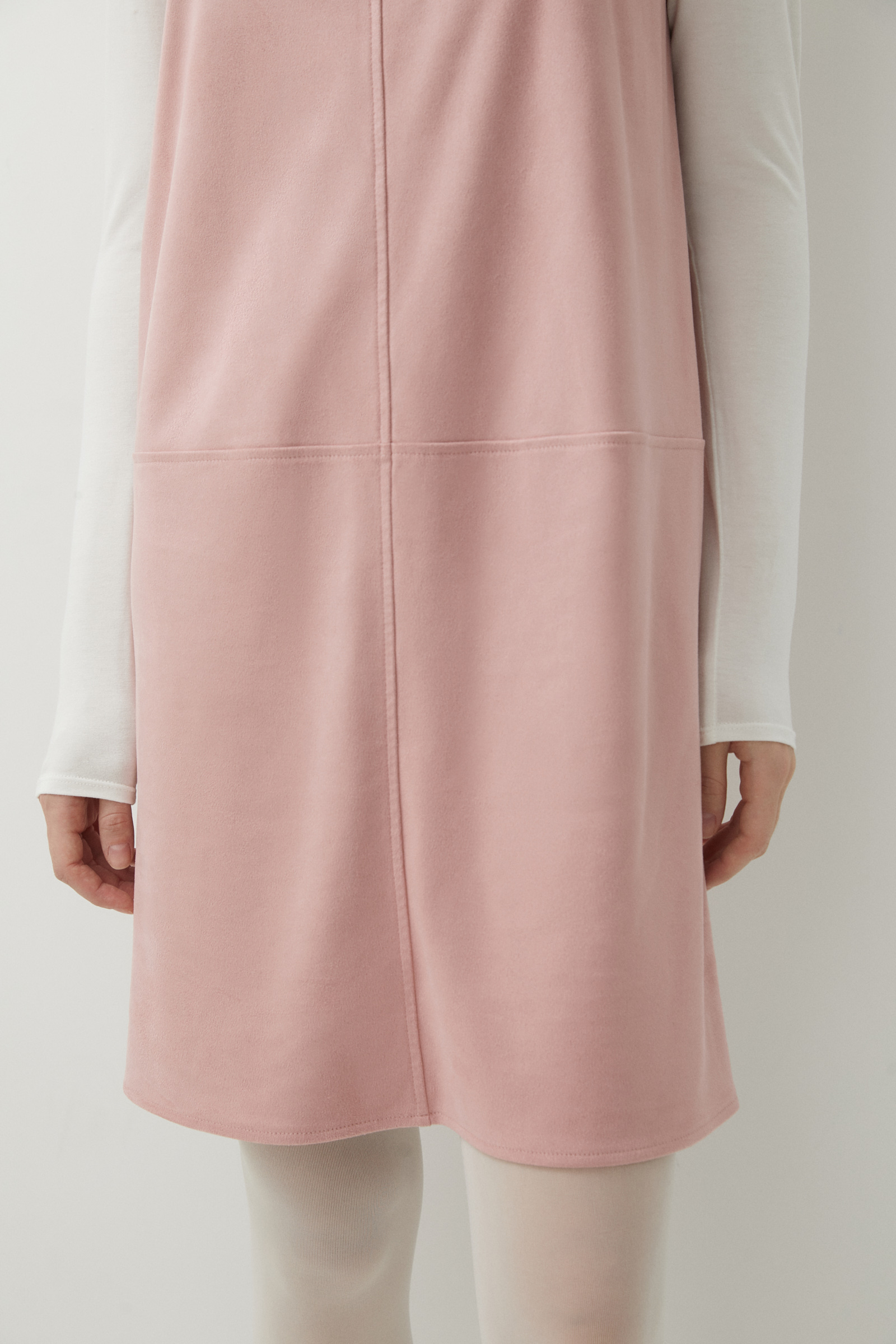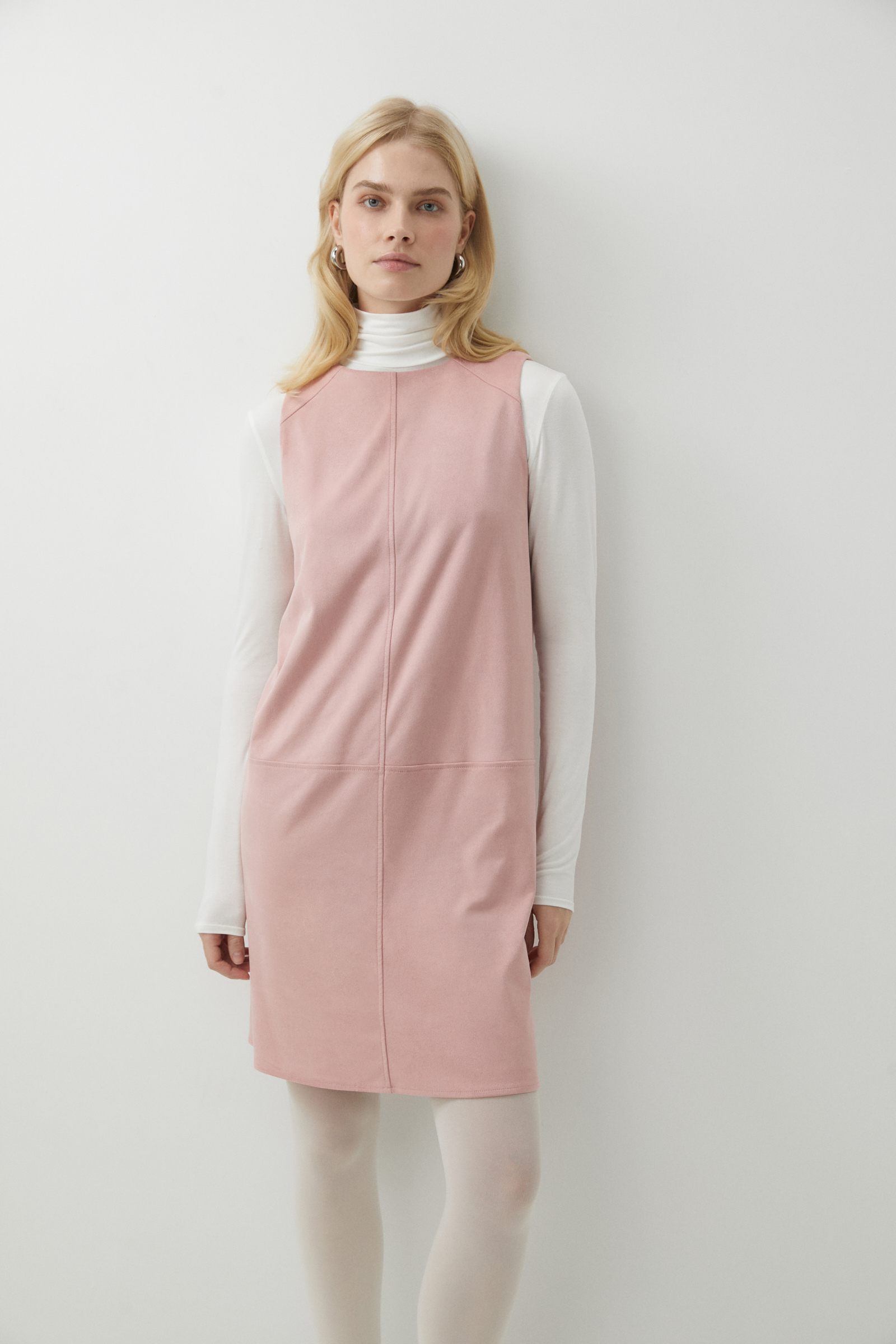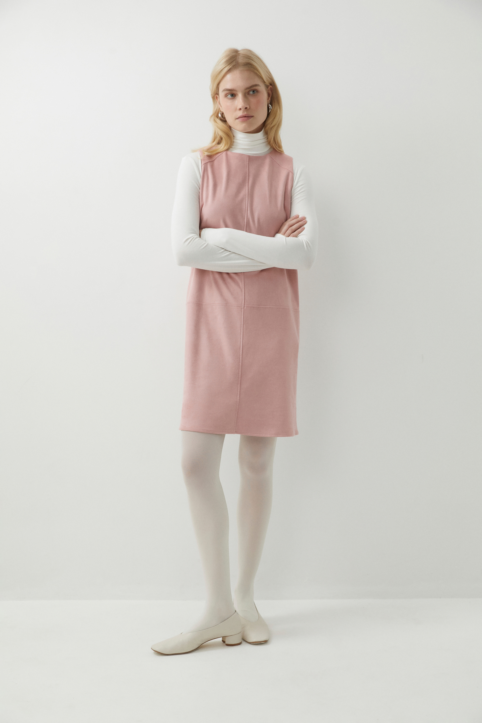Элегантное и лаконичное платье мини, с круглой горловиной без рукавов. Платье силуэта трапеция с акцентными отстрочками. Застежка на потайную молнию в среднем шве спинки. Платье выполнено из мягкой и пластичной замши с ровным велюровым ворсом.