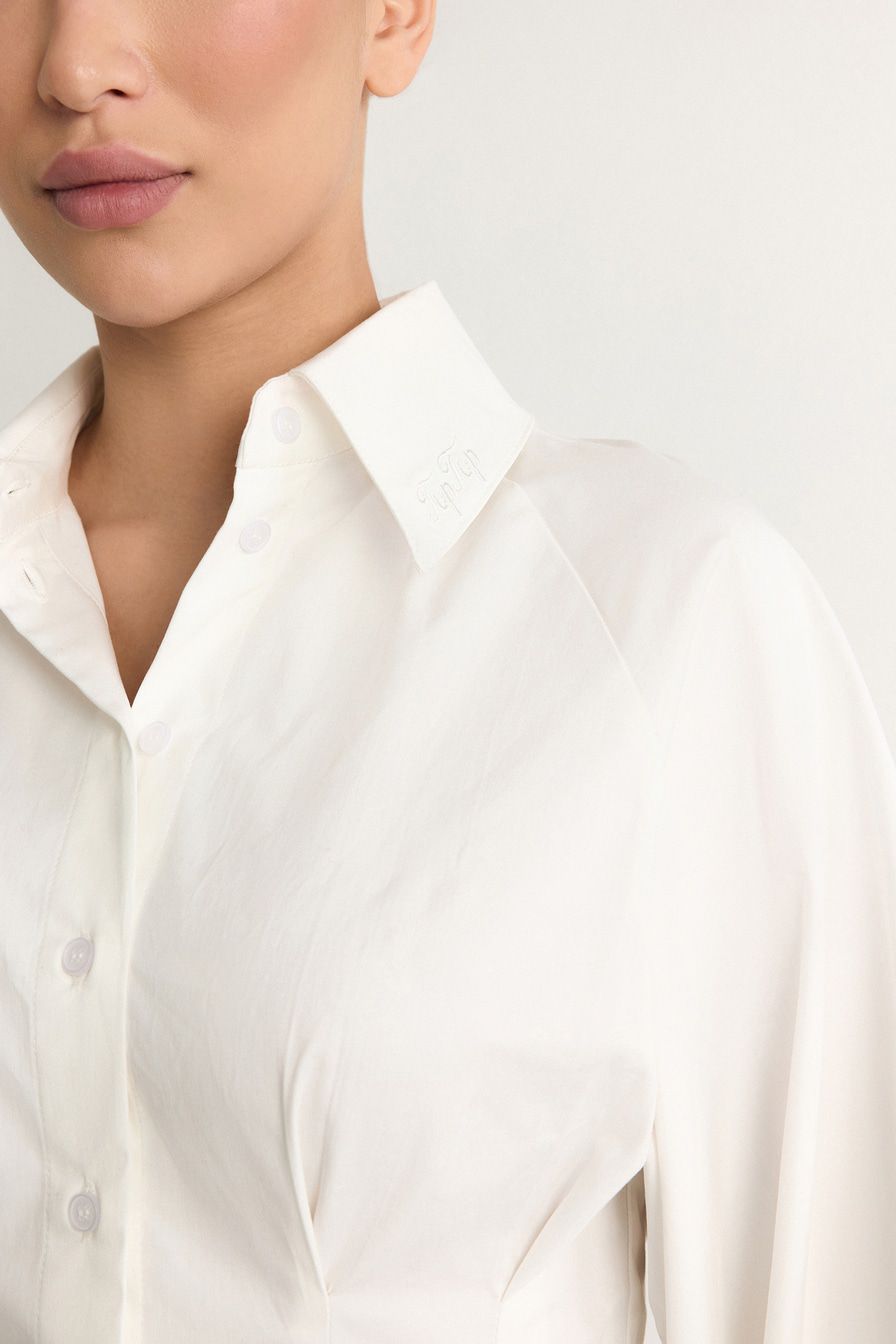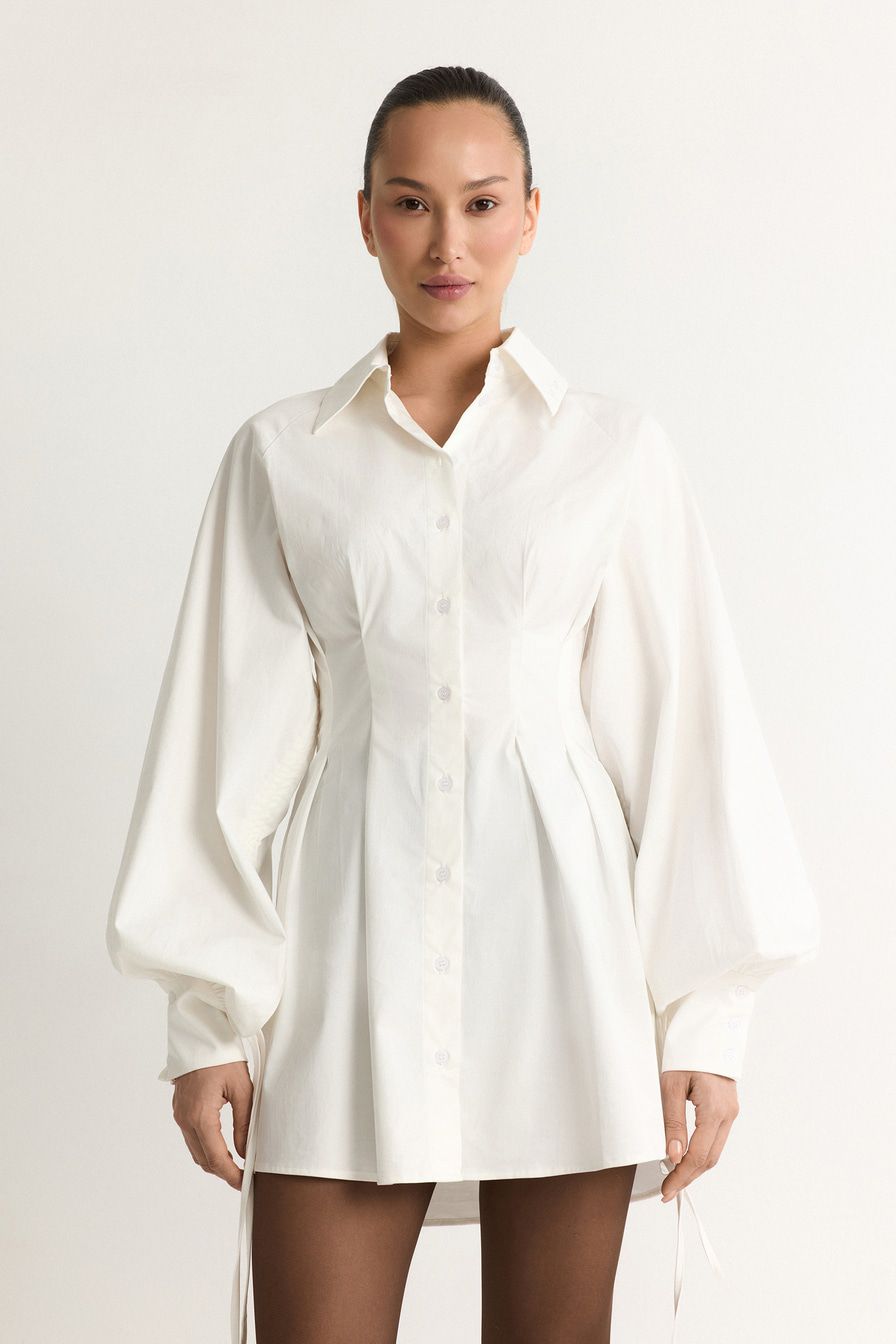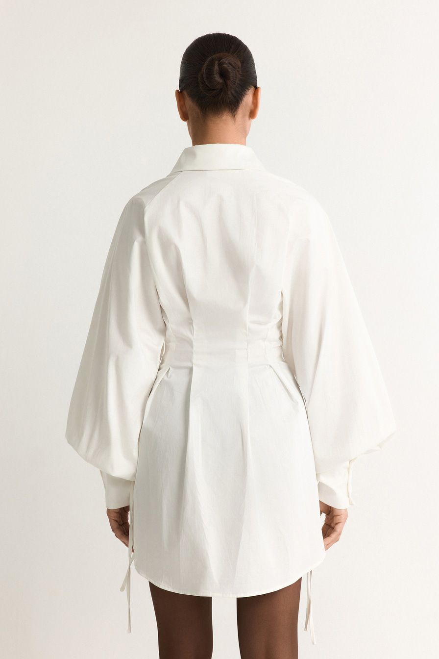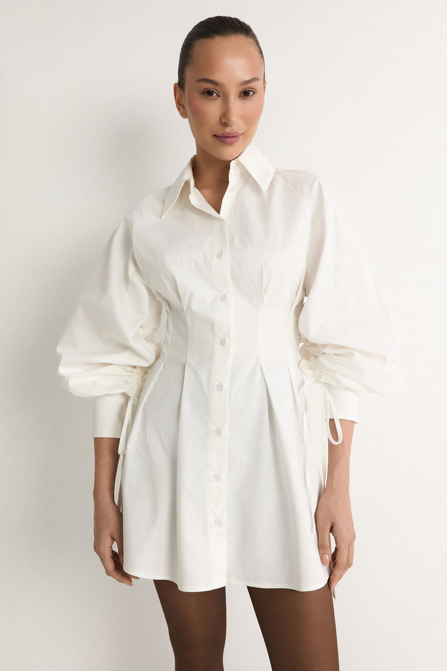 Белое платье-рубашка из смесового хлопка – модель приталенного кроя. Платье дополнено защипами и объемными рукавами с кулисками.