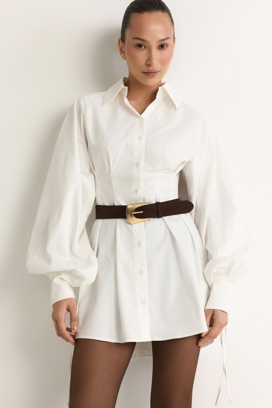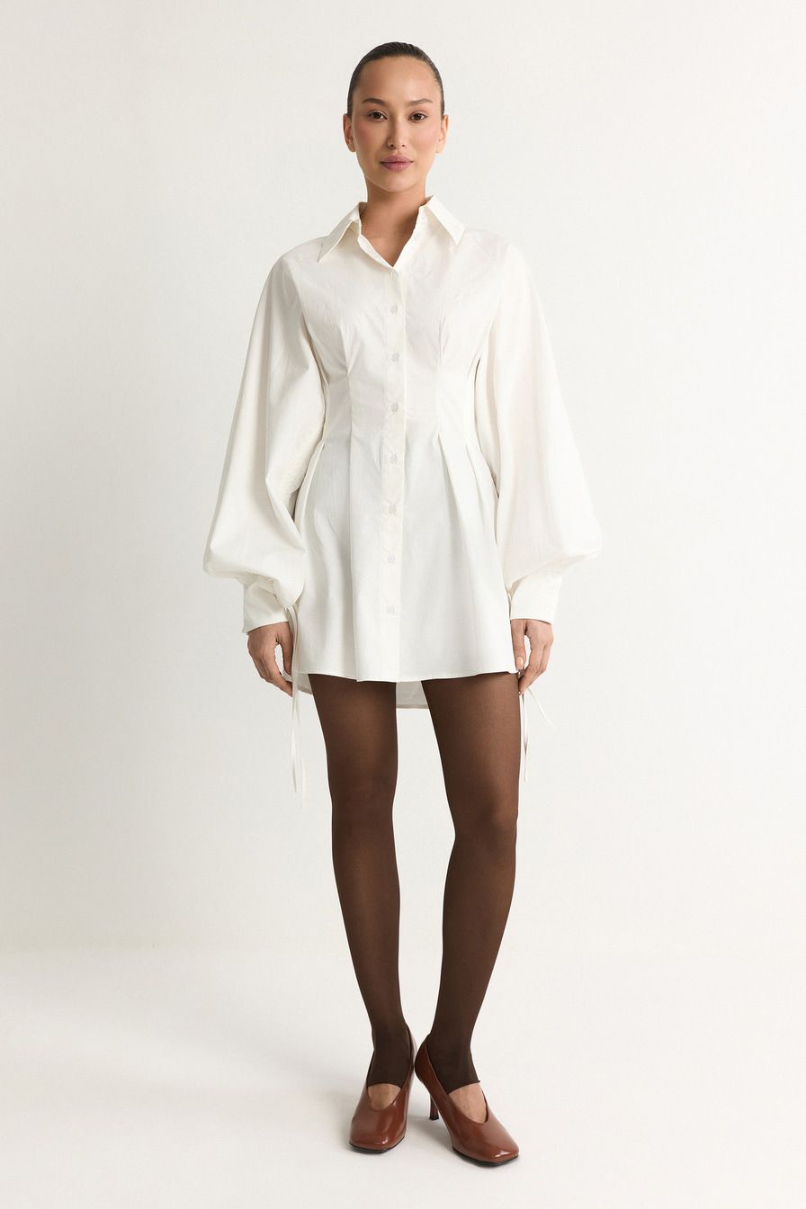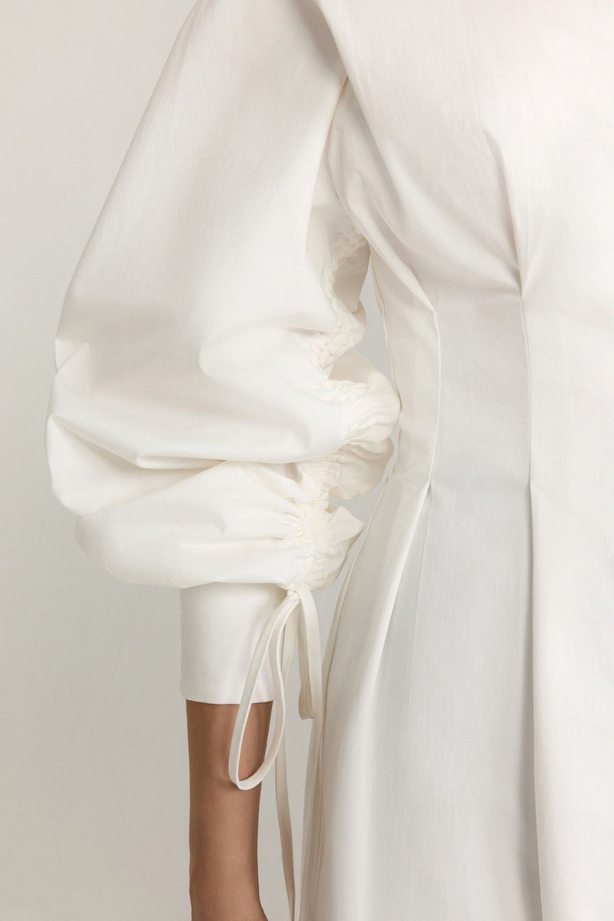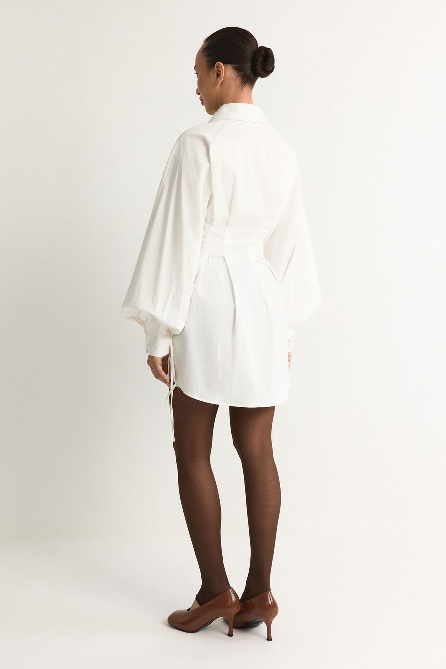 Белое платье-рубашка из смесового хлопка – модель приталенного кроя. Платье дополнено защипами и объемными рукавами с кулисками.