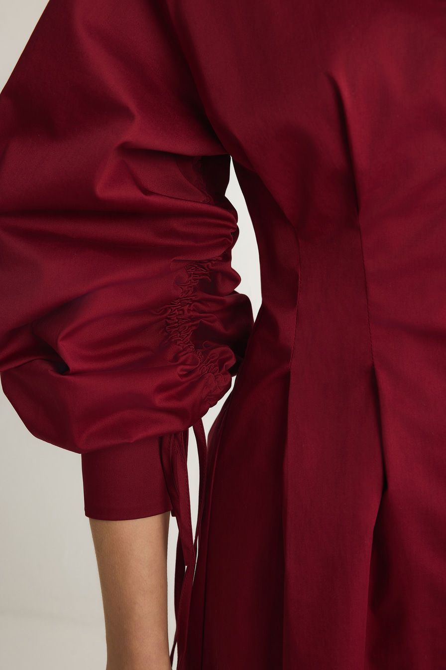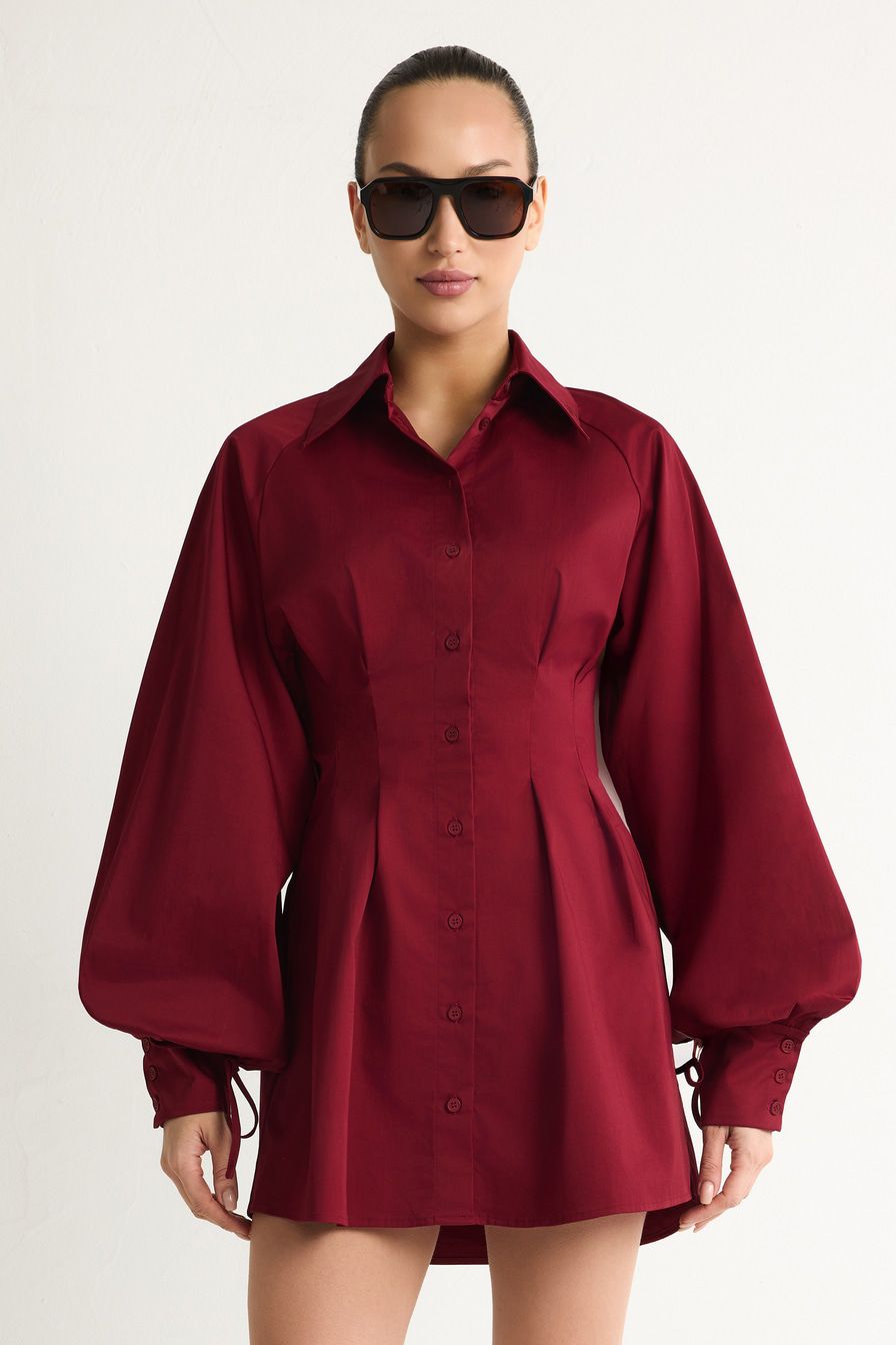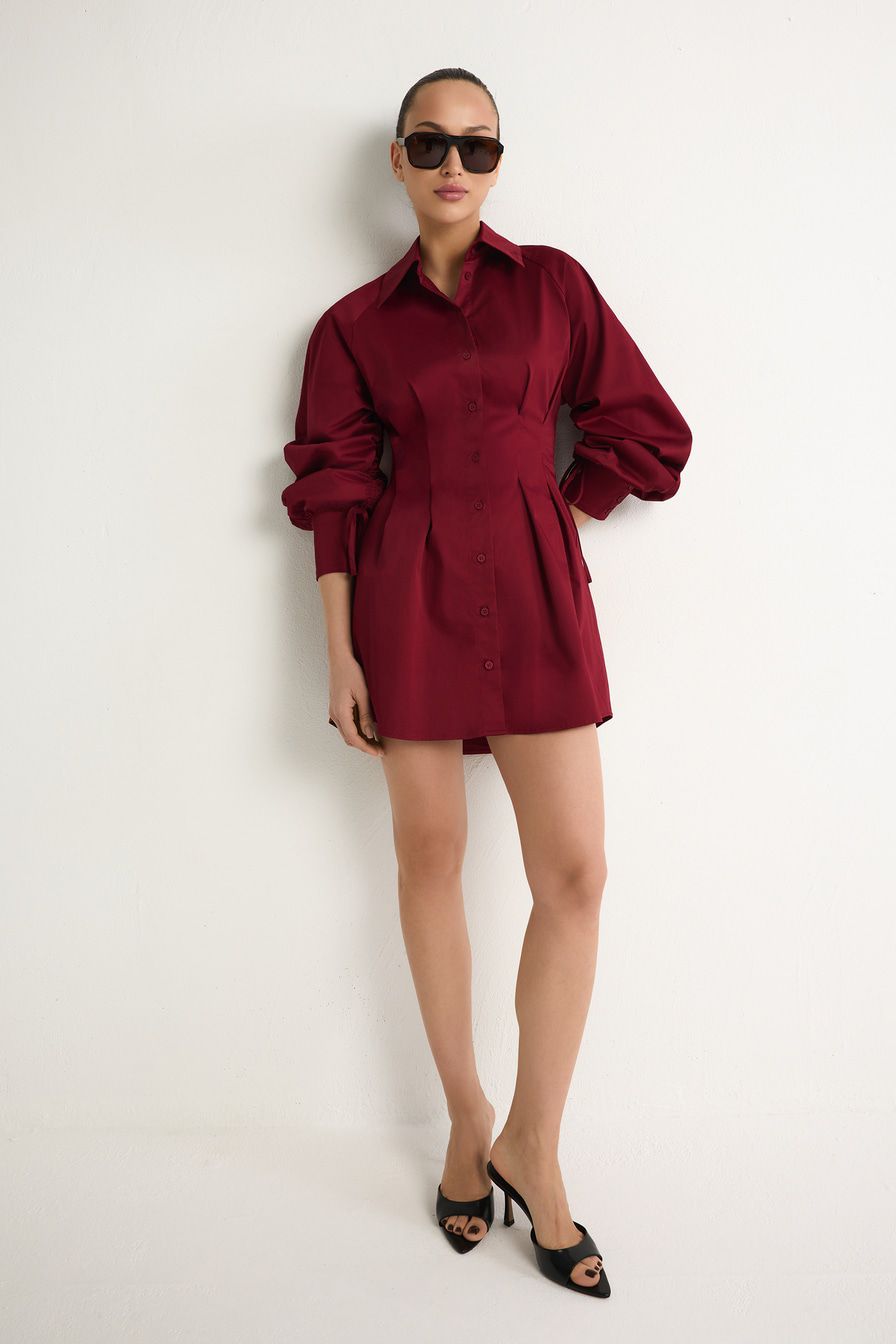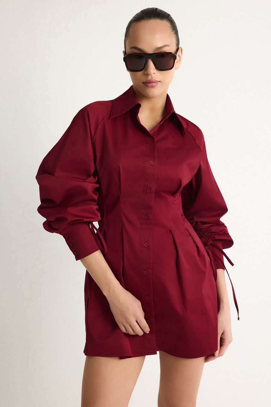 Бордовое платье-рубашка из смесового хлопка – модель приталенного кроя. Платье дополнено защипами и объемными рукавами с кулисками.
