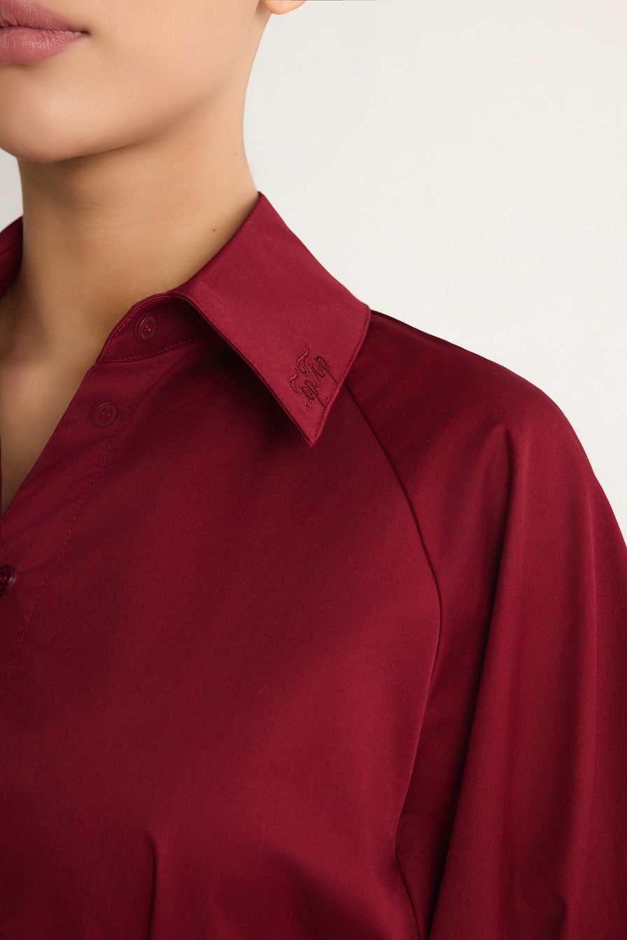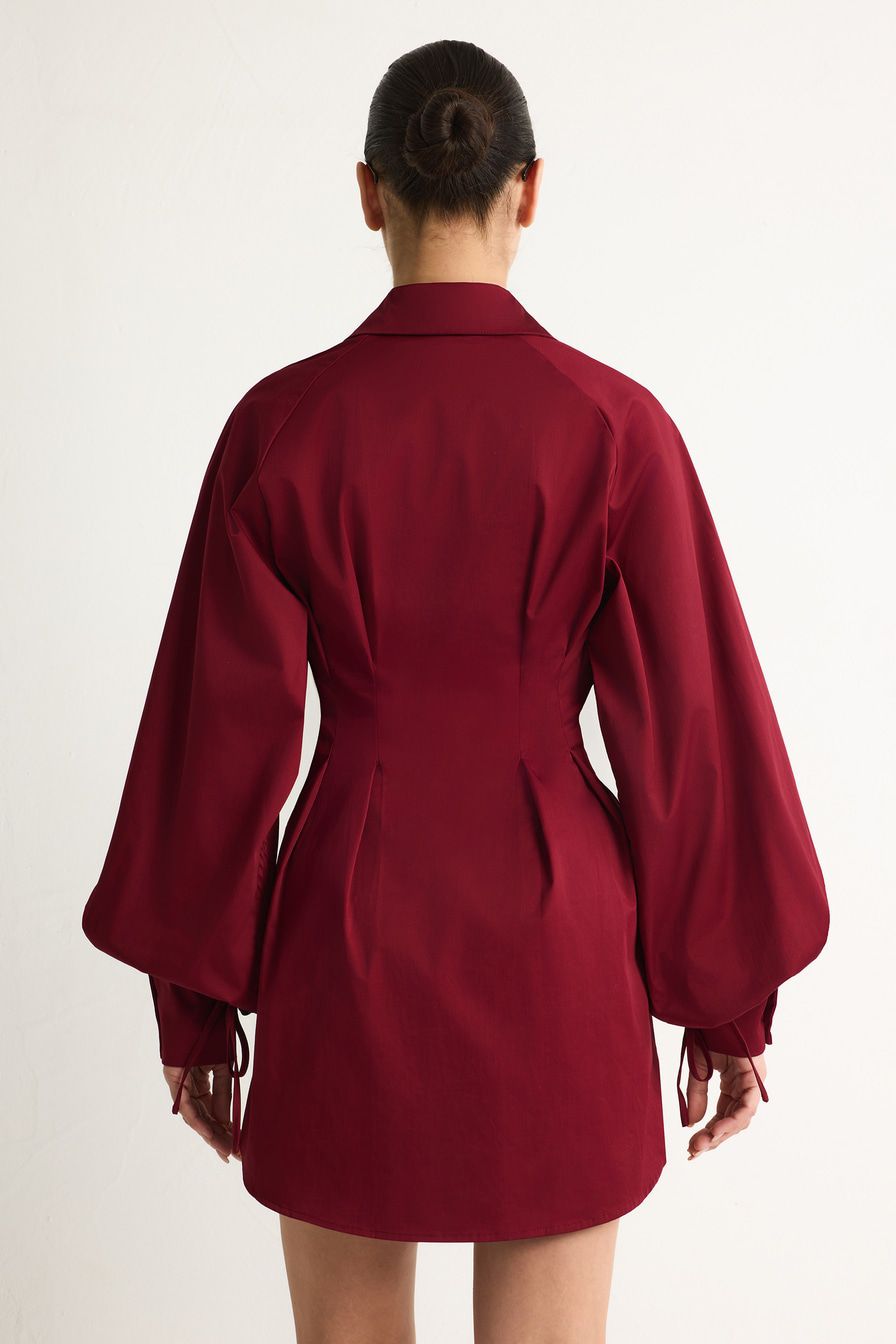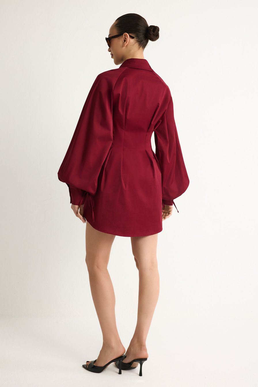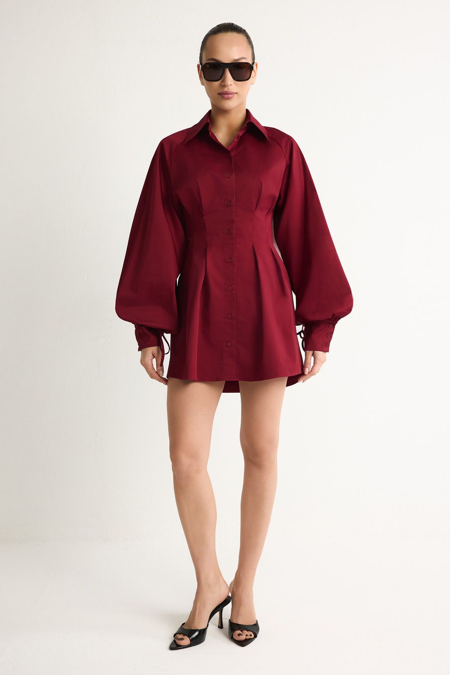 Бордовое платье-рубашка из смесового хлопка – модель приталенного кроя. Платье дополнено защипами и объемными рукавами с кулисками.
