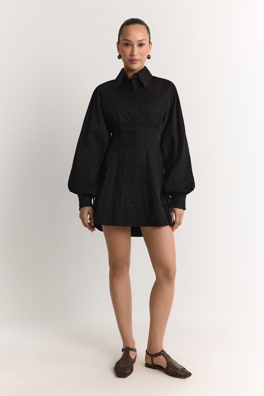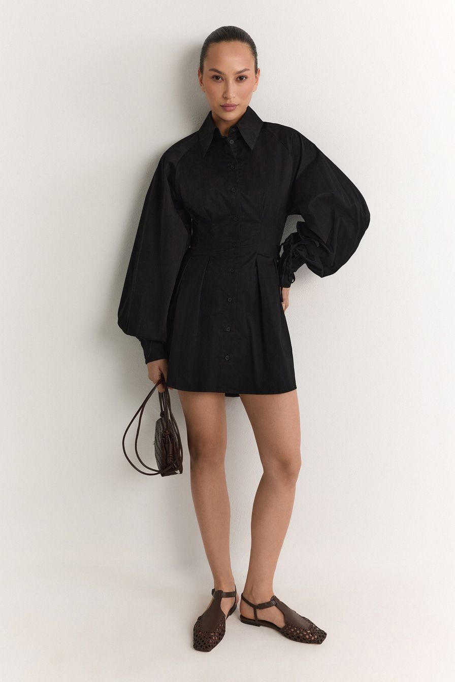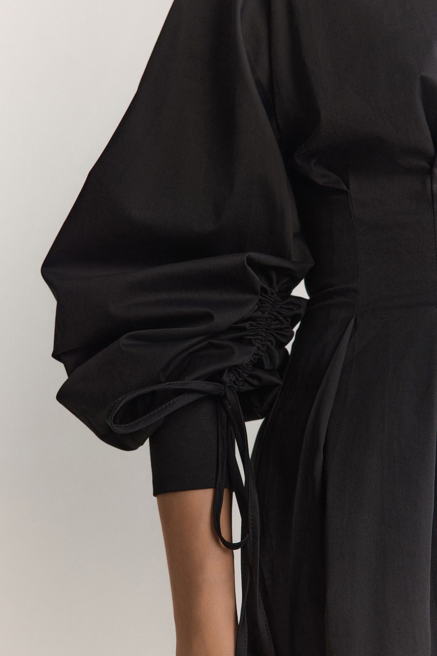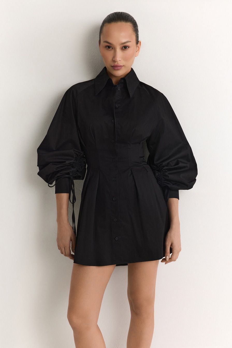Черное платье-рубашка из смесового хлопка – модель приталенного кроя. Платье дополнено защипами и объемными рукавами с кулисками.