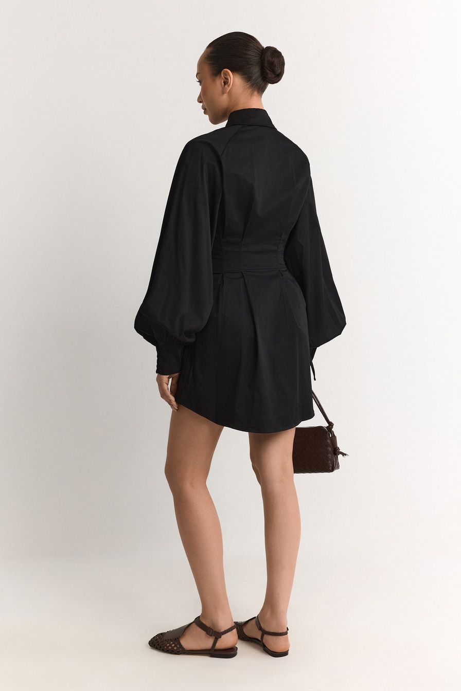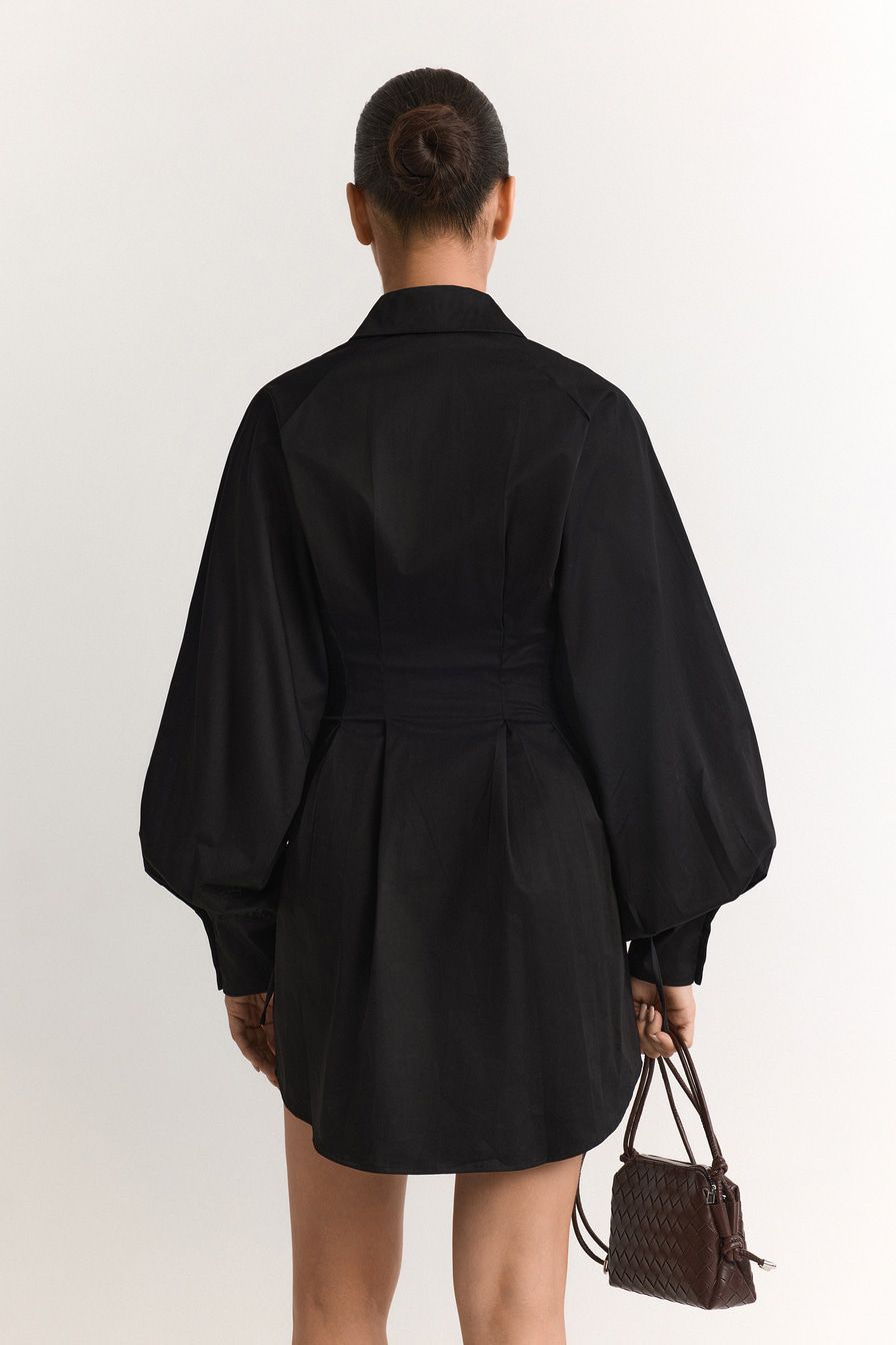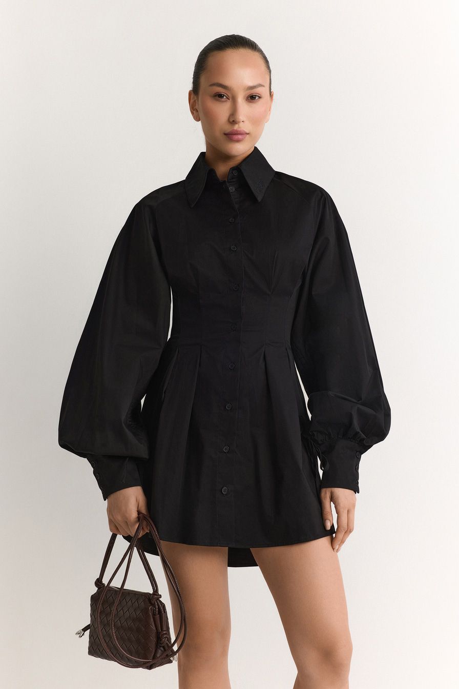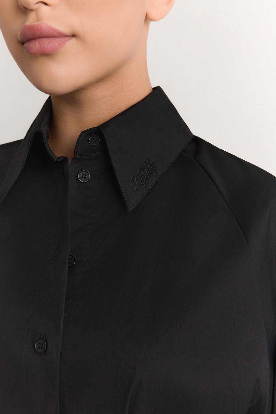 Черное платье-рубашка из смесового хлопка – модель приталенного кроя. Платье дополнено защипами и объемными рукавами с кулисками.