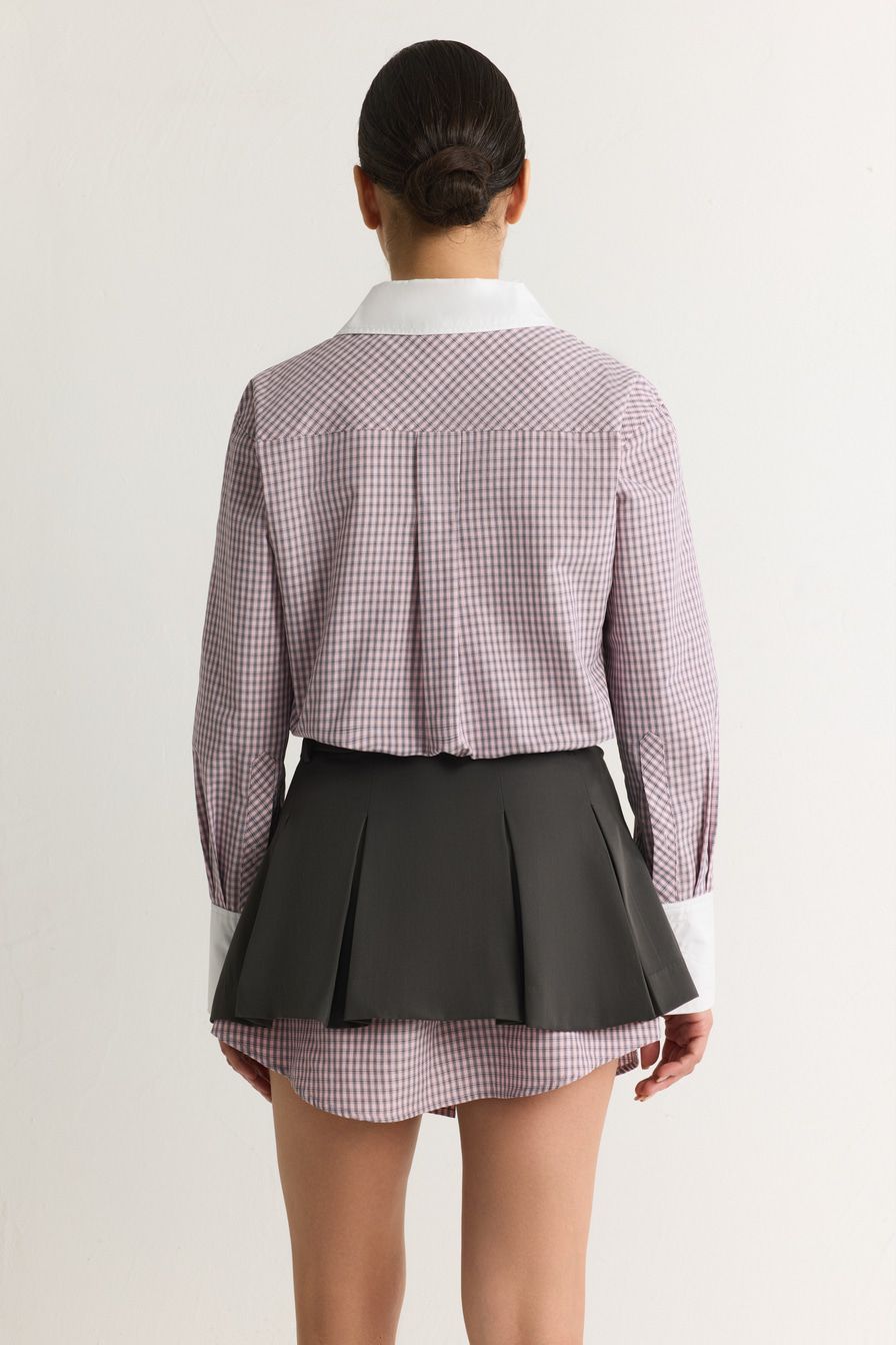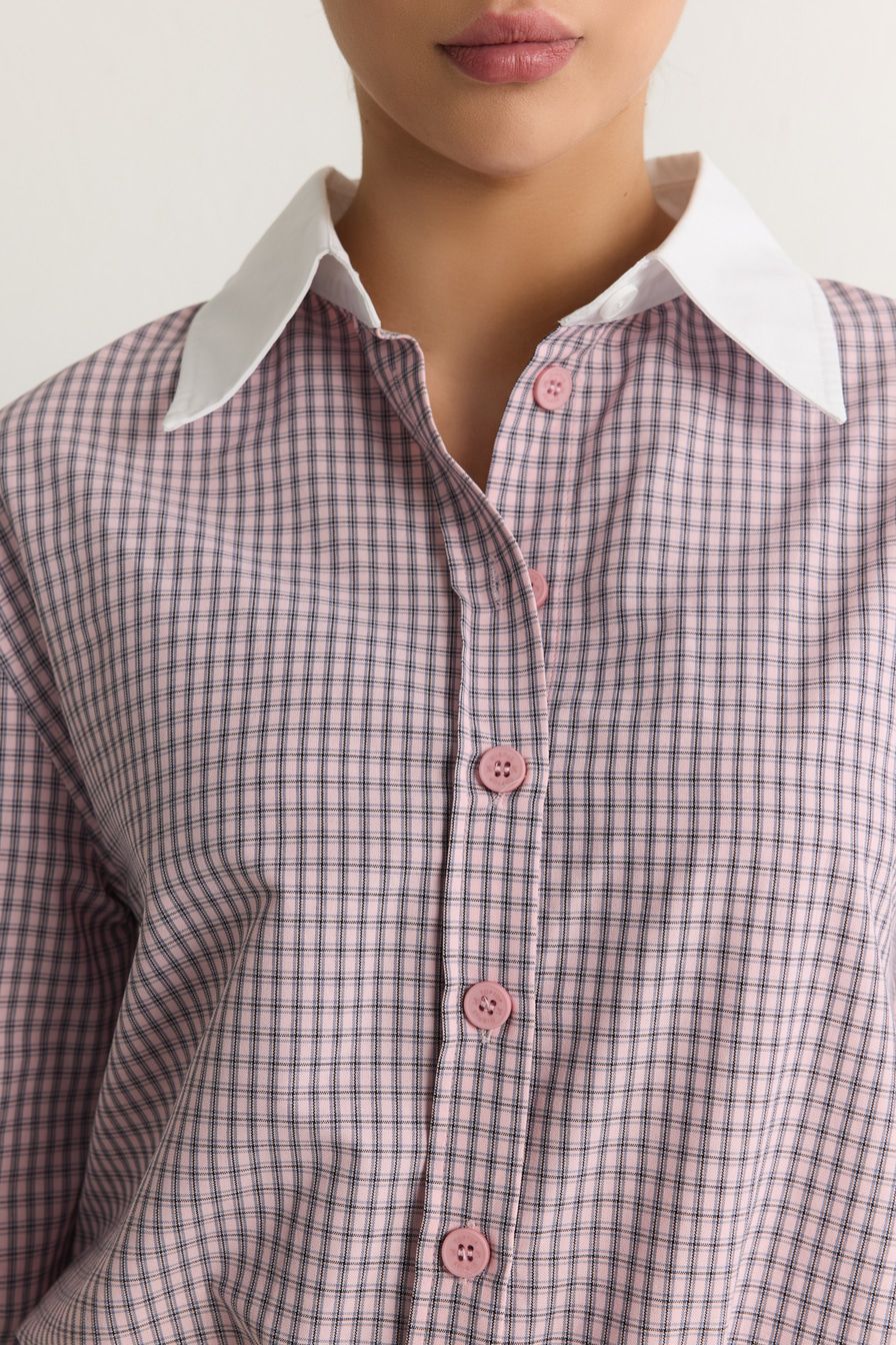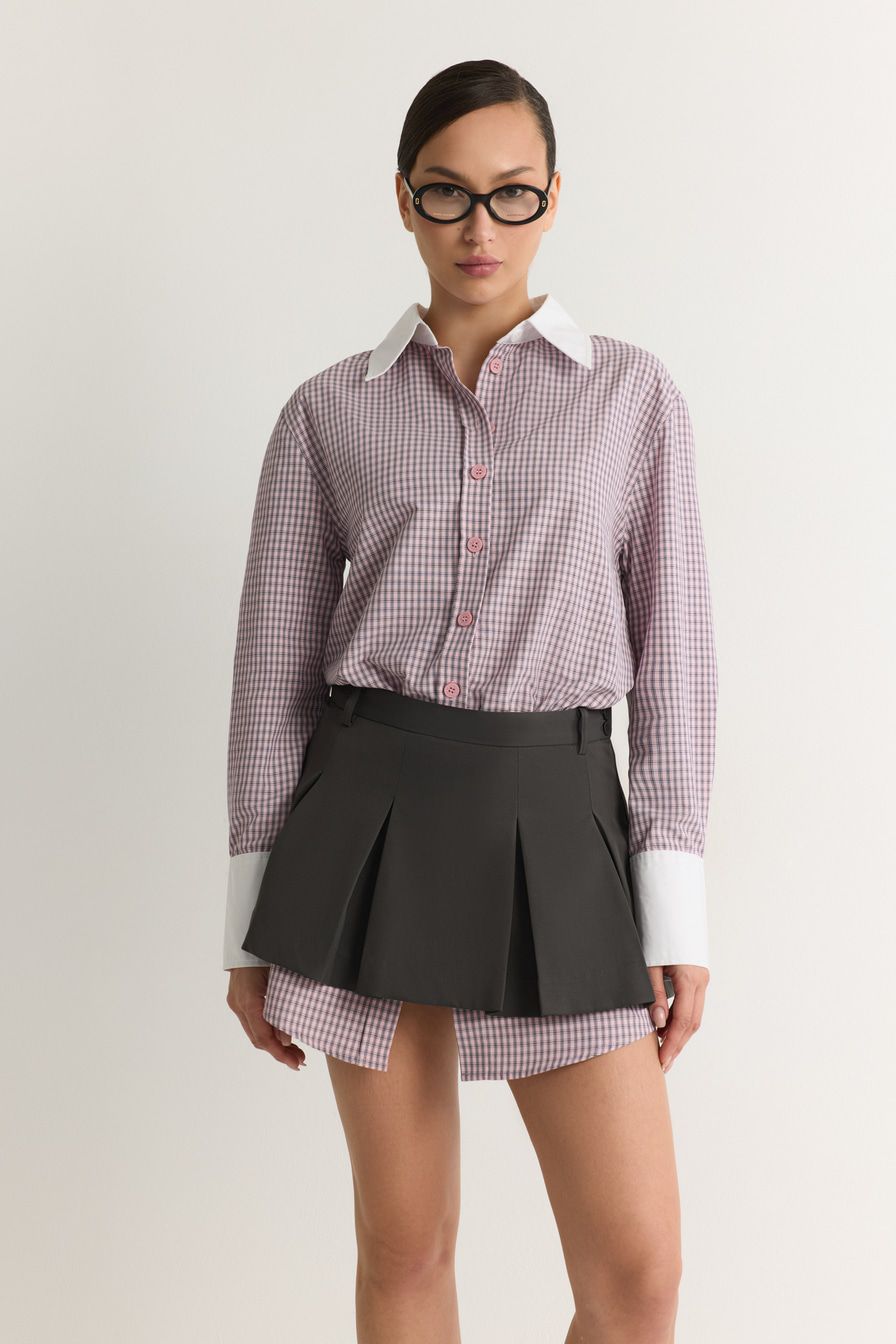 Платье-рубашка из смесового хлопка – модель свободного кроя. Платье декорировано принтом «клетка» и дополнено юбкой-баской со встречными складками.