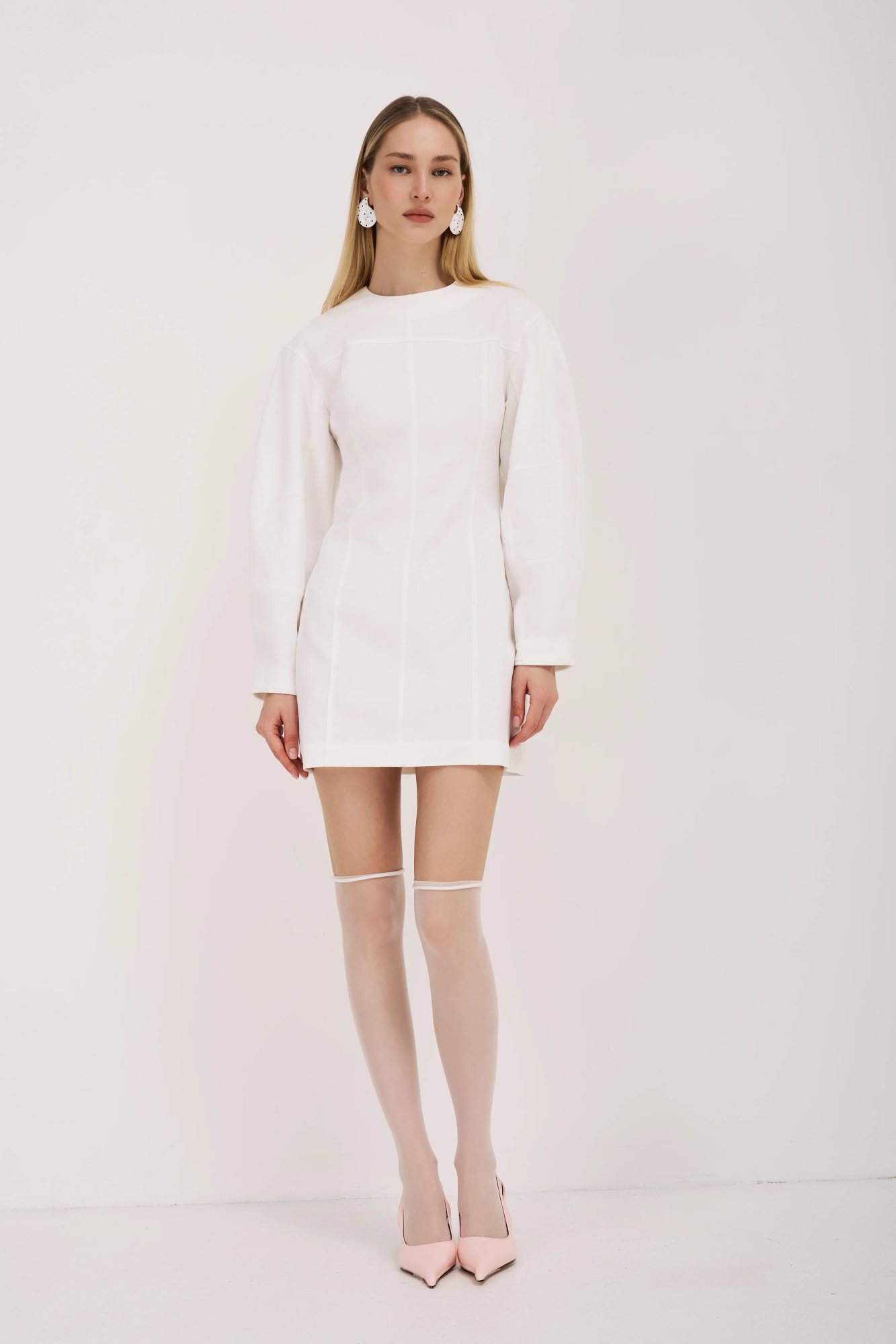 Свободный силуэт с О-образной линией плеч придаёт платью изящность и женственность. Длина мини подчёркивает ноги и добавляет динамичности образу.