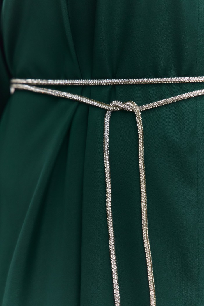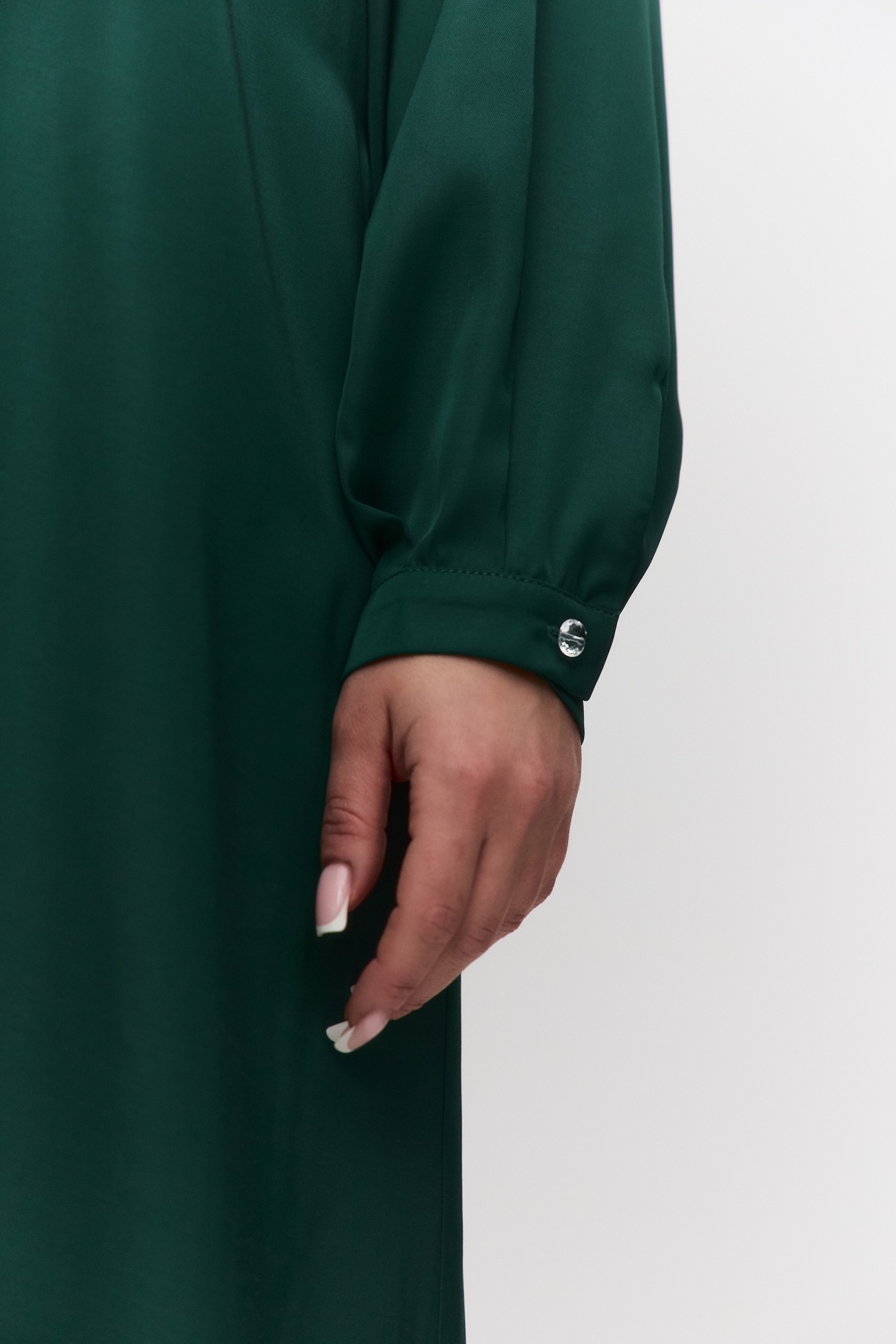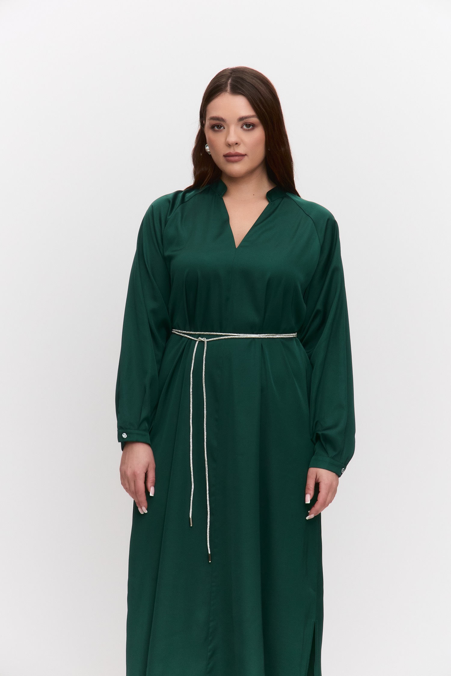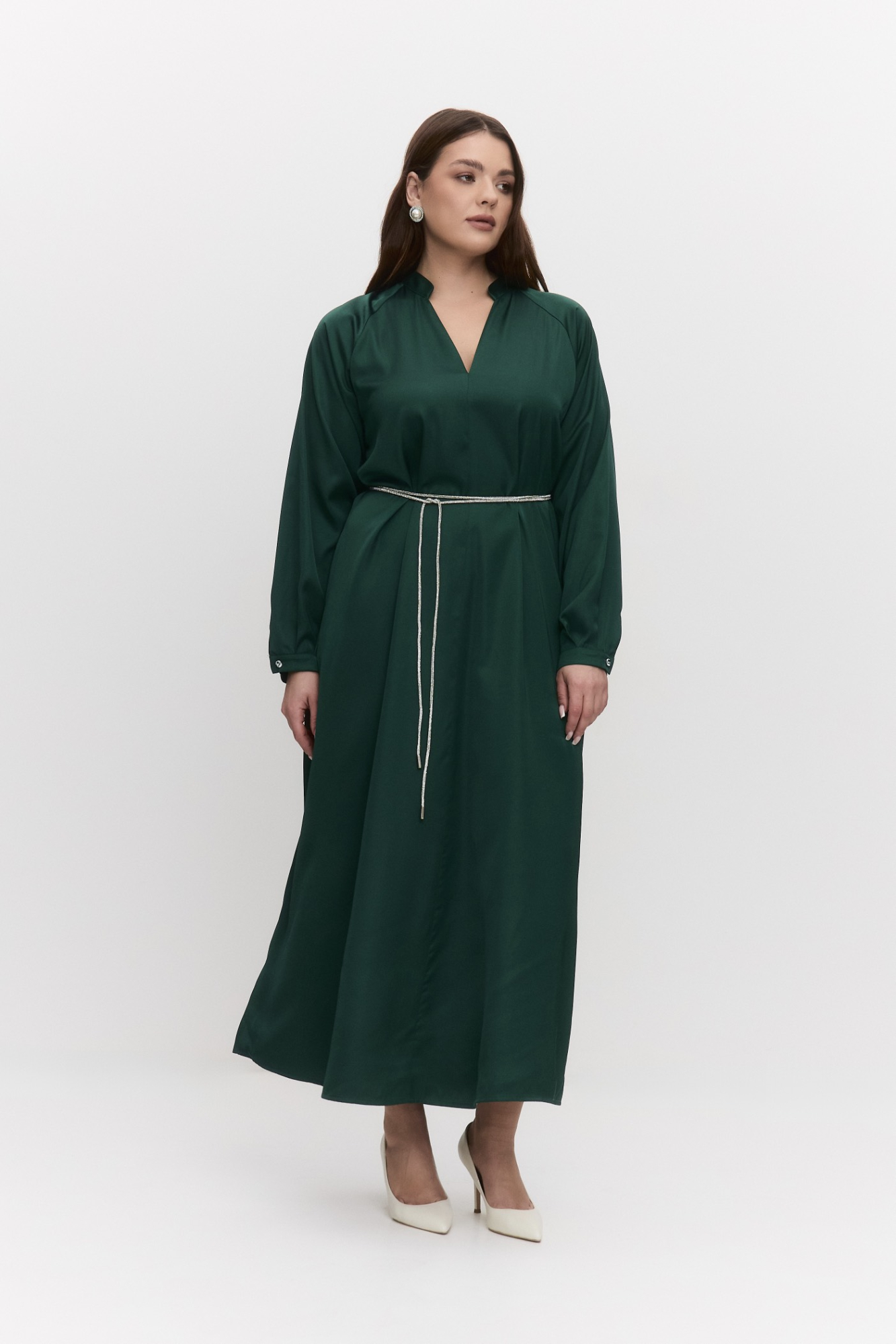 Струящееся платье трапециевидного силуэта с длинными рукавами. Острый V-образный вырез визуально вытягивает шею и зону декольте. Акцентный пояс, декорированный стразами, позволяет подчеркнуть линию талии. Отличный выбор для офиса, деловых встреч, повседневных образов и торжественных мероприятий. Нужно лишь добавить к образу соответствующие обувь и аксессуары