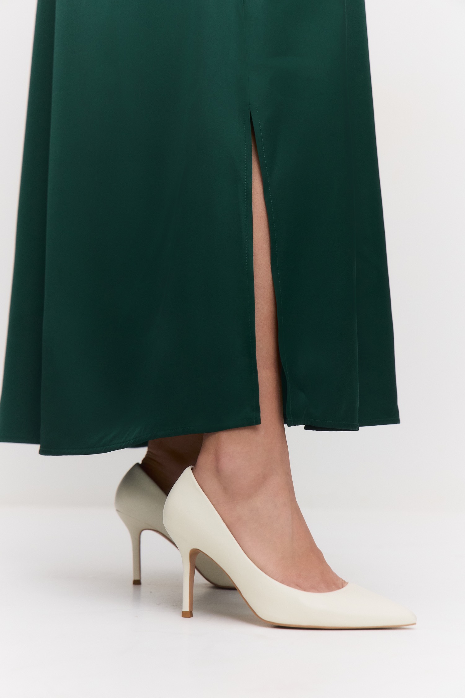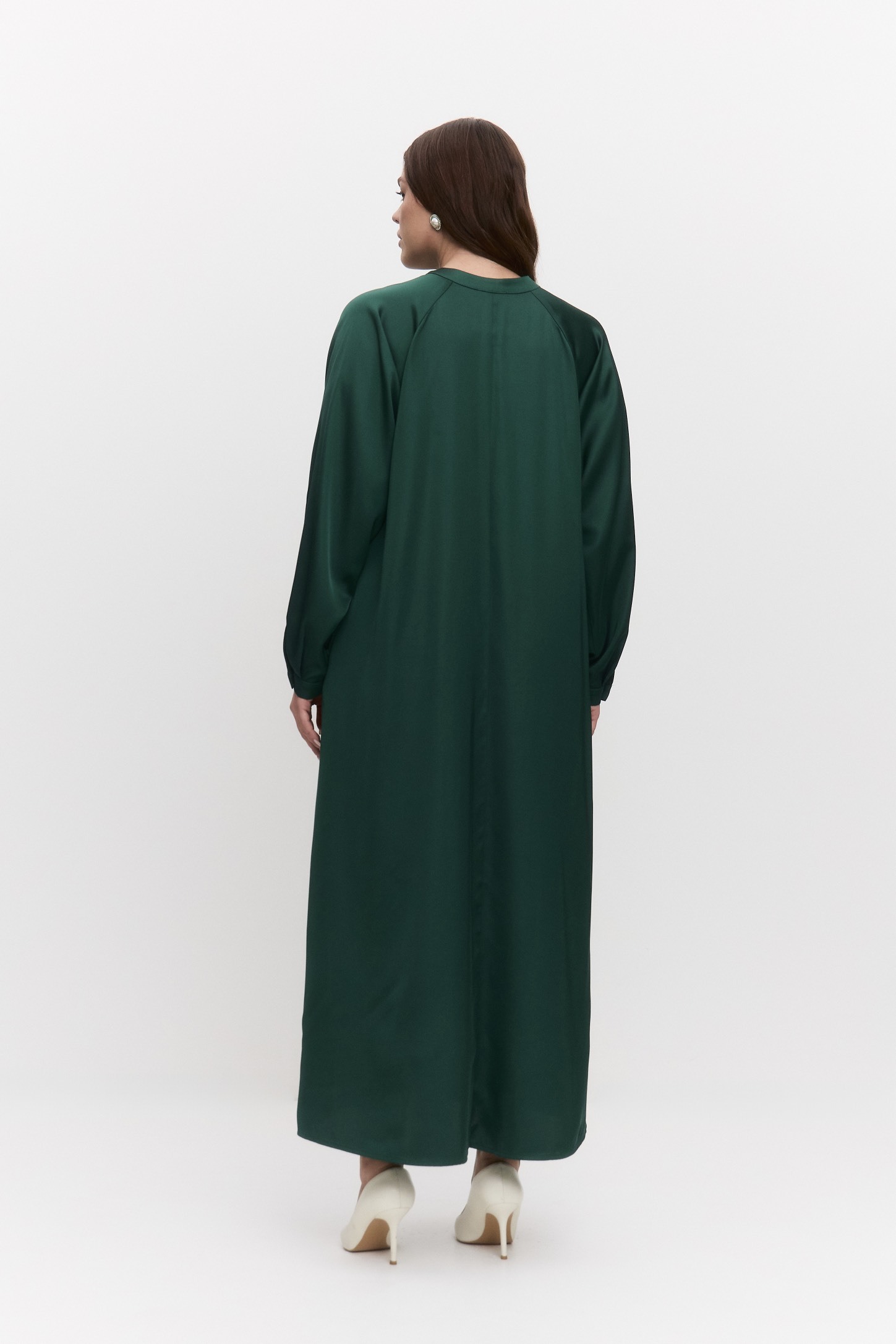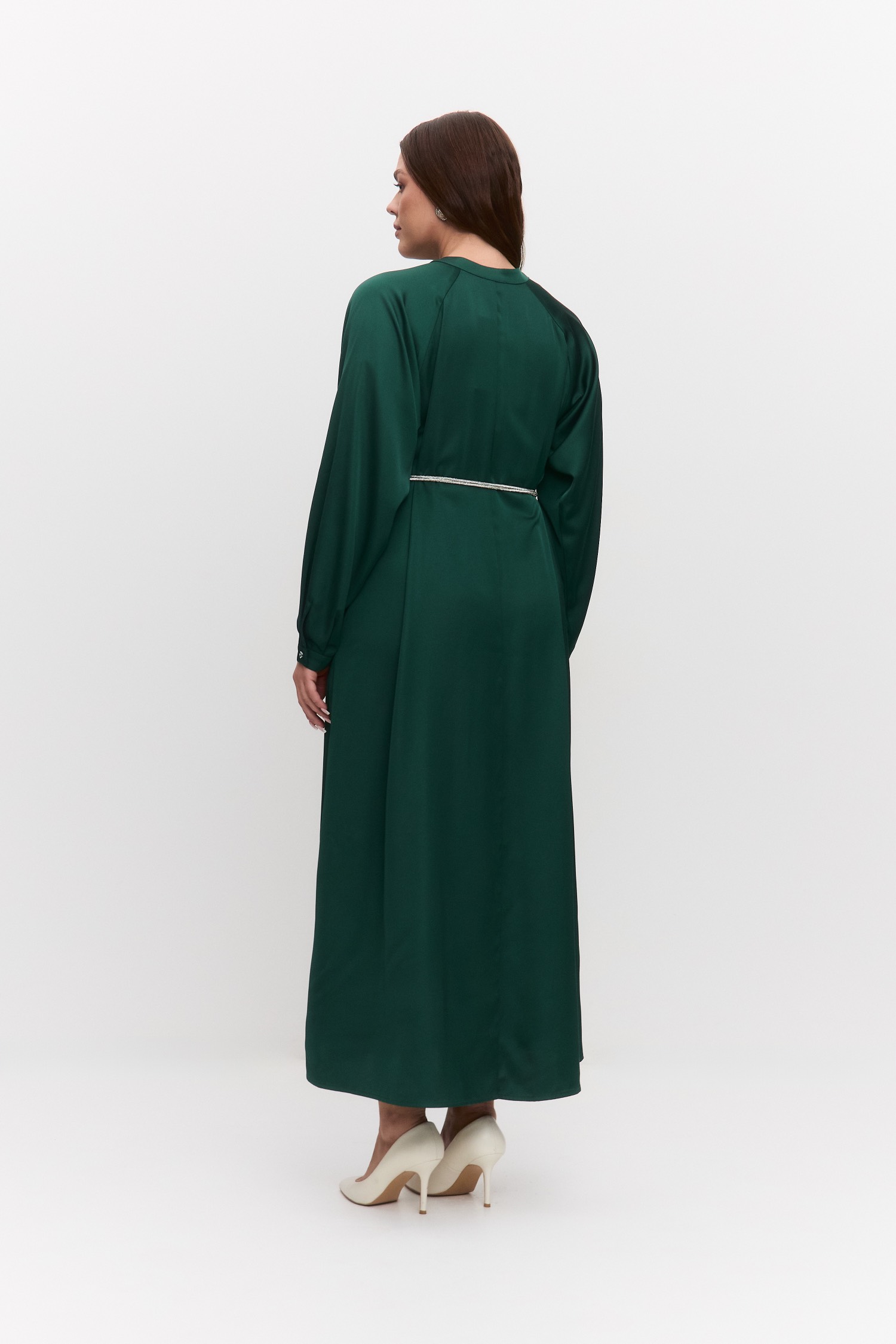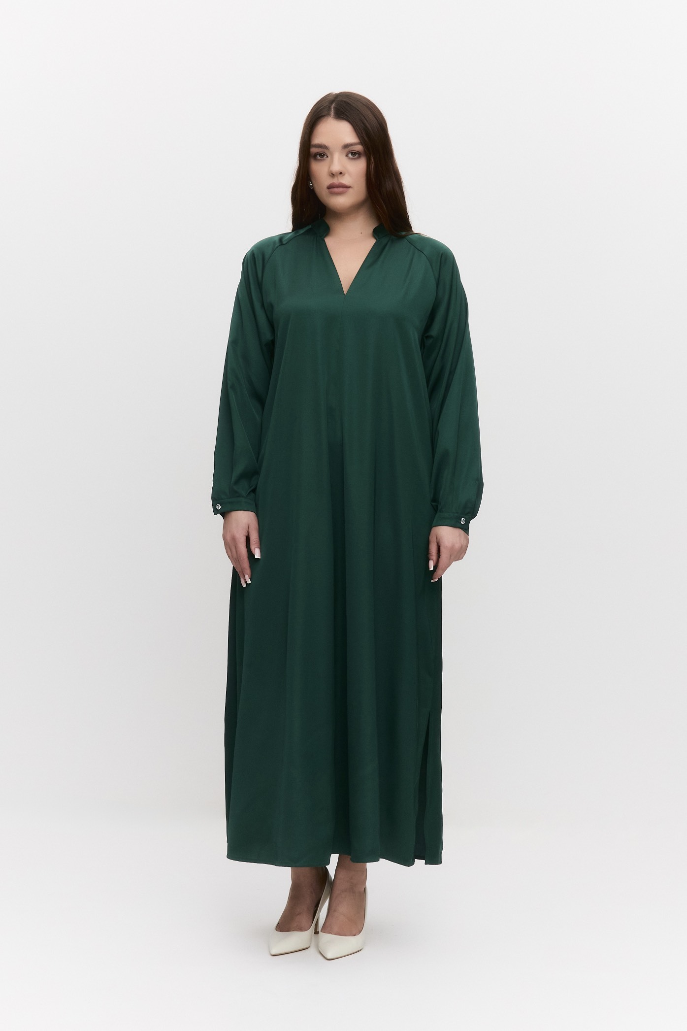 Струящееся платье трапециевидного силуэта с длинными рукавами. Острый V-образный вырез визуально вытягивает шею и зону декольте. Акцентный пояс, декорированный стразами, позволяет подчеркнуть линию талии. Отличный выбор для офиса, деловых встреч, повседневных образов и торжественных мероприятий. Нужно лишь добавить к образу соответствующие обувь и аксессуары