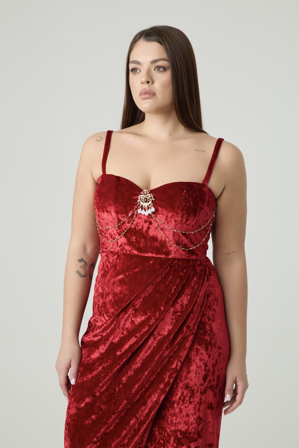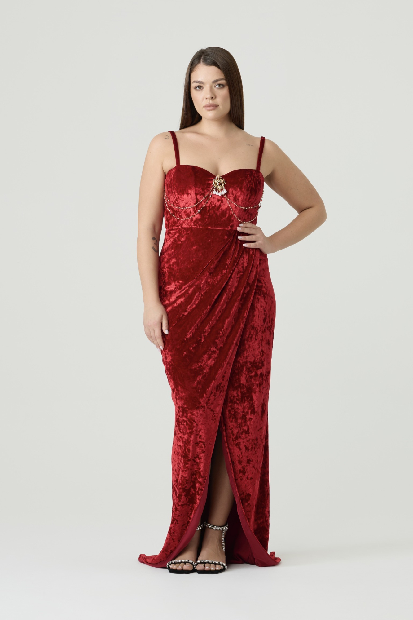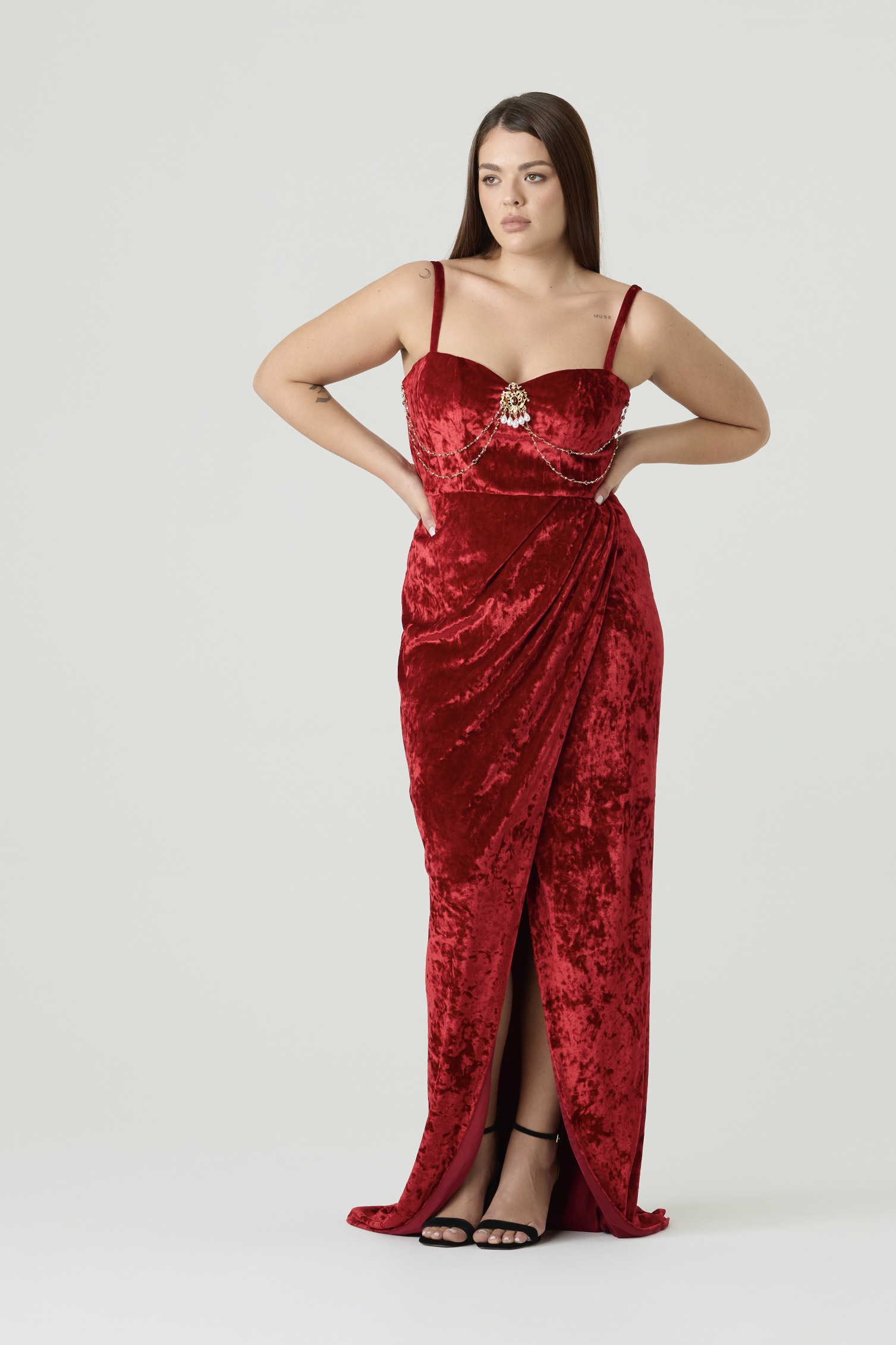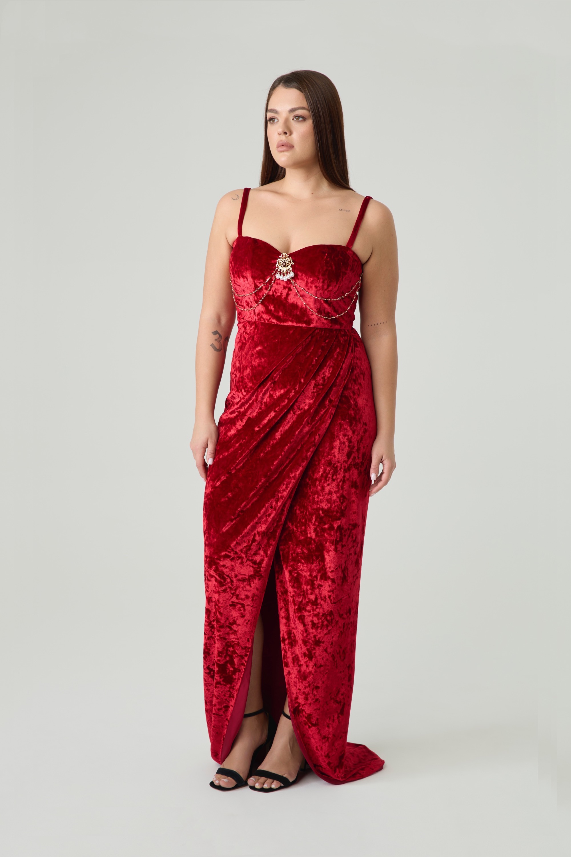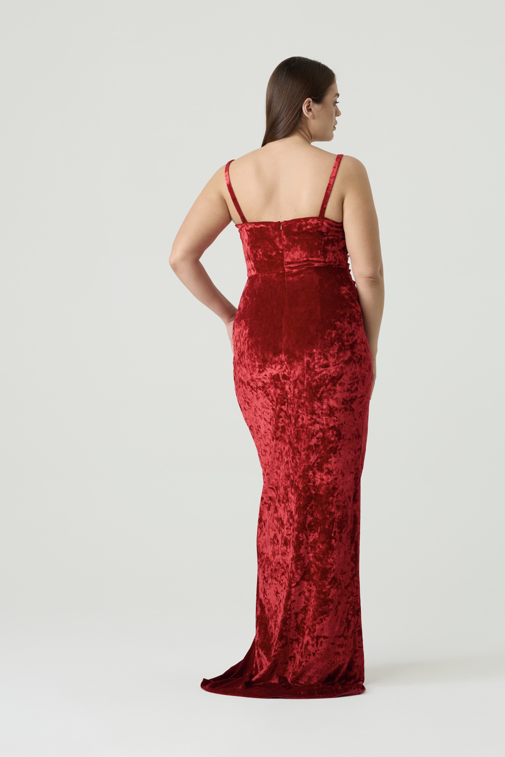 Вечернее платье красного цвета из бархатистой ткани с эффектом лёгкого блеска. Платье выполнено в облегающем силуэте длины макси с асимметричным разрезом