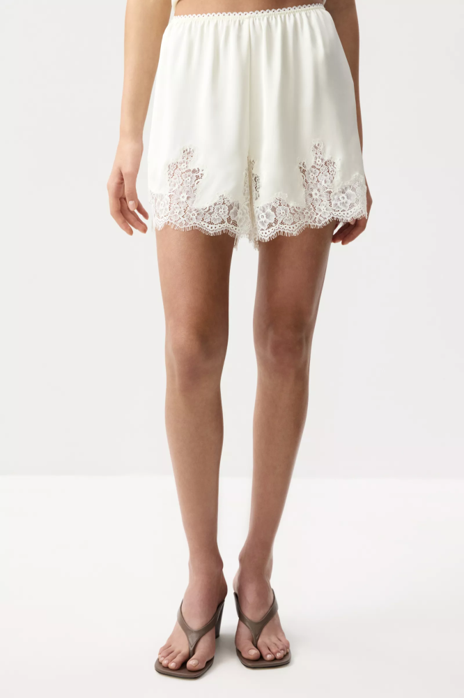 Сатиновые шорты с кружевной отделкой - легкая модель с акцентом на комфорт и изящные детали. Мягкий сатин красиво струится и приятно ощущается на коже. Эластичный пояс на резинке с фестонами аккуратно подчеркивает талию, обеспечивая комфортную посадку.