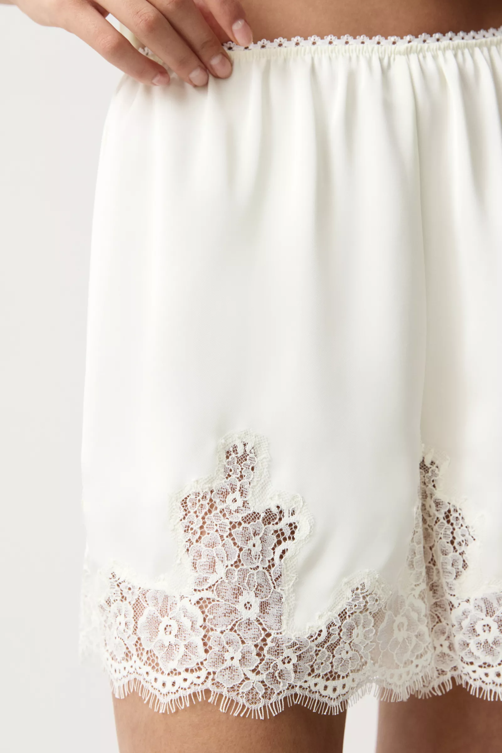 Сочетайте топами из идентичной ткани из нашей коллекции. Фигурное кружево по линии низа является акцентом этой модели, делая образ нежным и женственным.