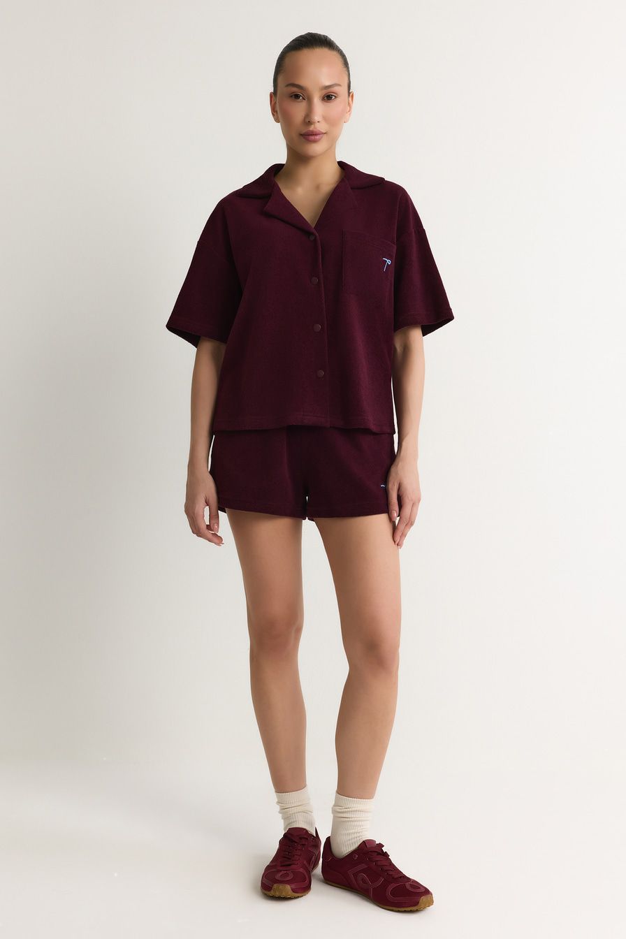 Махровые шорты из смесового хлопка – модель бордового цвета. Шорты дополнены резинкой на поясе и контрастной вышивкой в виде логотипа бренда.