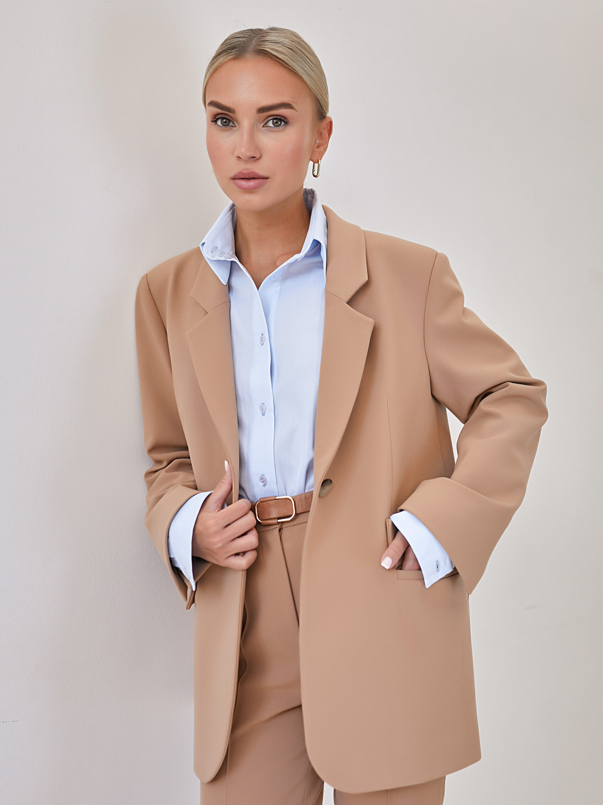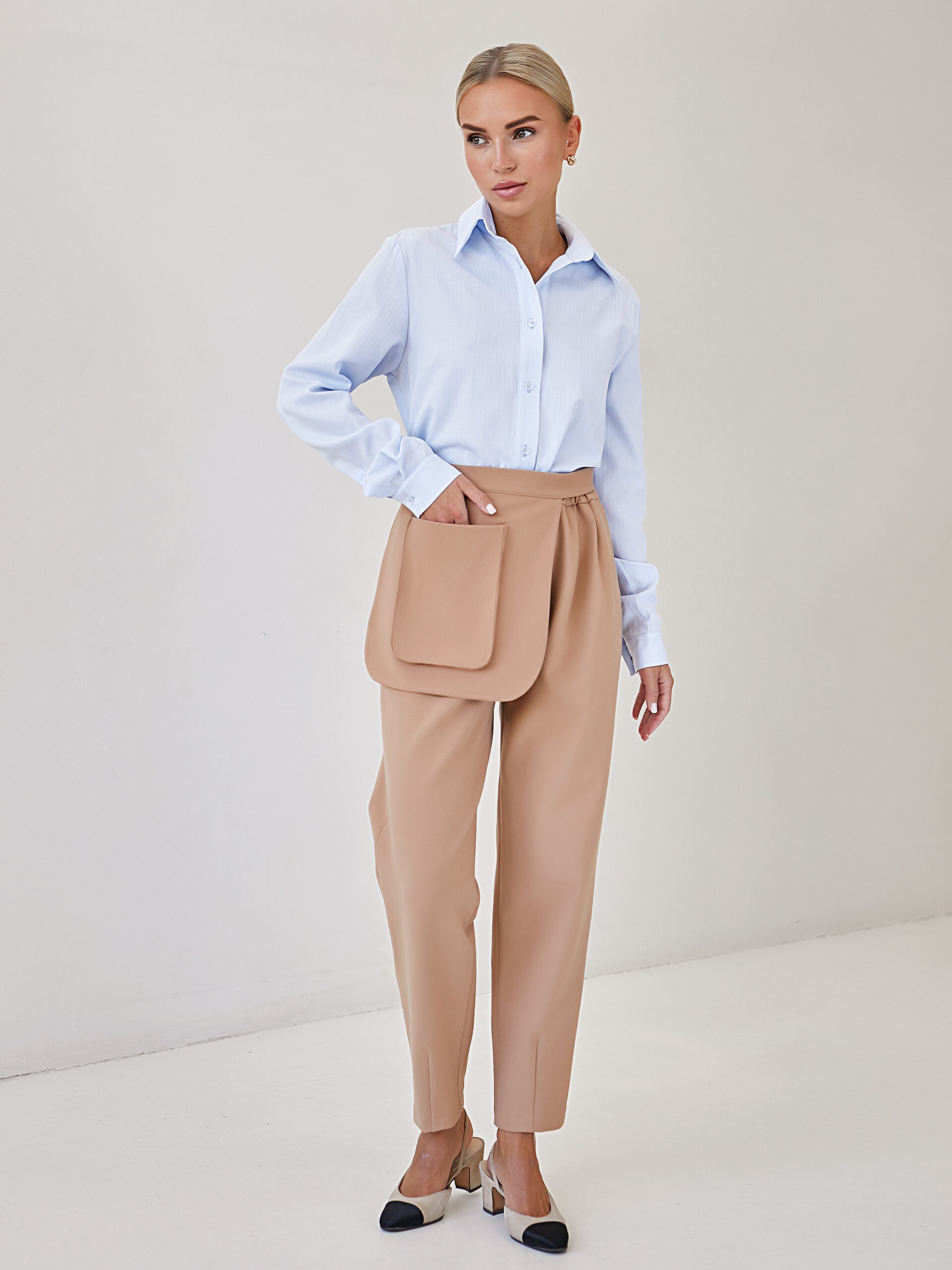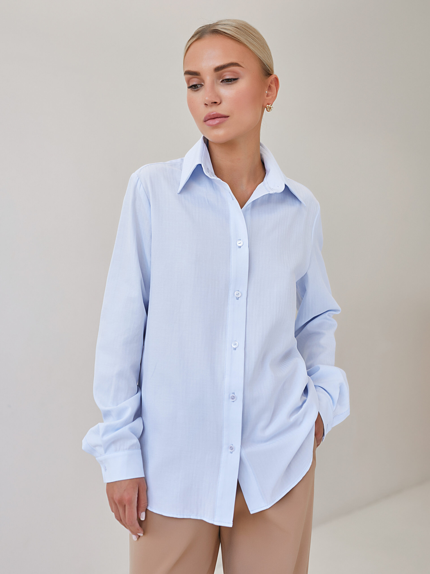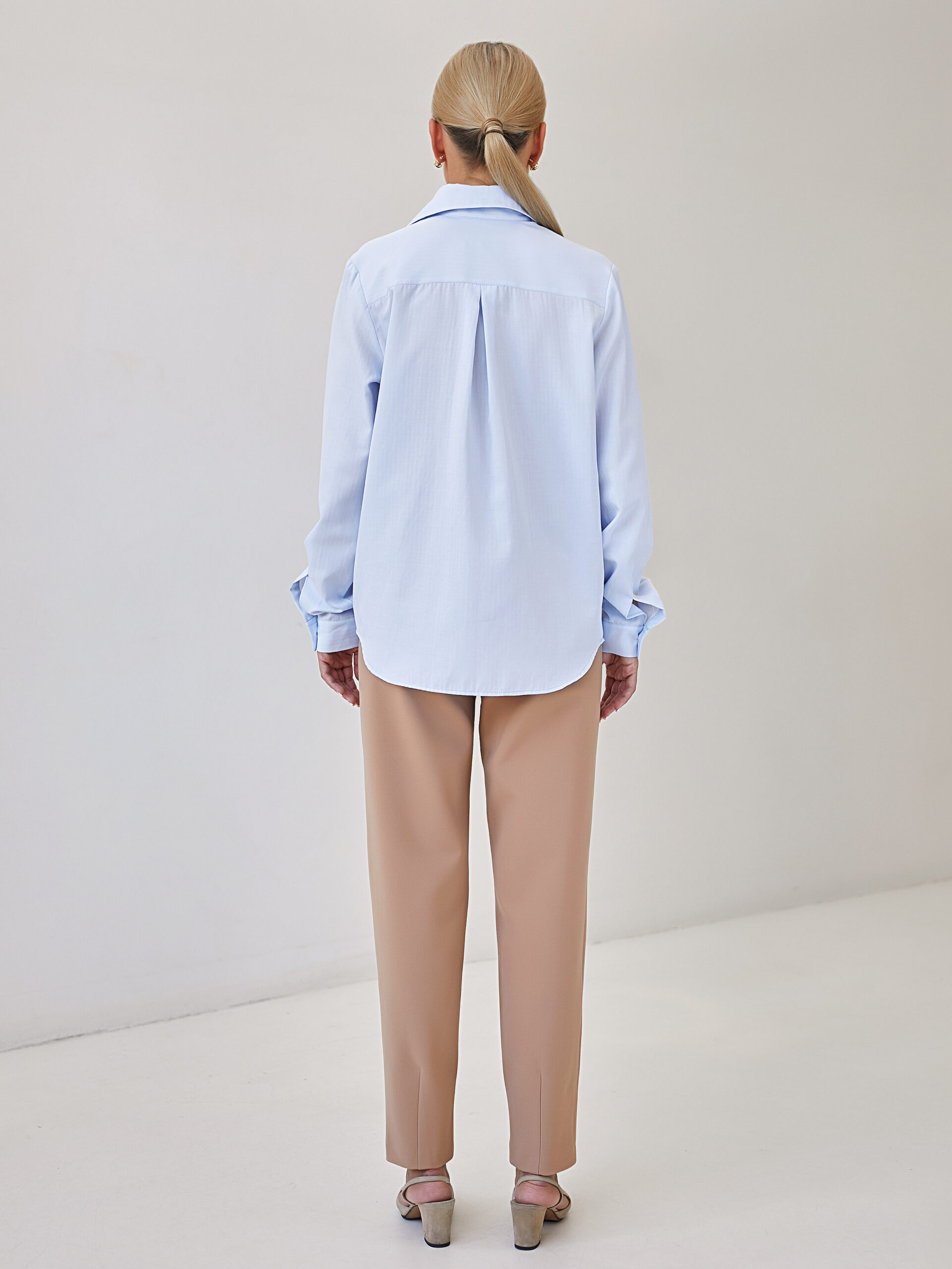 Рубашка прямого силуэта с отложным воротником на высокой стойке, кокетка на спине с защипом для лучшей посадки. Рукав свободный с манжетом.