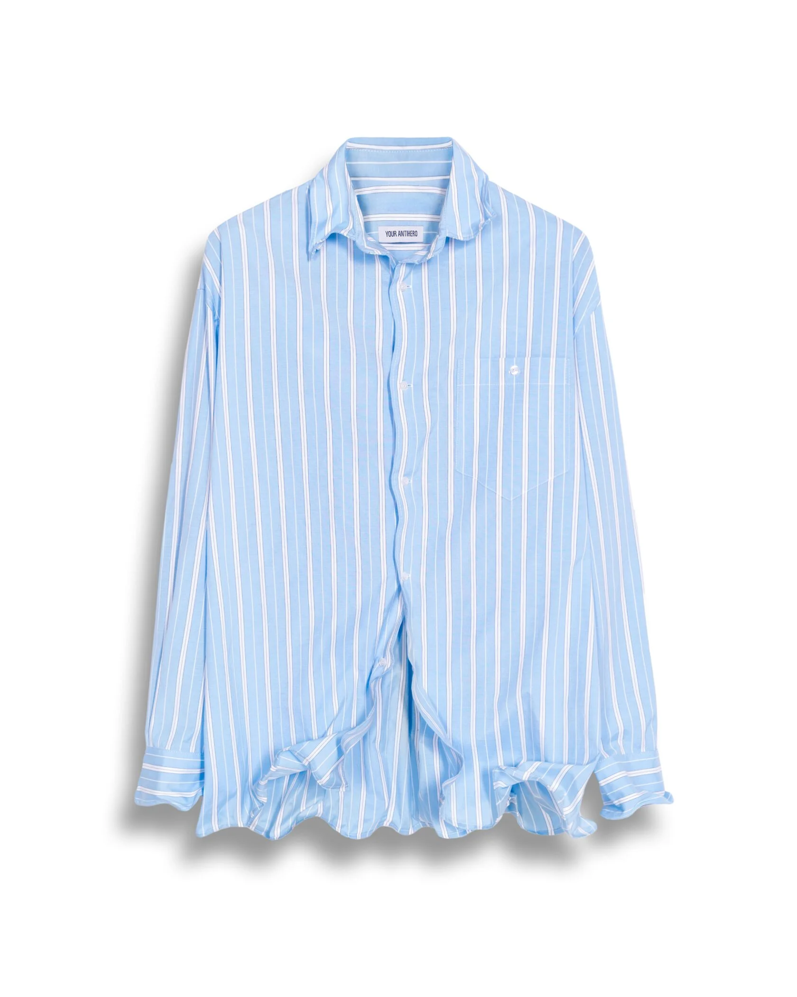 Такой прием обеспечивает рубашке формообразующую способность – она легко драпируется по низу, краям манжетов, воротника и полочек, создавая эффект антигравитации силуэта и пространственной памяти.