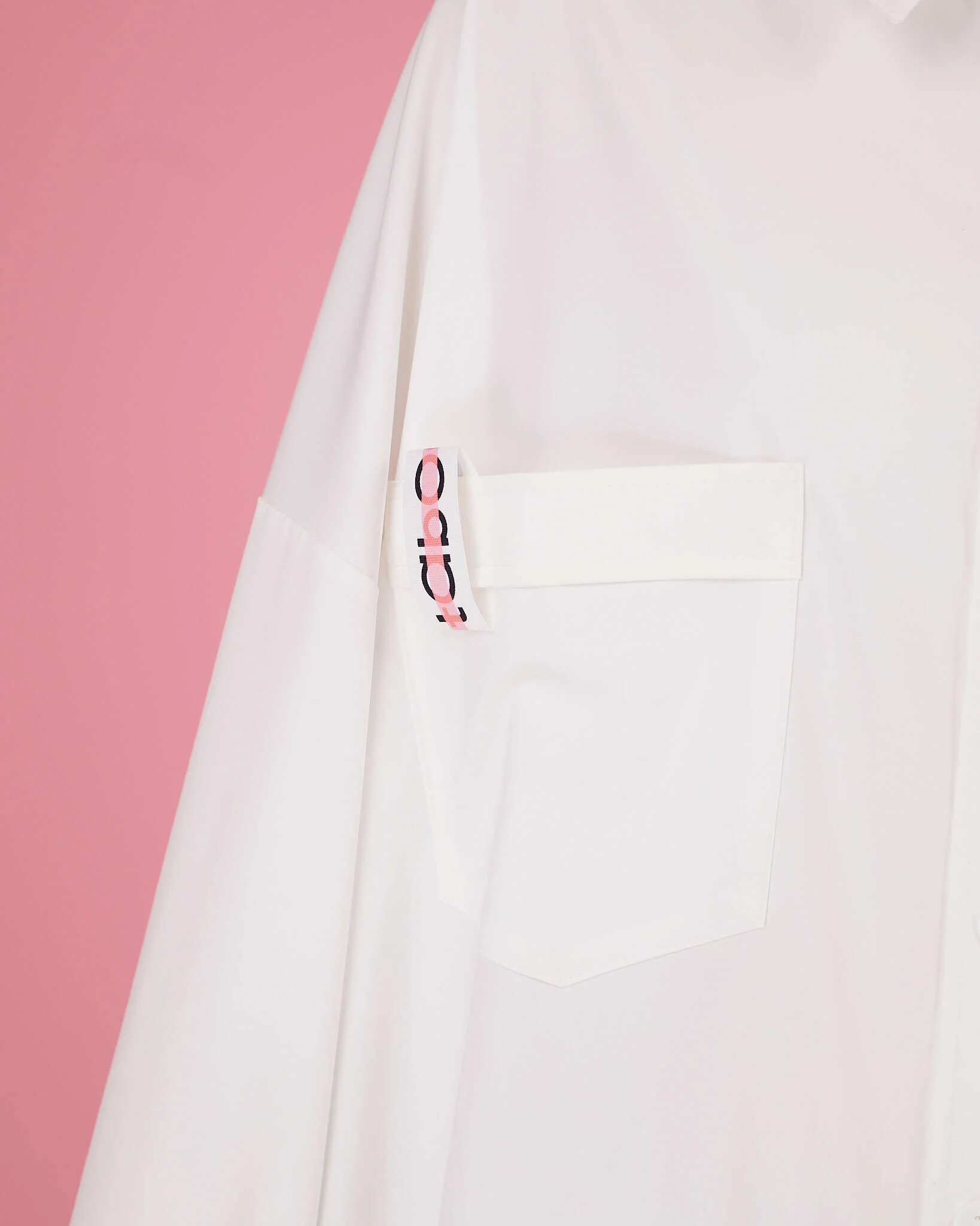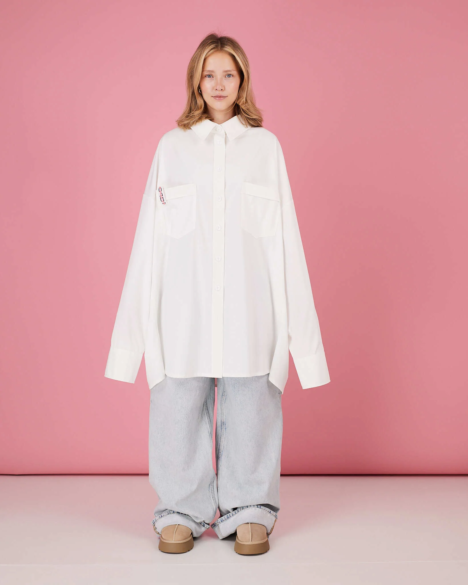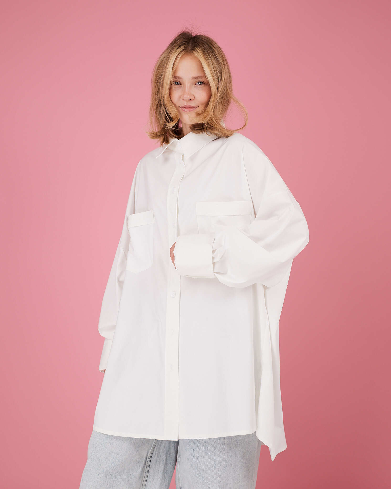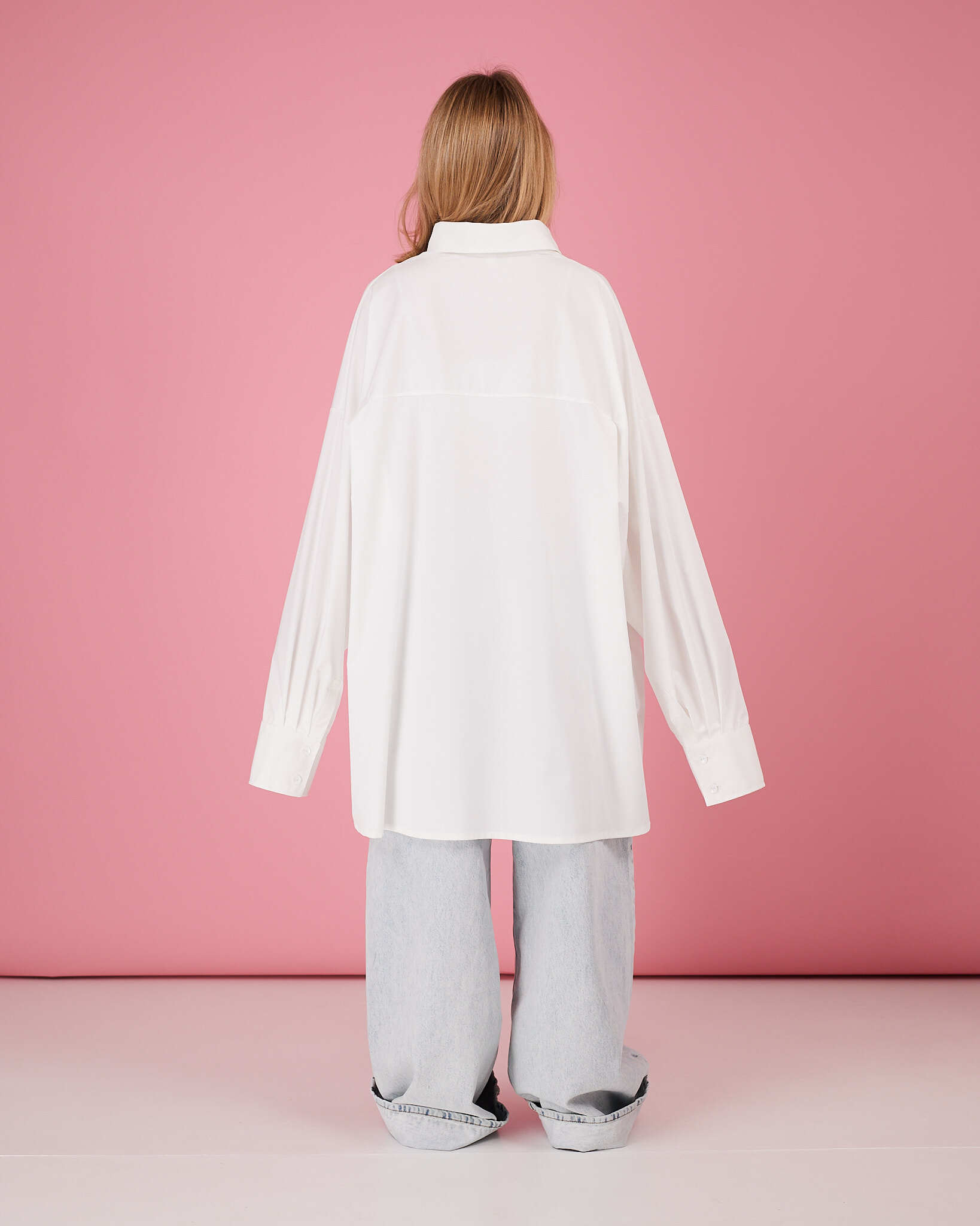 Рубашка прямого очень объемного силуэта имеет отложной воротник, кокетку и двойную складку на спинке. Рукава со складками на притачной манжете с застежкой на пуговицу. Линия низа немного скруглена. В боковых швах разрезы обработаны киперной лентой с логотипом бренда. Два передних кармана, на одном из которых логотип бренда.
