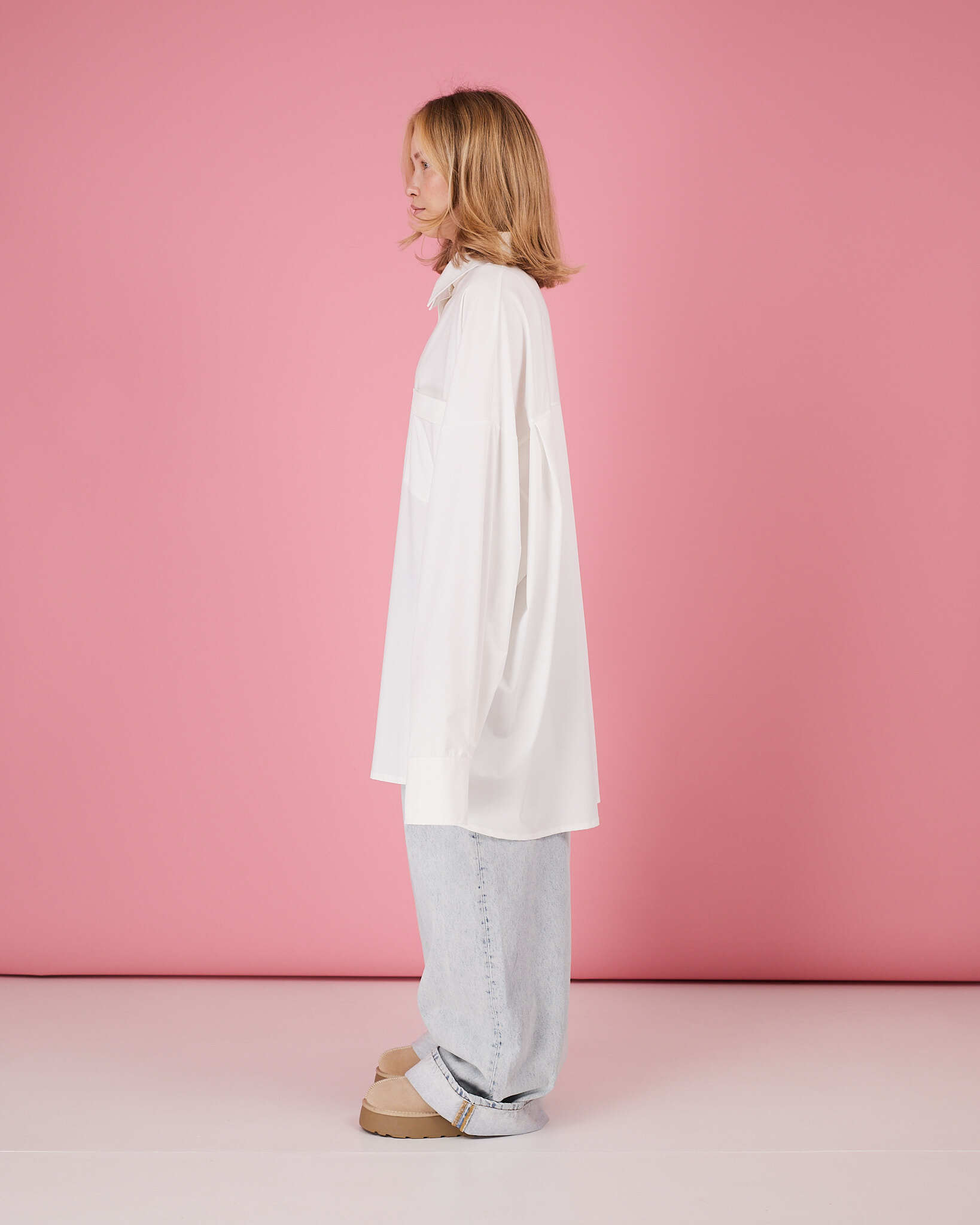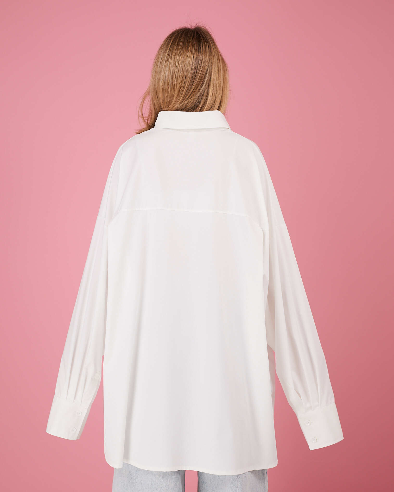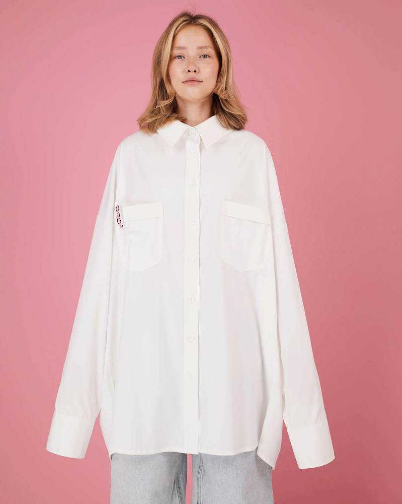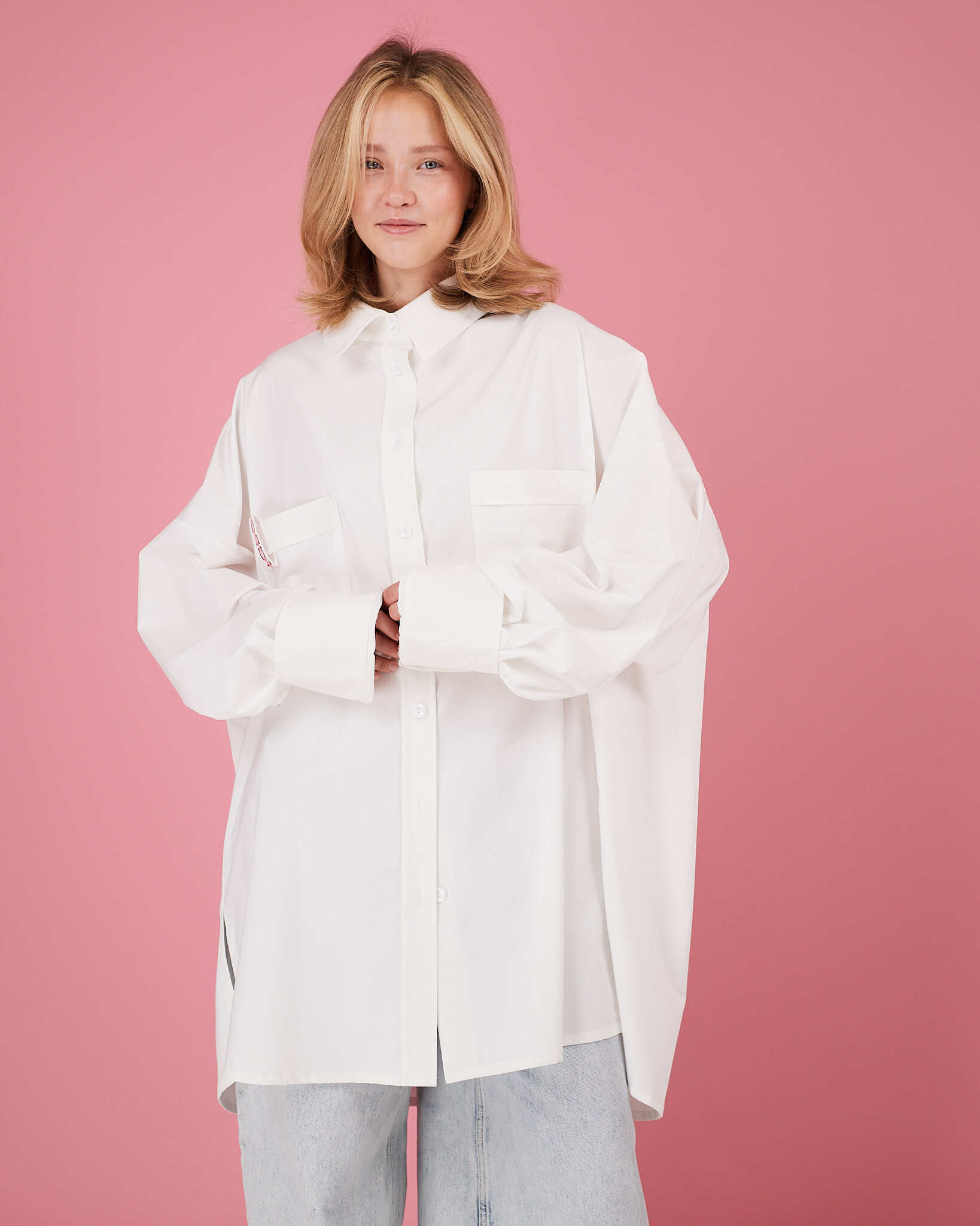 Рубашка прямого очень объемного силуэта имеет отложной воротник, кокетку и двойную складку на спинке. Рукава со складками на притачной манжете с застежкой на пуговицу. Линия низа немного скруглена. В боковых швах разрезы обработаны киперной лентой с логотипом бренда. Два передних кармана, на одном из которых логотип бренда.