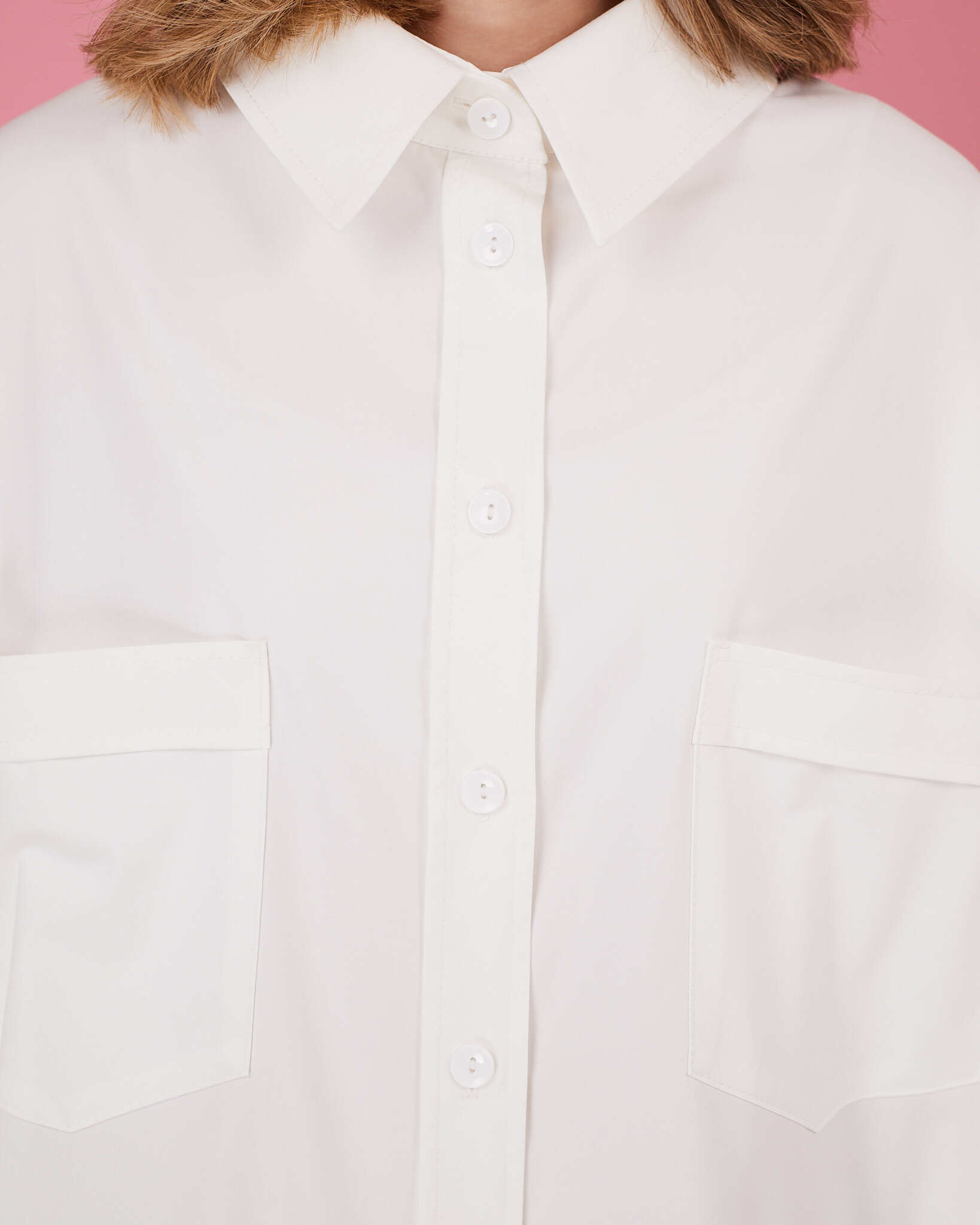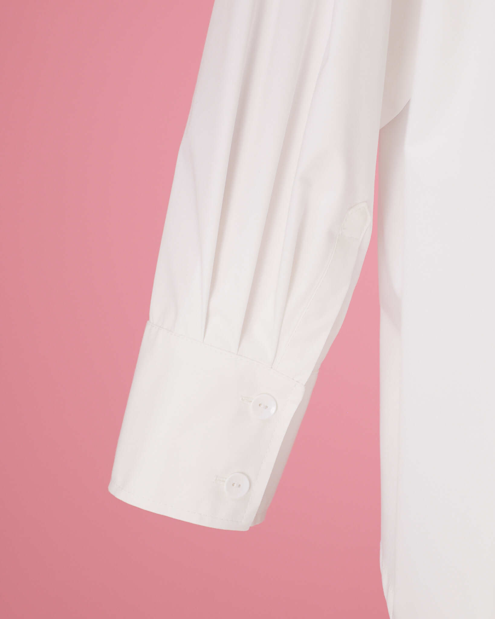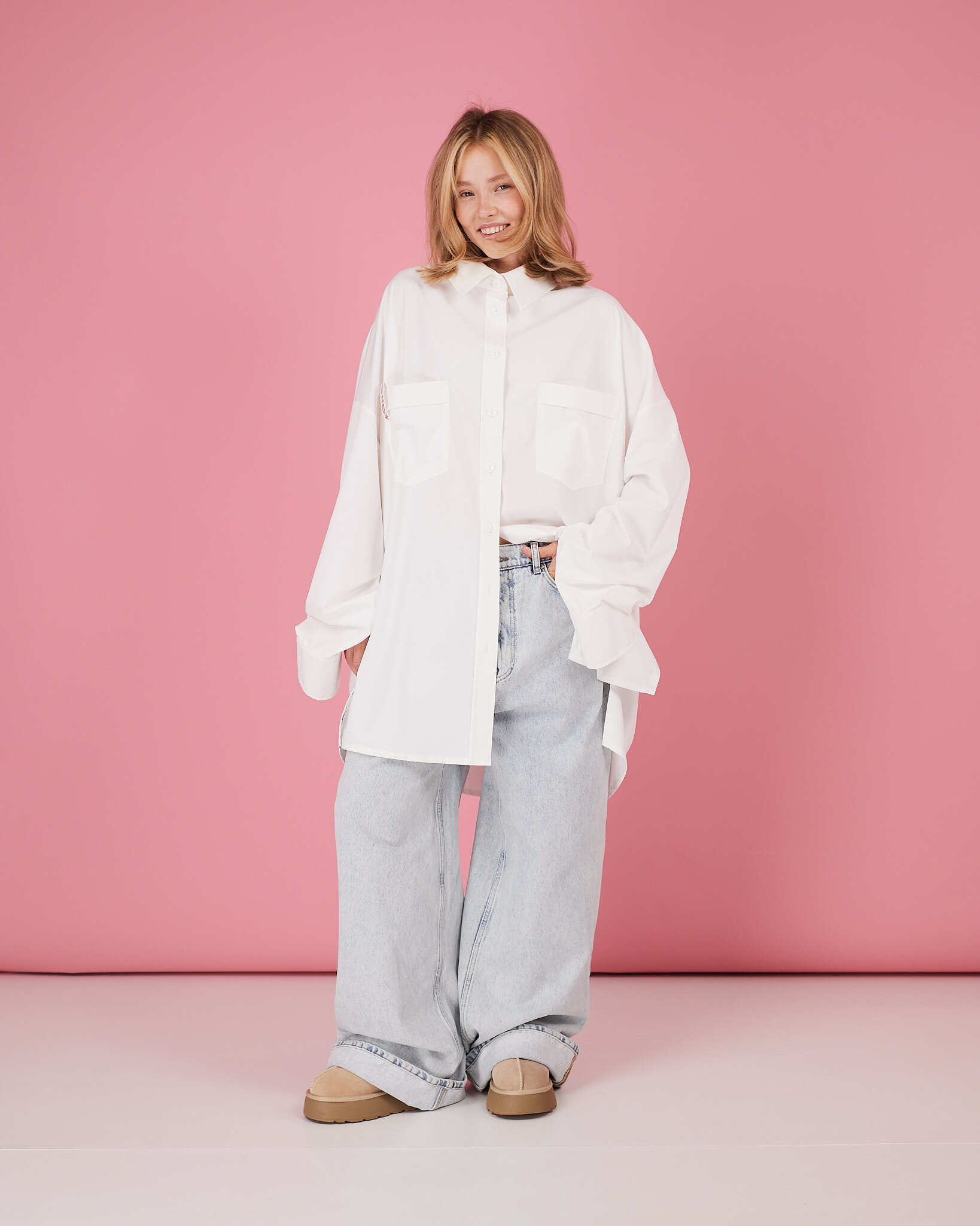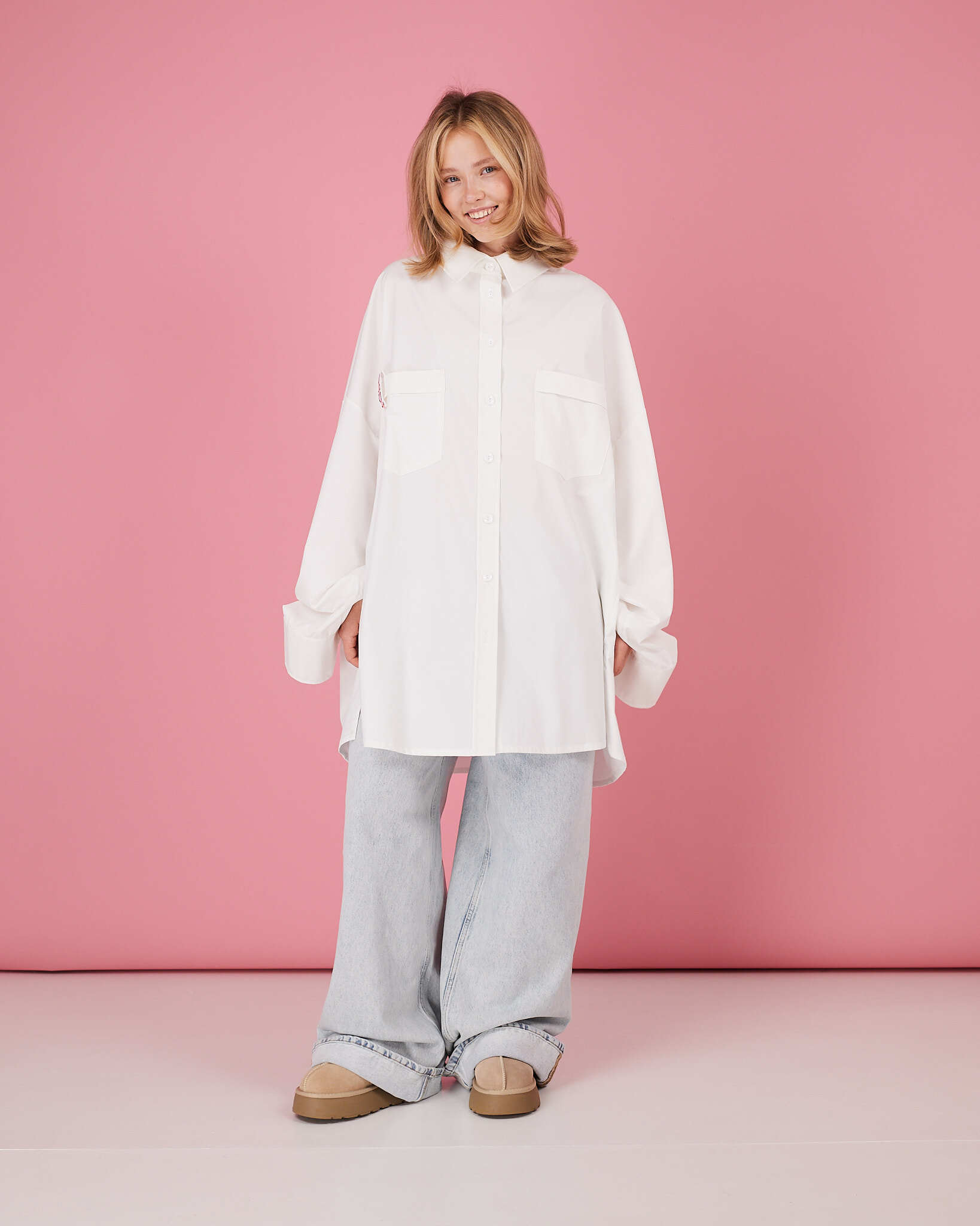 Рубашка прямого очень объемного силуэта имеет отложной воротник, кокетку и двойную складку на спинке. Рукава со складками на притачной манжете с застежкой на пуговицу. Линия низа немного скруглена. В боковых швах разрезы обработаны киперной лентой с логотипом бренда. Два передних кармана, на одном из которых логотип бренда.