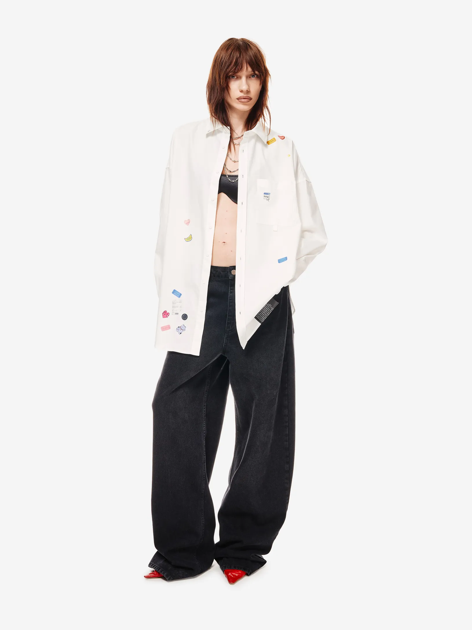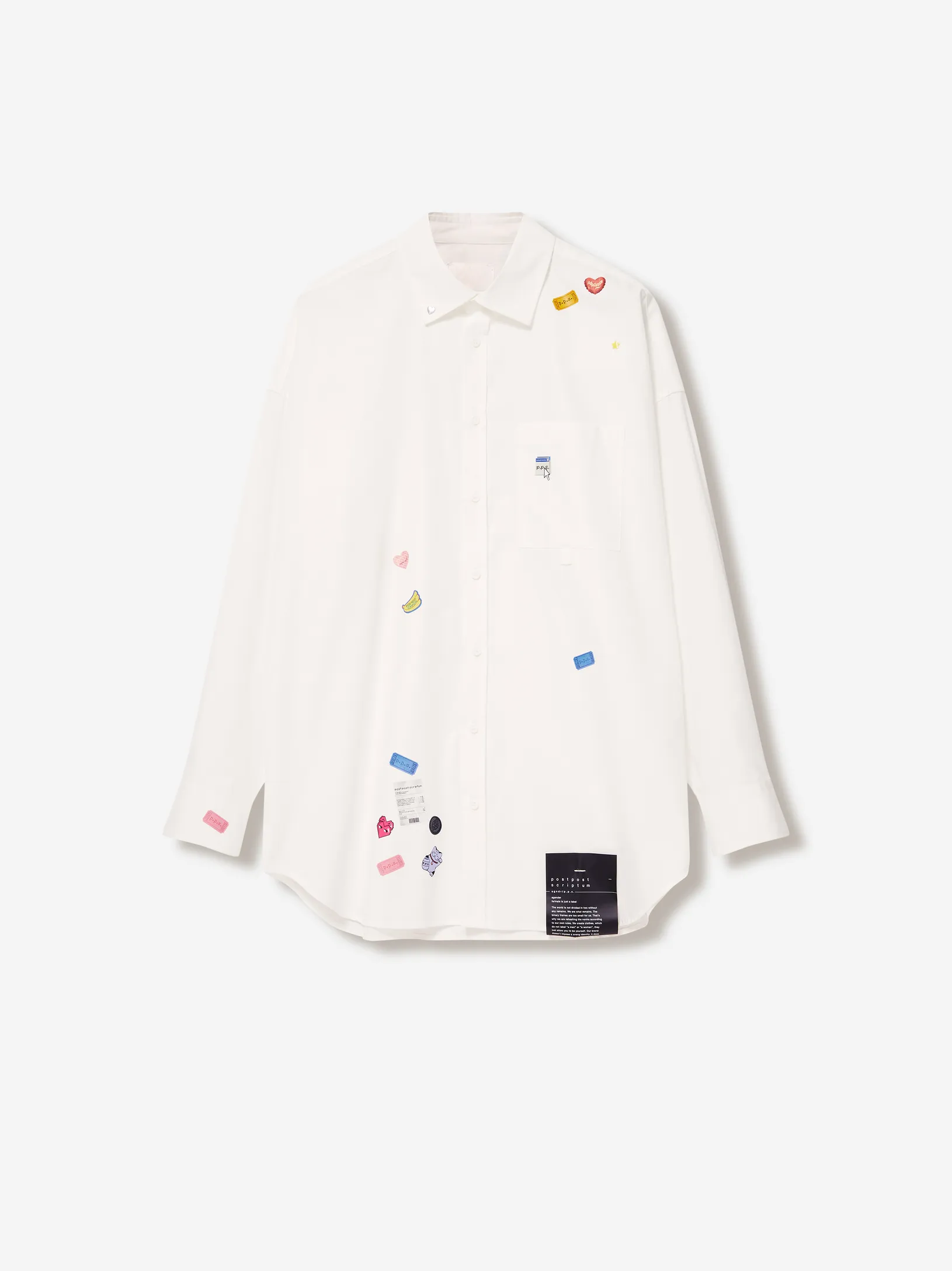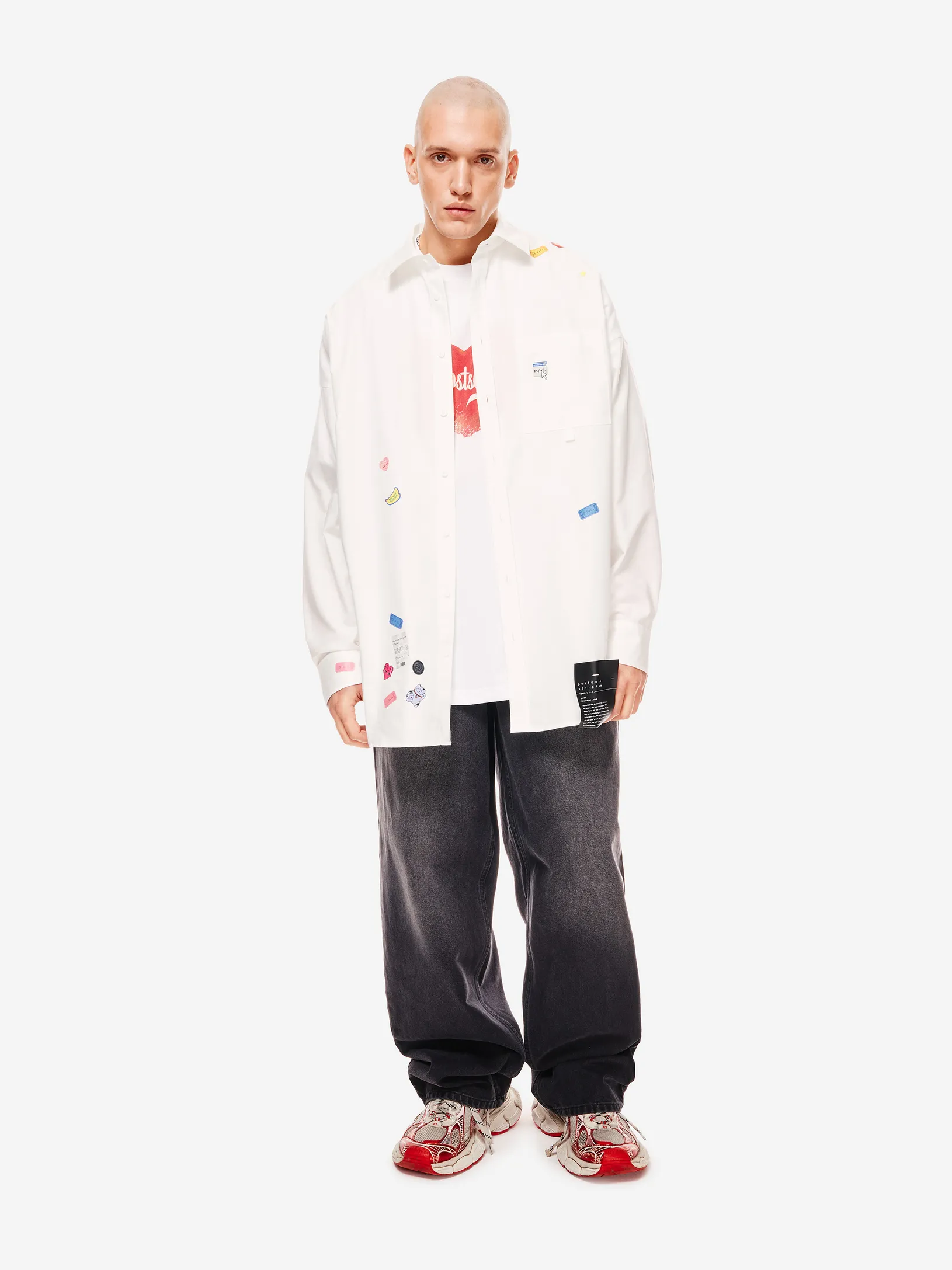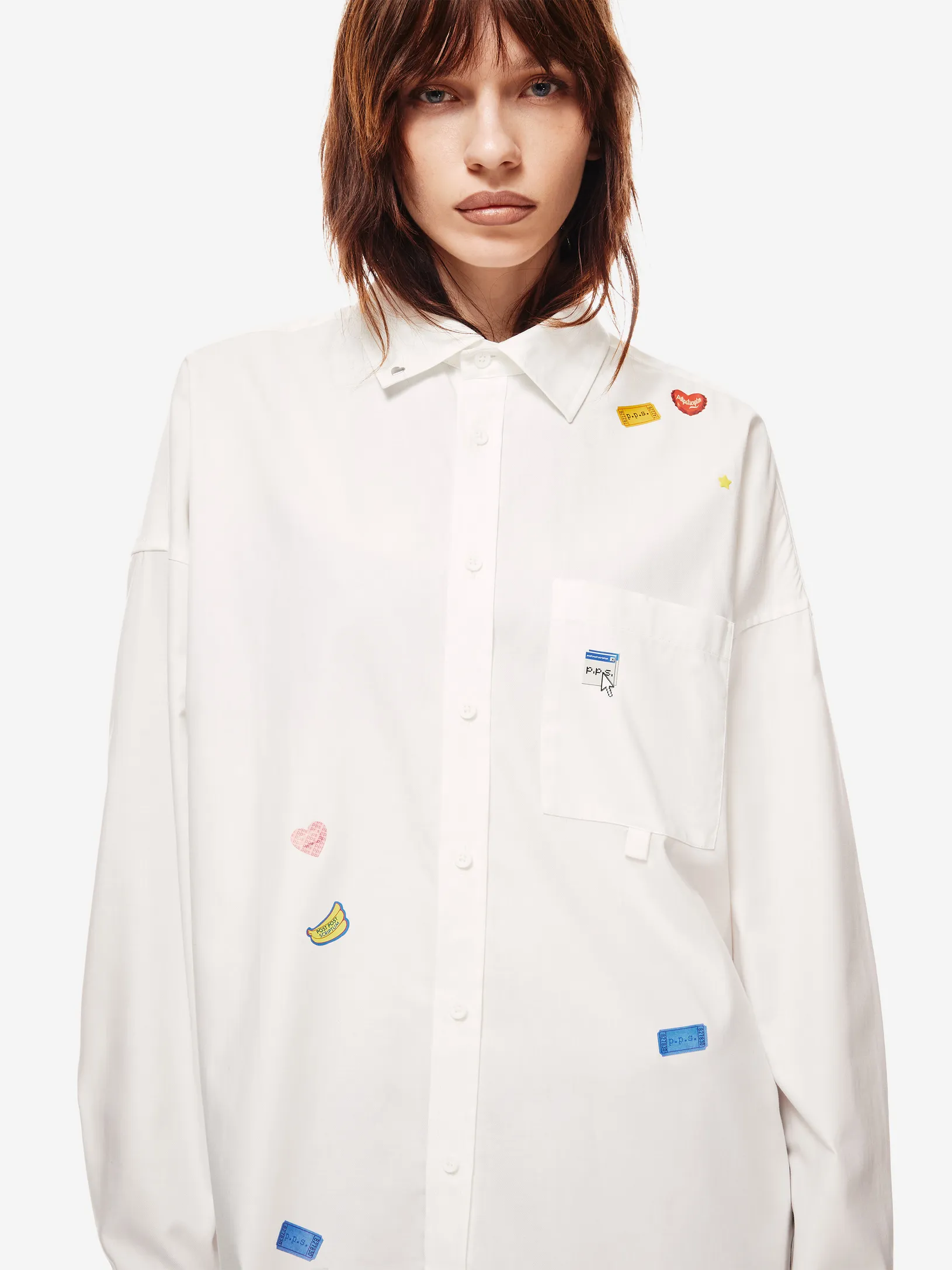 Для изготовления оверсайз рубашки с круглым воротником использовали легкий тонкий хлопок. изделию придали объемный крой посредством опущения плечевого шва и дополнили её карманом на груди и застежками-пуговицами в тон.