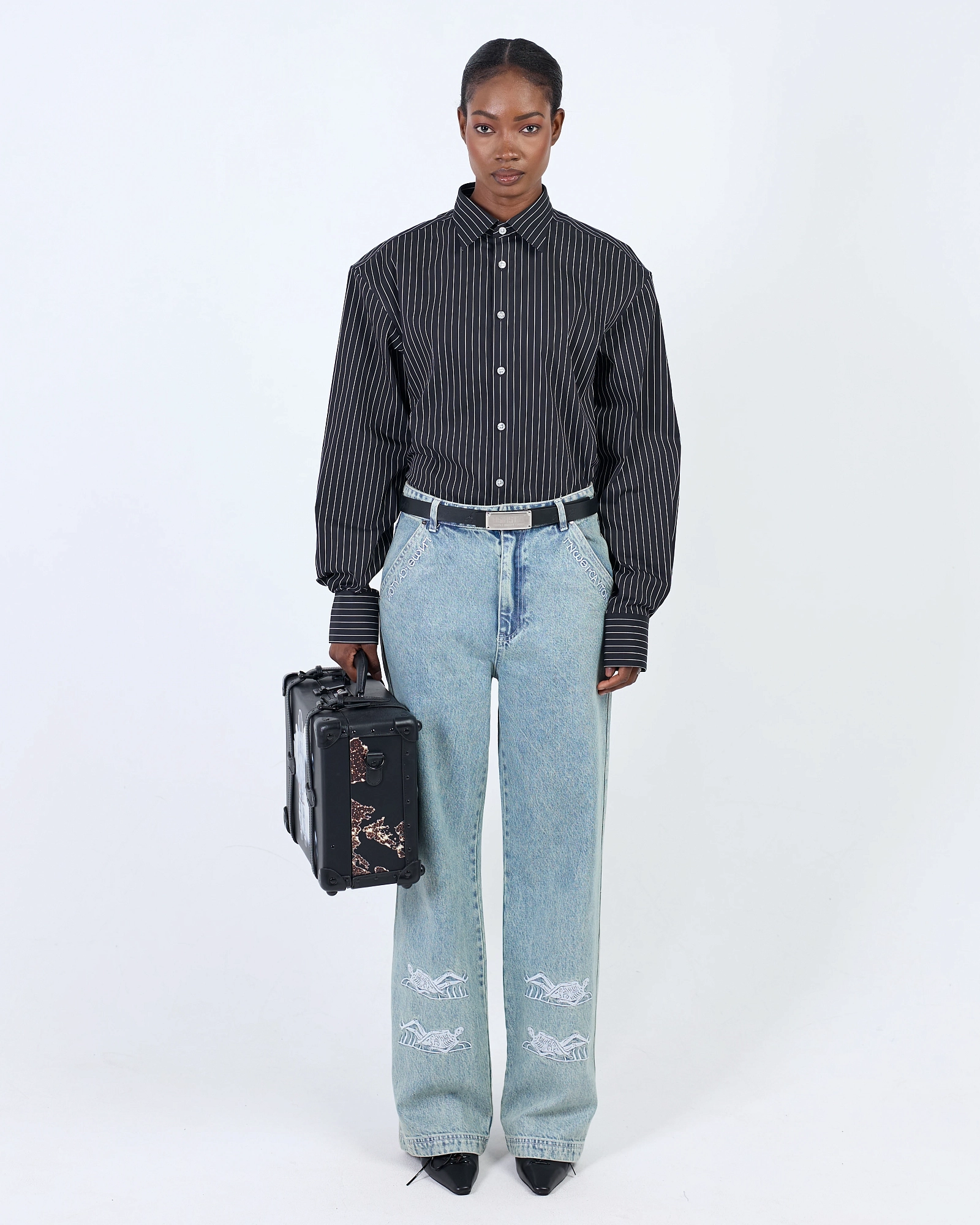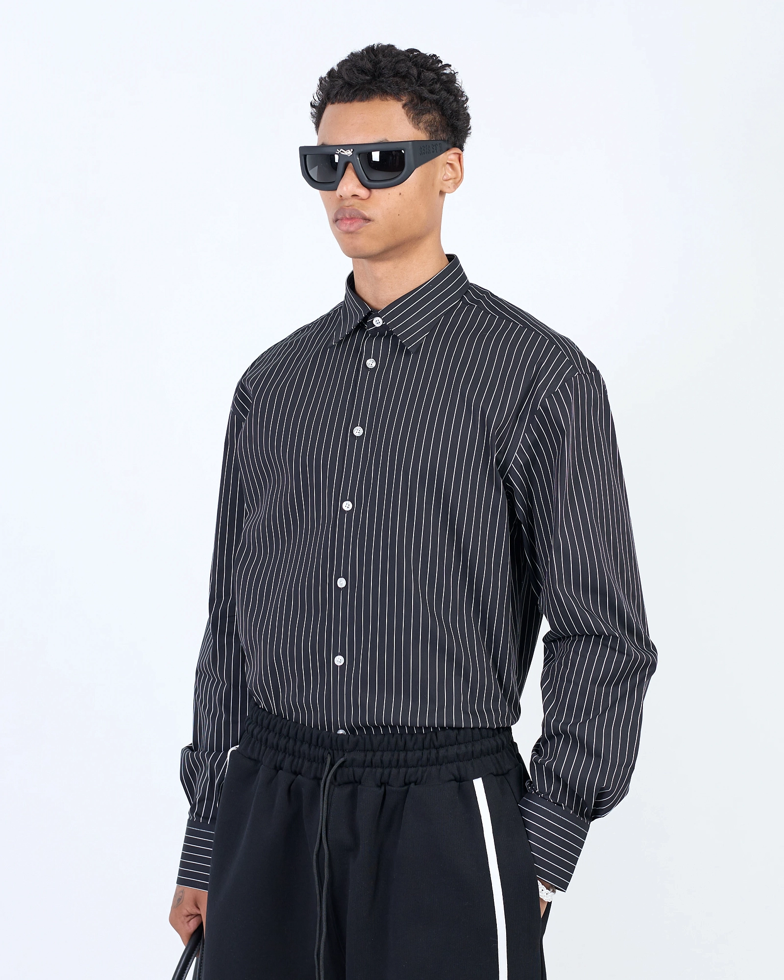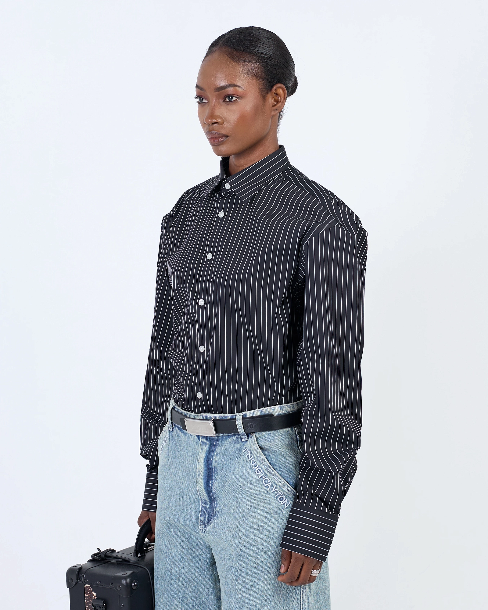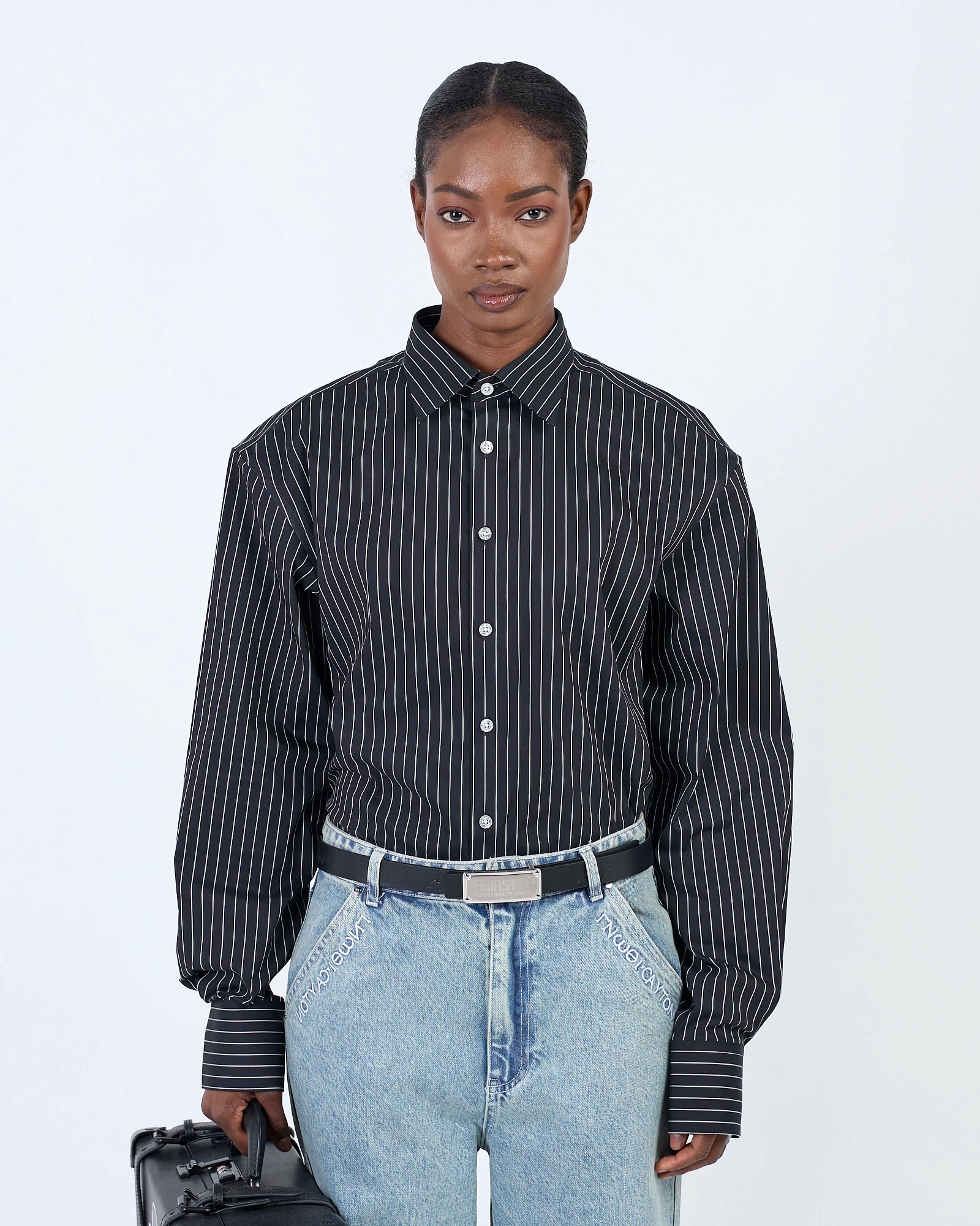 Классическая рубашка в тонкую полоску — базовое изделие с лаконичным акцентом. Прямой силуэт, широкая плечевая линия и мягкая ткань создают сбалансированный образ, сочетающий строгость и расслабленность. Тонкий вертикальный принт визуально вытягивает силуэт, а аккуратный воротник и манжеты добавляют четкость форм. Носите с брюками, джоггерами или поверх футболки — для повседневного образа или с костюмом для деловой встречи.