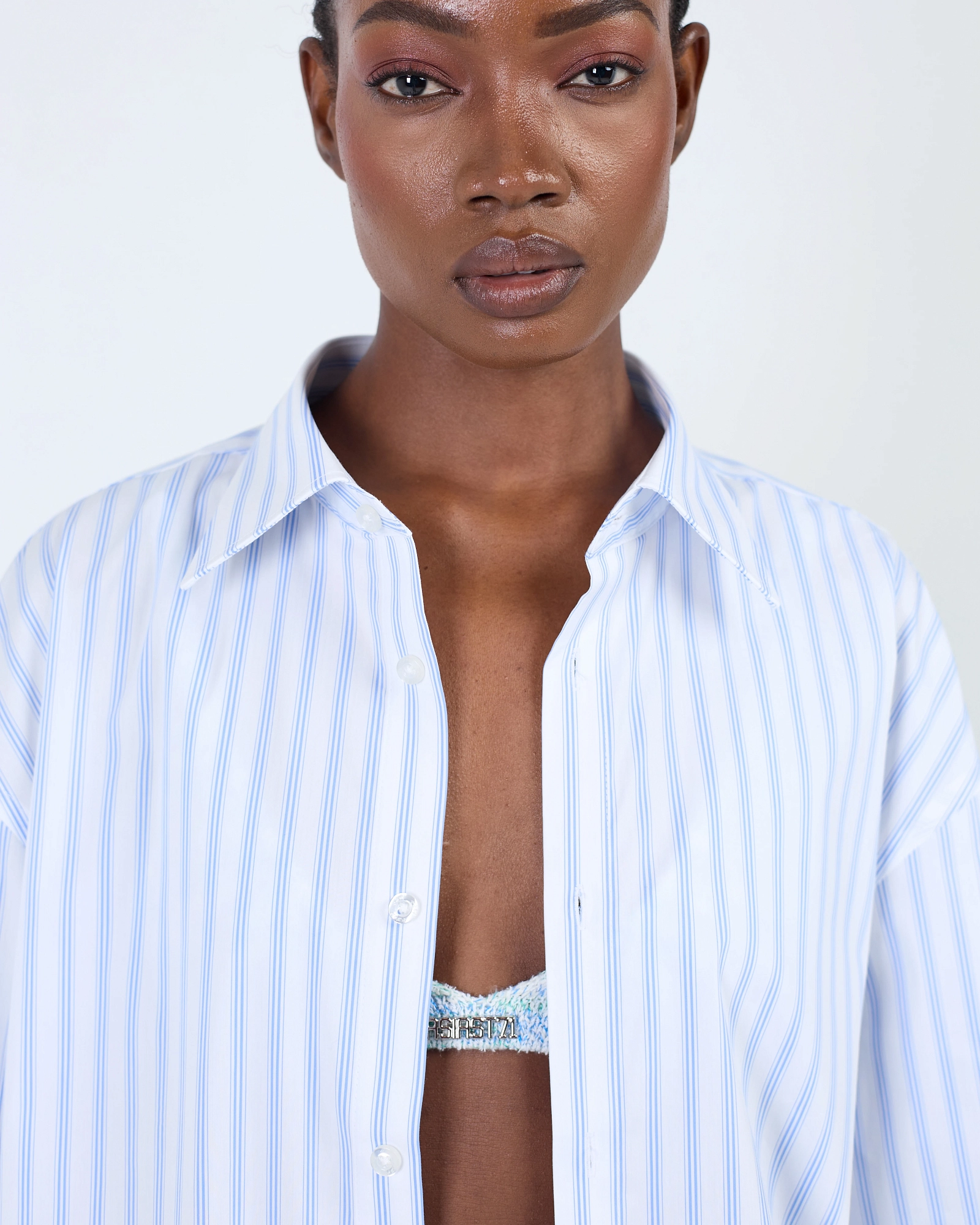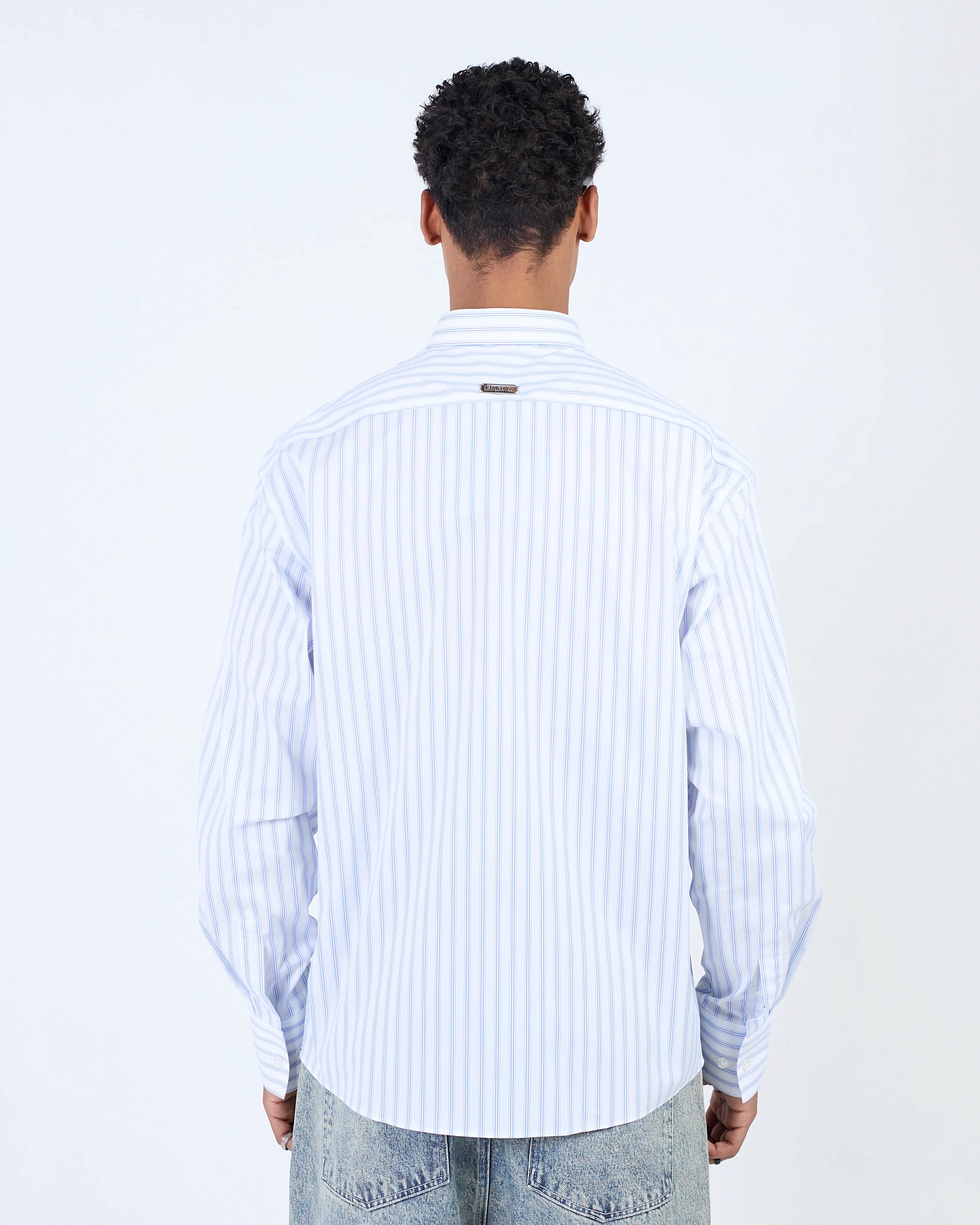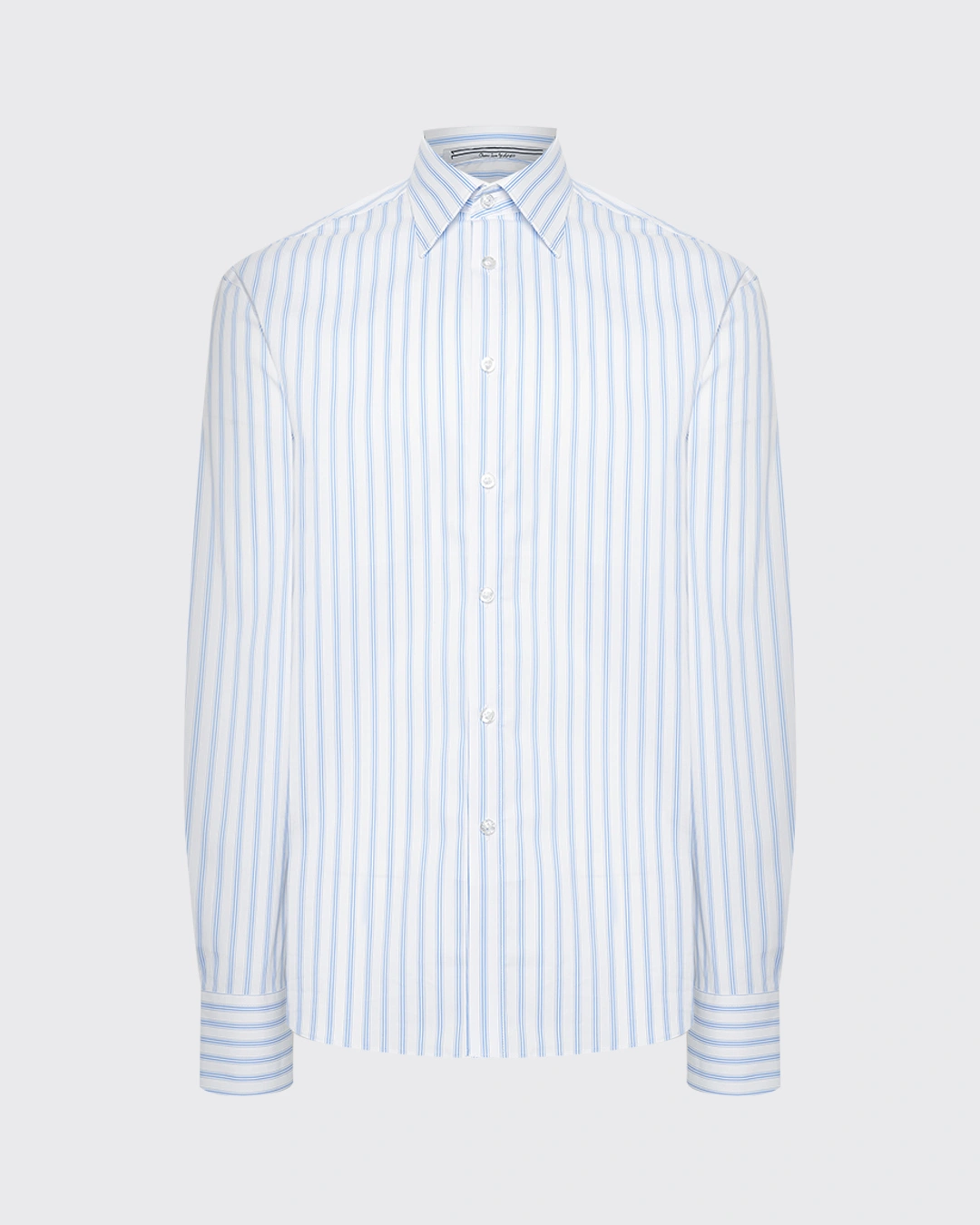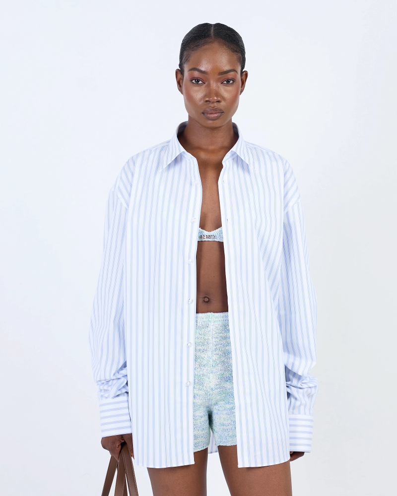 Классическая рубашка в тонкую полоску — базовое изделие с лаконичным акцентом. Прямой силуэт, широкая плечевая линия и мягкая ткань создают сбалансированный образ, сочетающий строгость и расслабленность. Тонкий вертикальный принт визуально вытягивает силуэт, а аккуратный воротник и манжеты добавляют четкость форм. Носите с брюками, джоггерами или поверх футболки — для повседневного образа или с костюмом для деловой встречи.