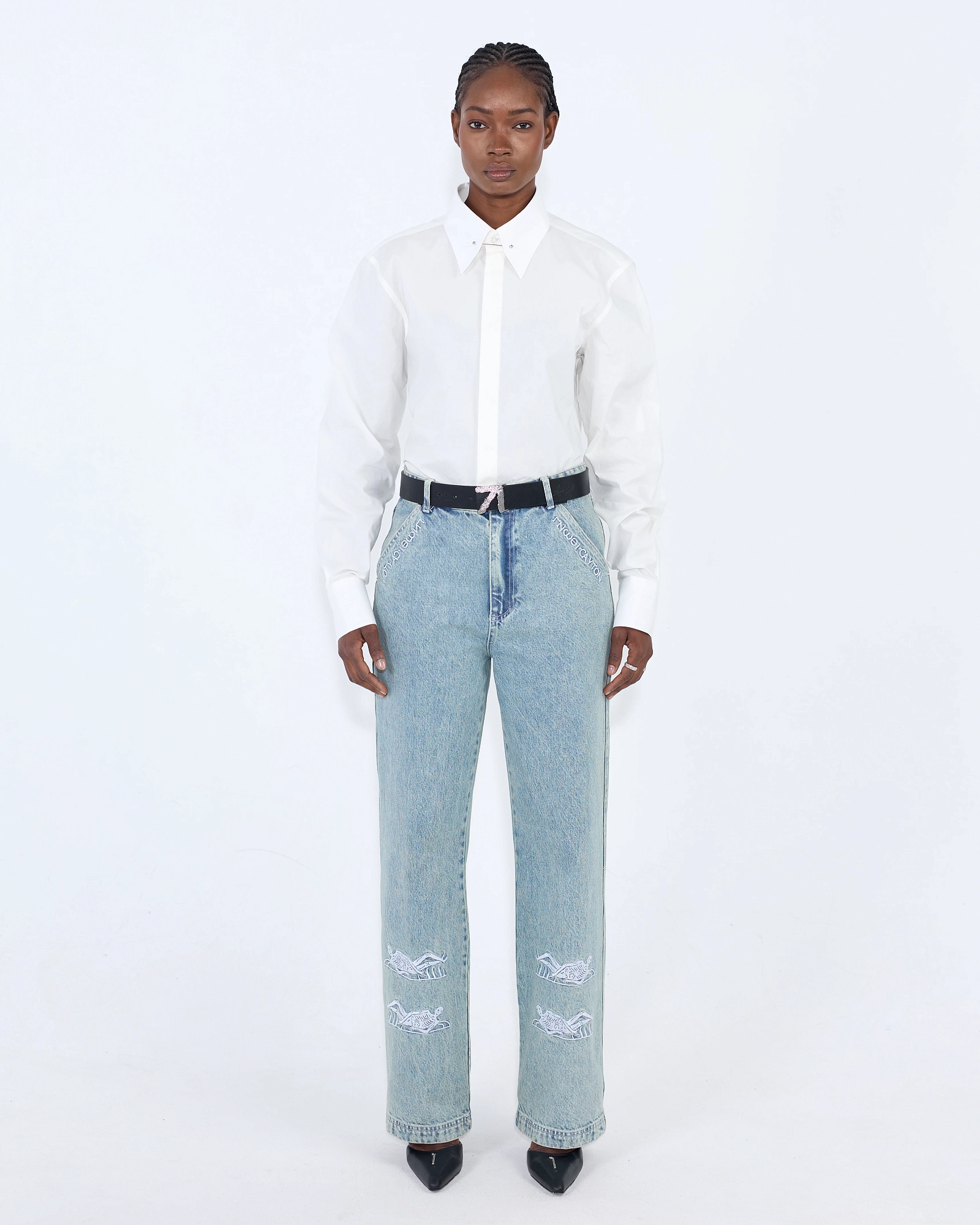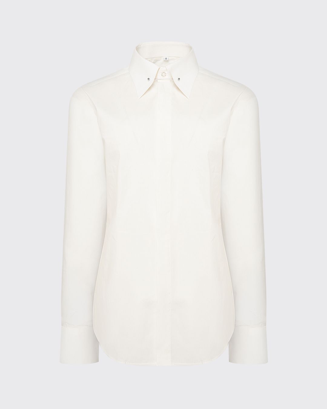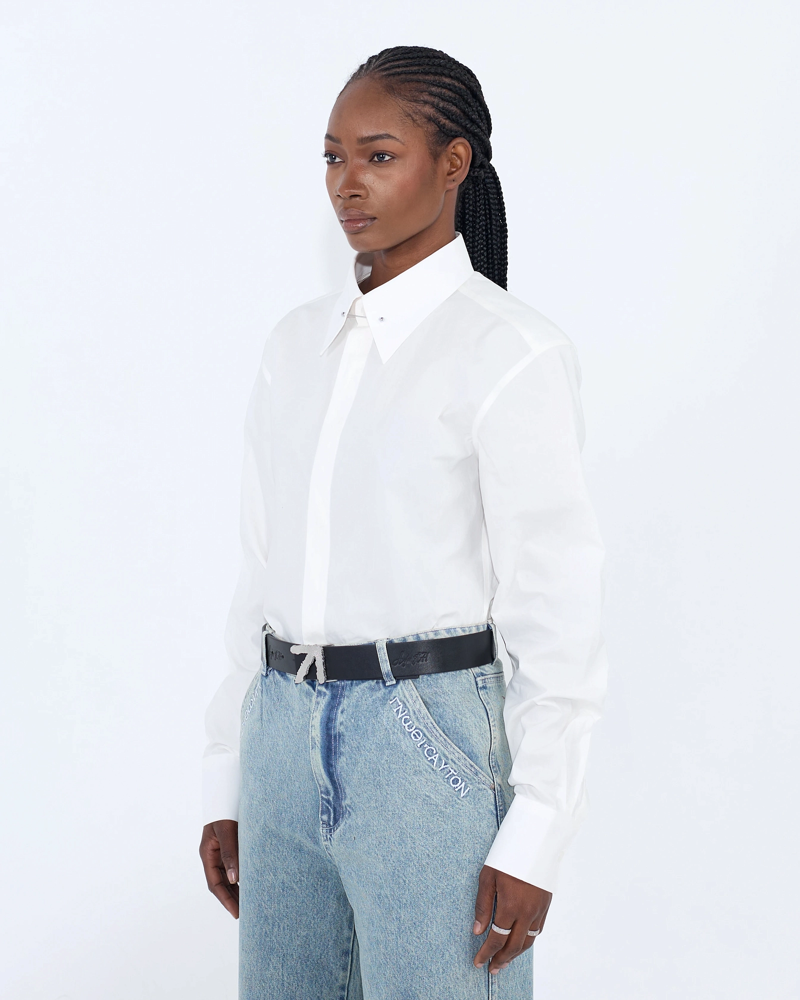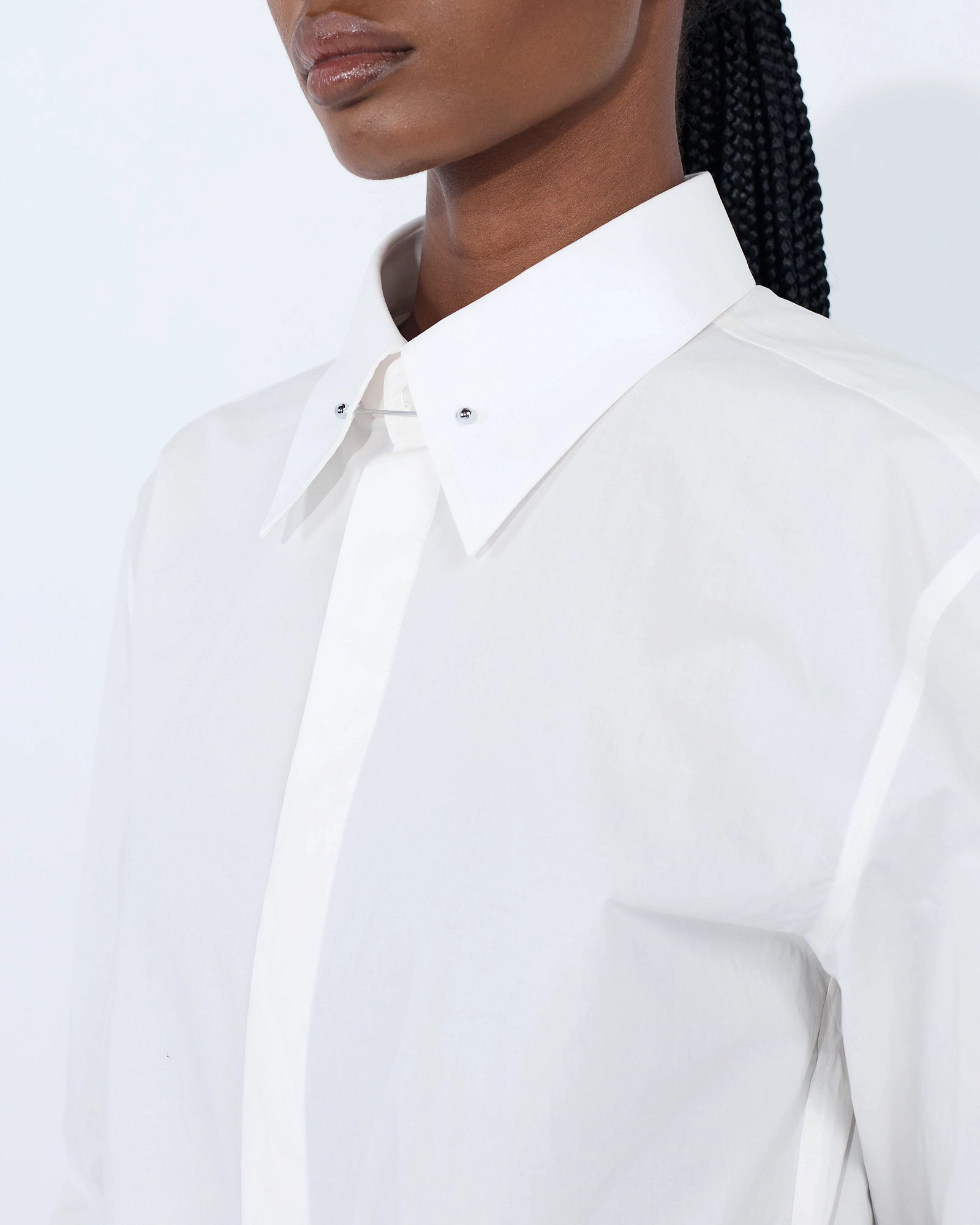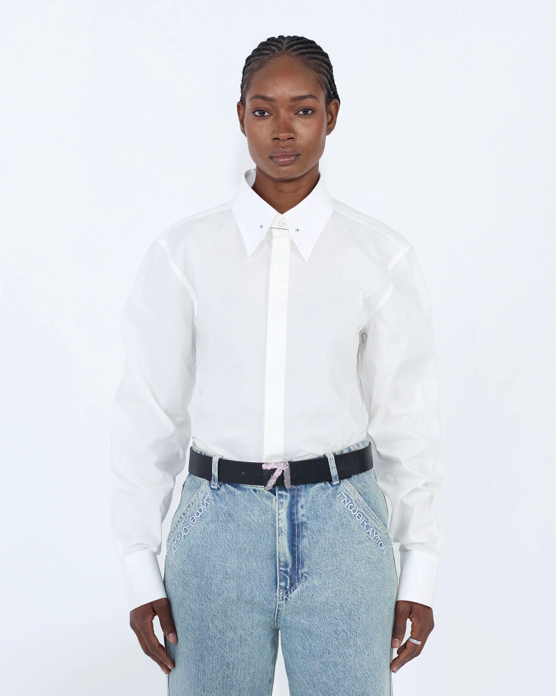 Эта сорочка — воплощение минимализма с акцентом на детали. Модель выполнена из плотного хлопка с чёткой архитектурной формой и подчеркнутыми манжетами. Широкий воротник украшен металлическим пирсингом, придающими образу современное звучание. Благодаря прямому крою и чистому силуэту, рубашка легко интегрируется в любой гардероб — от делового до повседневного. Сочетайте с джинсами, чтобы сбалансировать строгость, или носите с классическими брюками для более собранного лука.