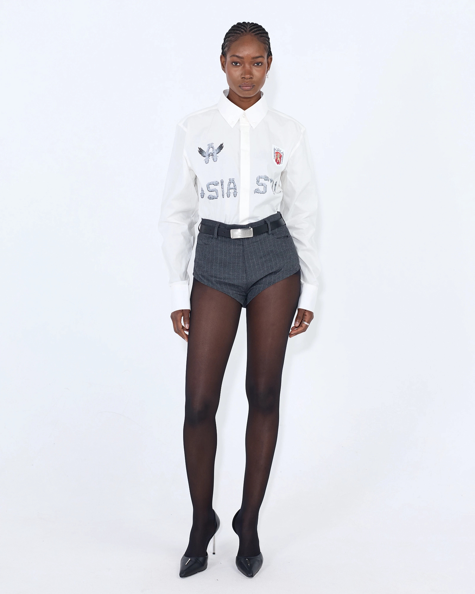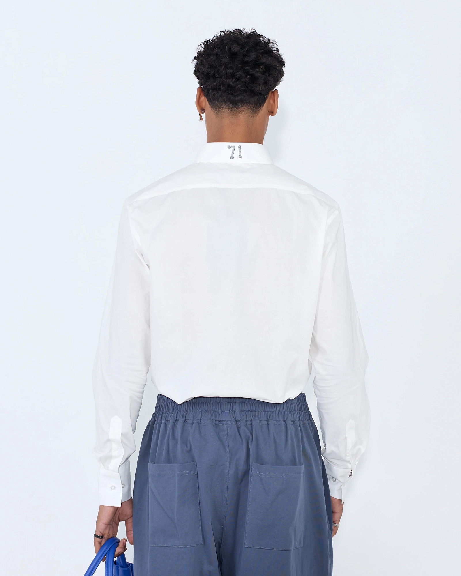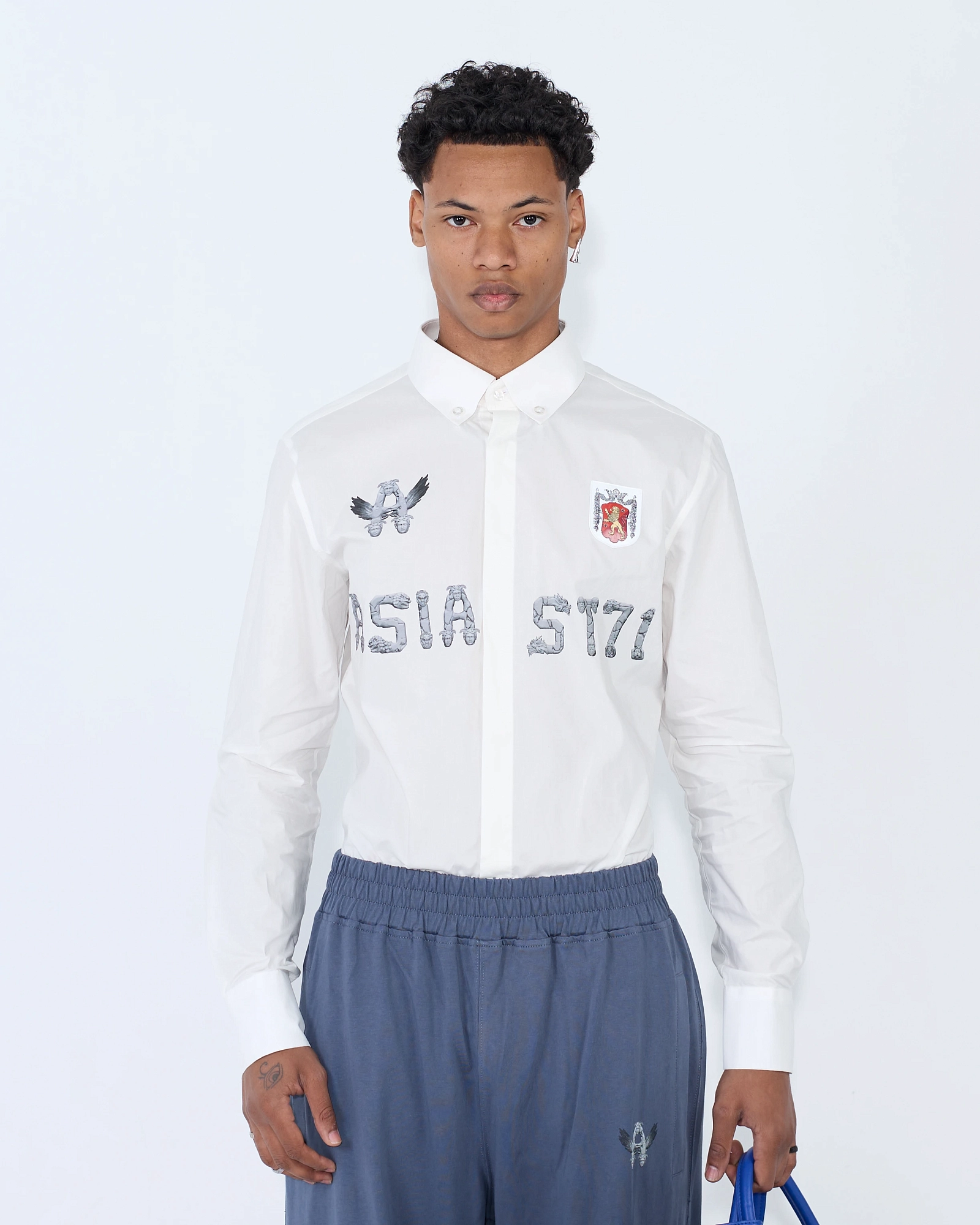 Эта рубашка — дерзкое переосмысление классики с элементами уличной эстетики. Выполненная из плотного белого хлопка, она сохраняет чёткость линий и форму, при этом декорирована графикой в индустриальном стиле. Контрастные надписи и эмблемы на груди добавляют характер и визуальный акцент, а строгий воротник и удлинённые манжеты уравновешивают общий силуэт. Этот предмет гардероба идеально подойдёт для тех, кто не боится экспериментировать с образом. Носите с мини-шортами и ремнём или добавьте широкие брюки для игры на контрастах.