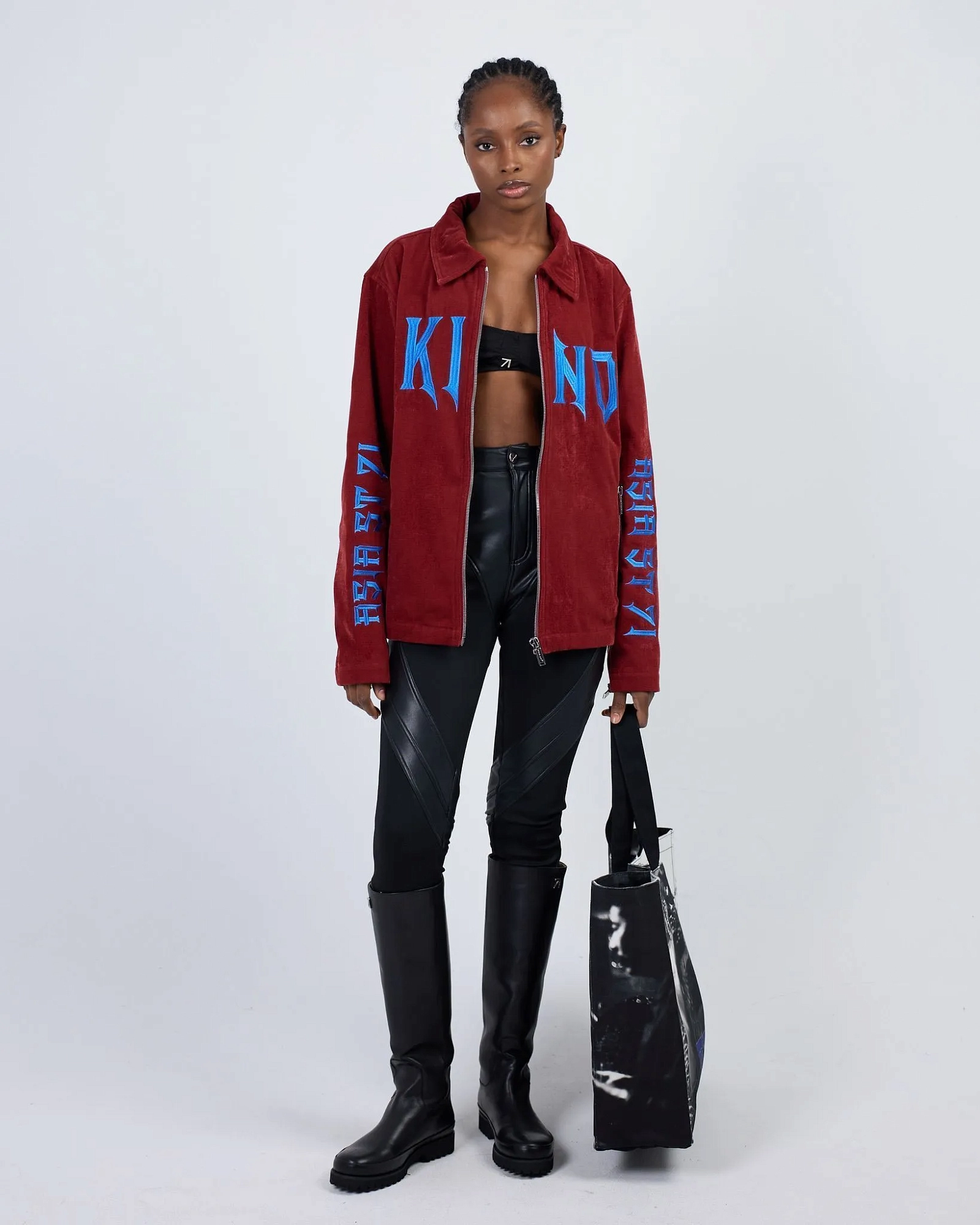 Рубашка из плотного велюра, отсылающая к бунтарским 80-м в трендовом красном цвете, с контрастной вышивкой синей нитью. Брендированная стальная фурнитура, спущенный плечевой шов, свободный крой. Рекомендуем носить вторым слоем поверх кроп-топа или футболки с длинным или коротким рукавом.