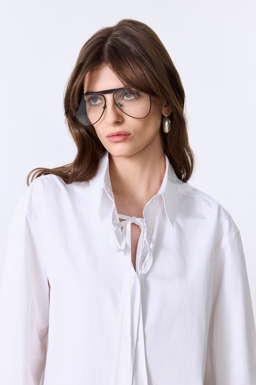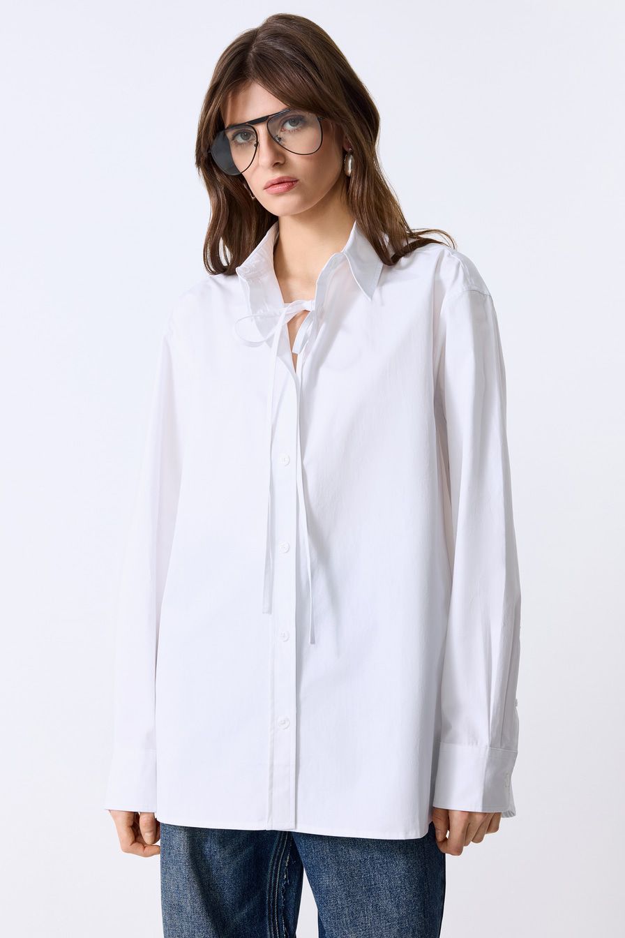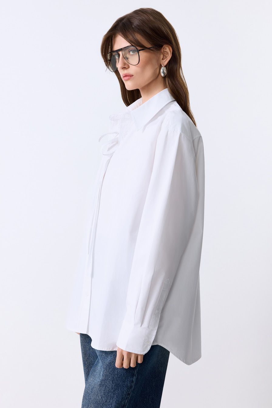 Белая рубашка из 100% хлопка – модель свободного кроя со спущенной линией плеч. Рубашка дополнена завязками.
