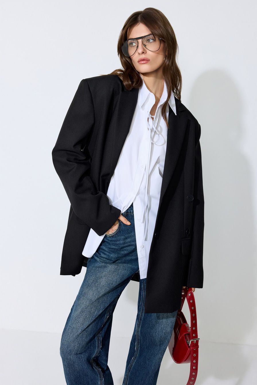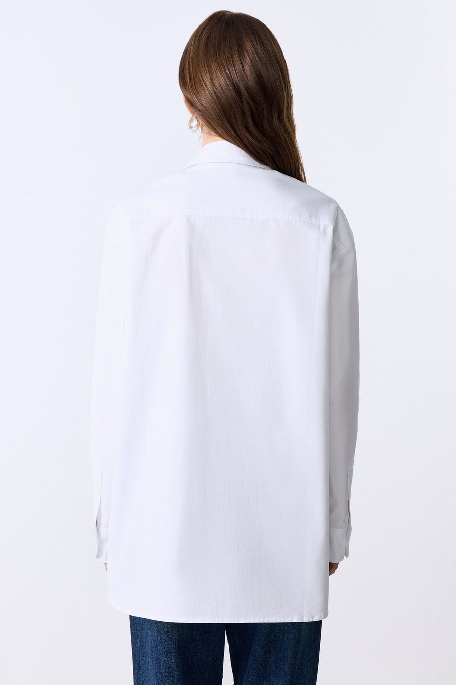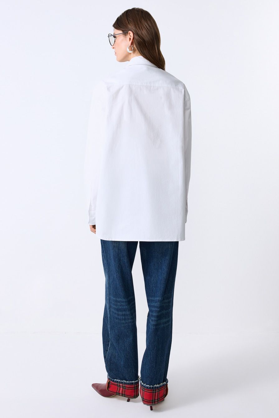 Белая рубашка из 100% хлопка – модель свободного кроя со спущенной линией плеч. Рубашка дополнена завязками.