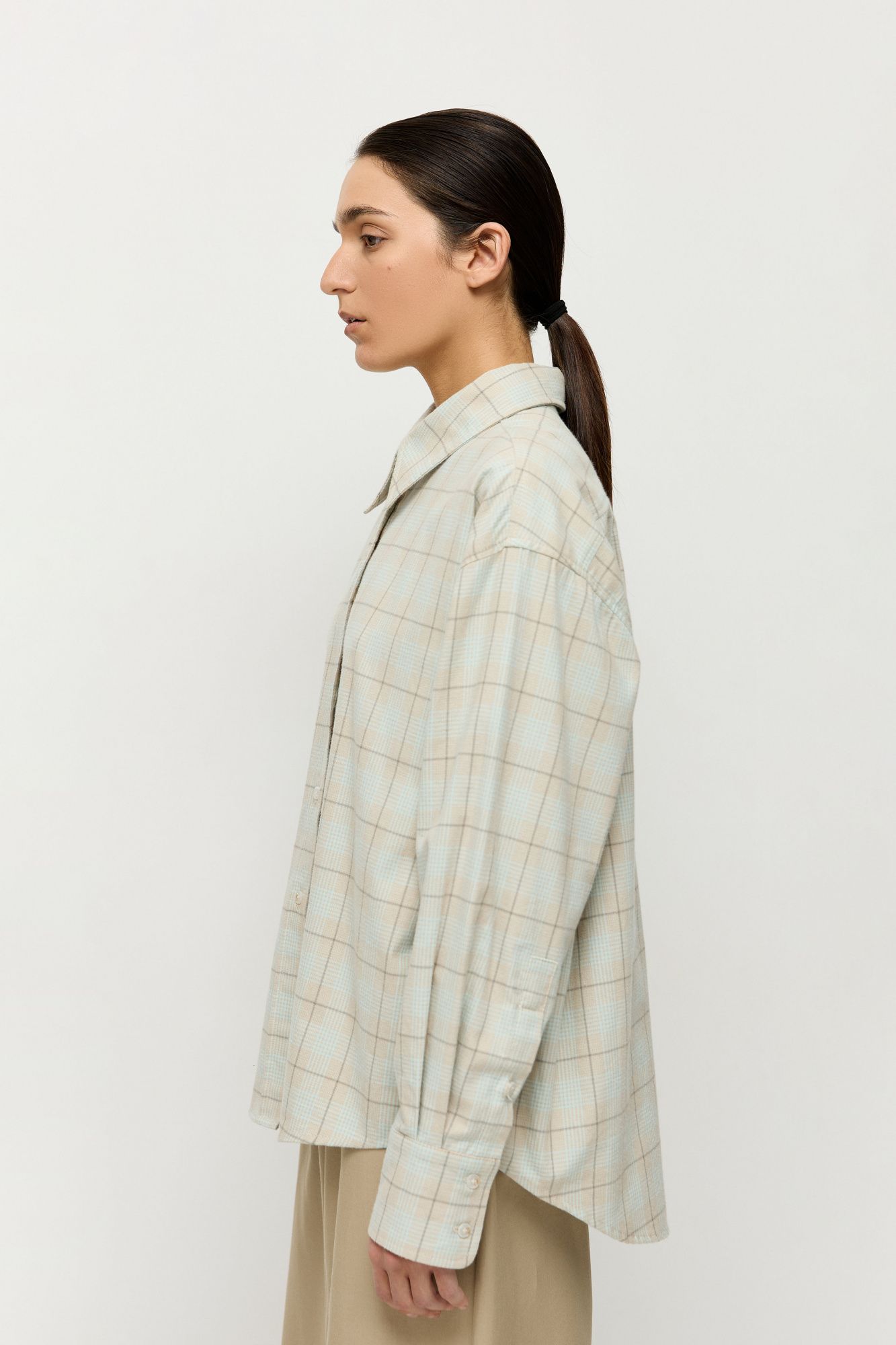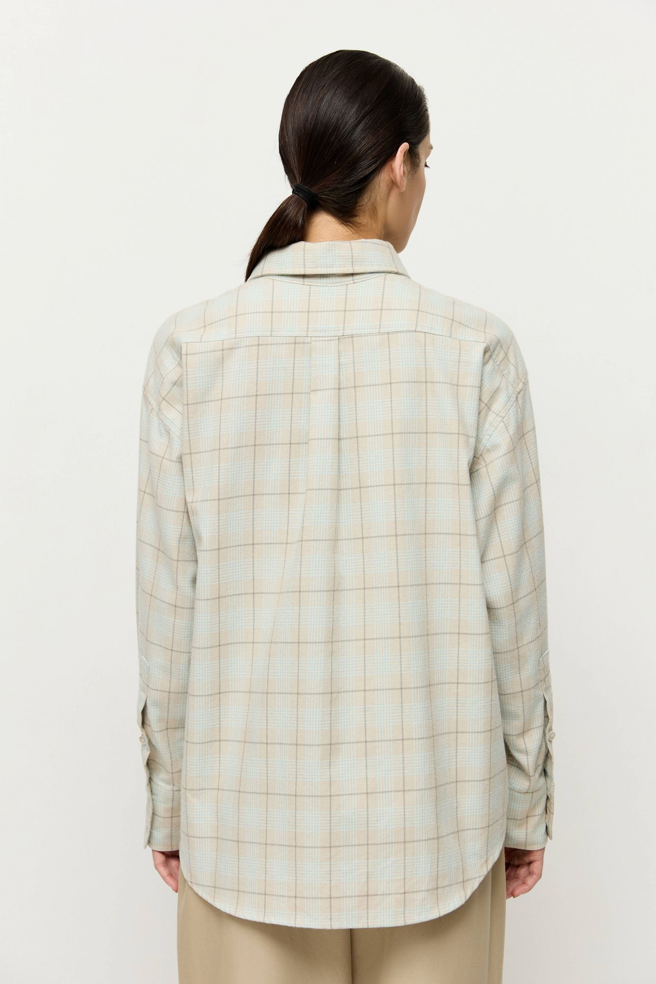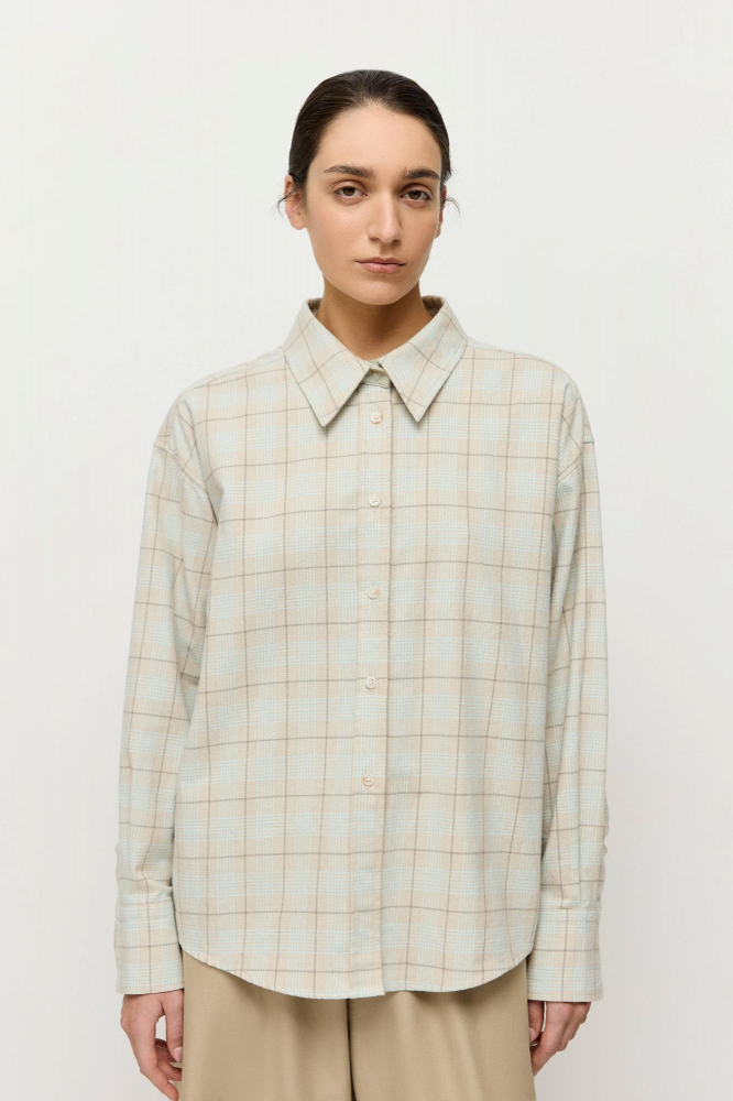 Объемная рубашка свободного кроя в мужском стиле сшита из итальянской фланели, в составе которой 100% натуральный хлопок.
