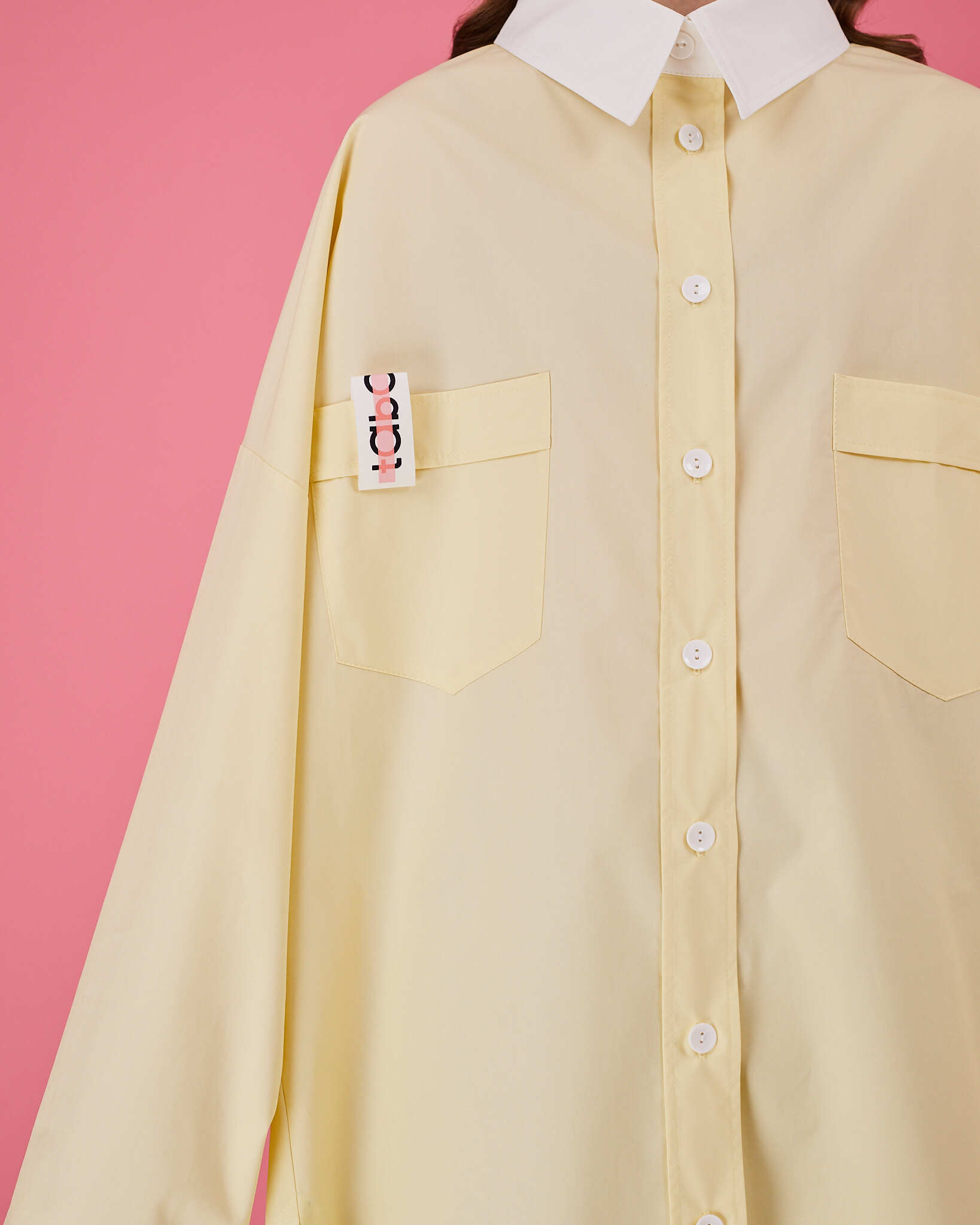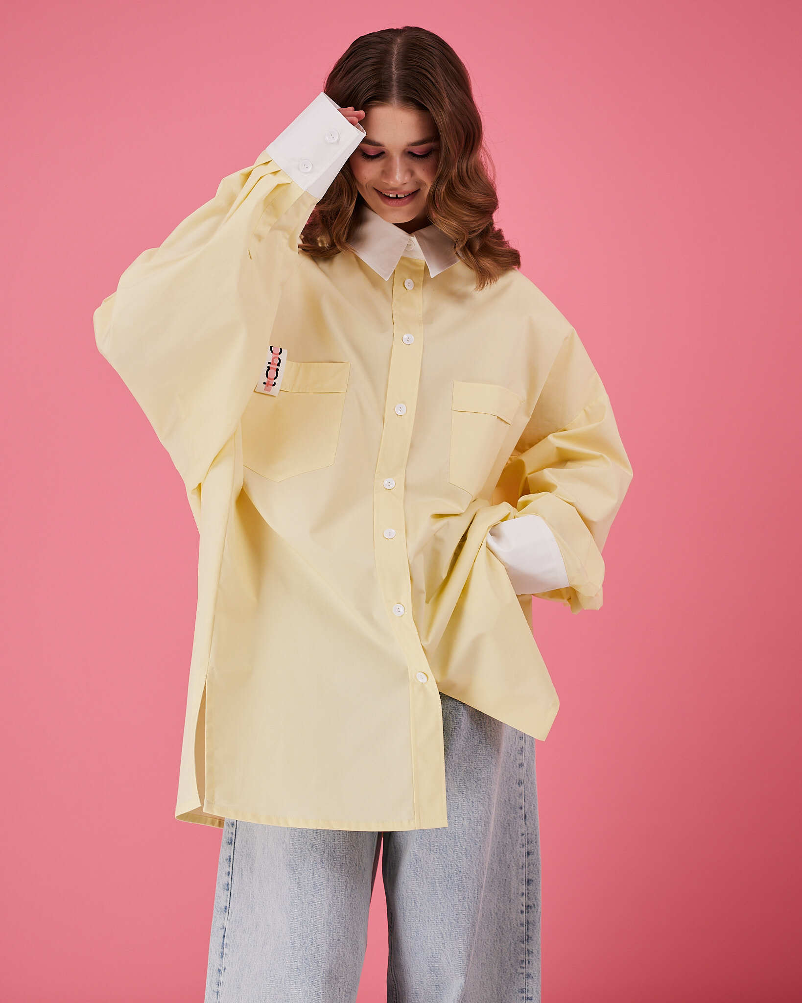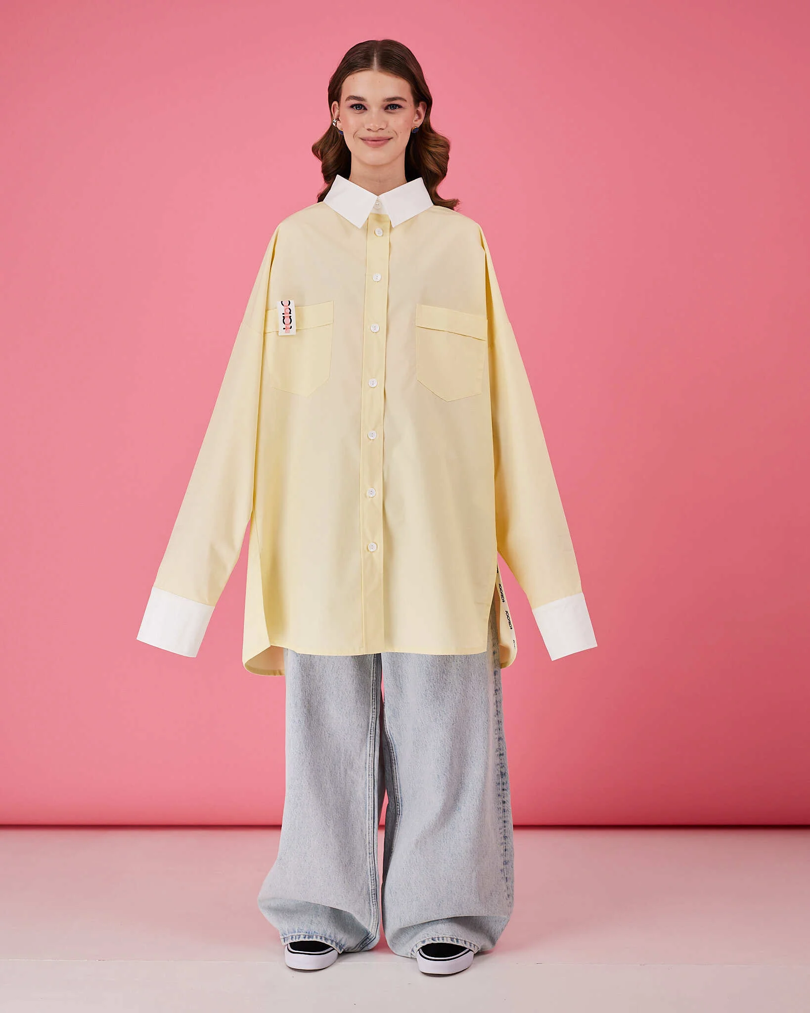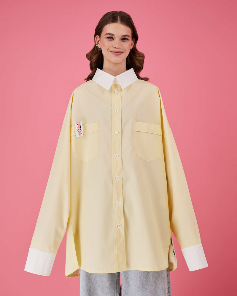 Рубашка прямого очень объемного силуэта имеет отложной воротник, кокетку и двойную складку на спинке. Рукава со складками на притачной манжете с застежкой на пуговицу. Линия низа немного скруглена. В боковых швах разрезы обработаны киперной лентой с логотипом бренда. Два передних кармана, на одном из которых логотип бренда.
