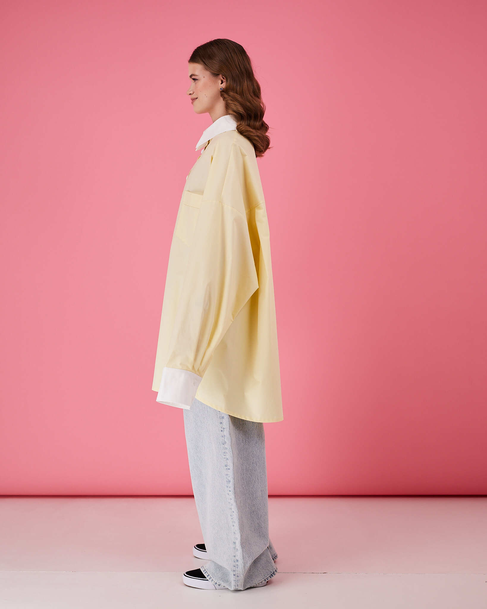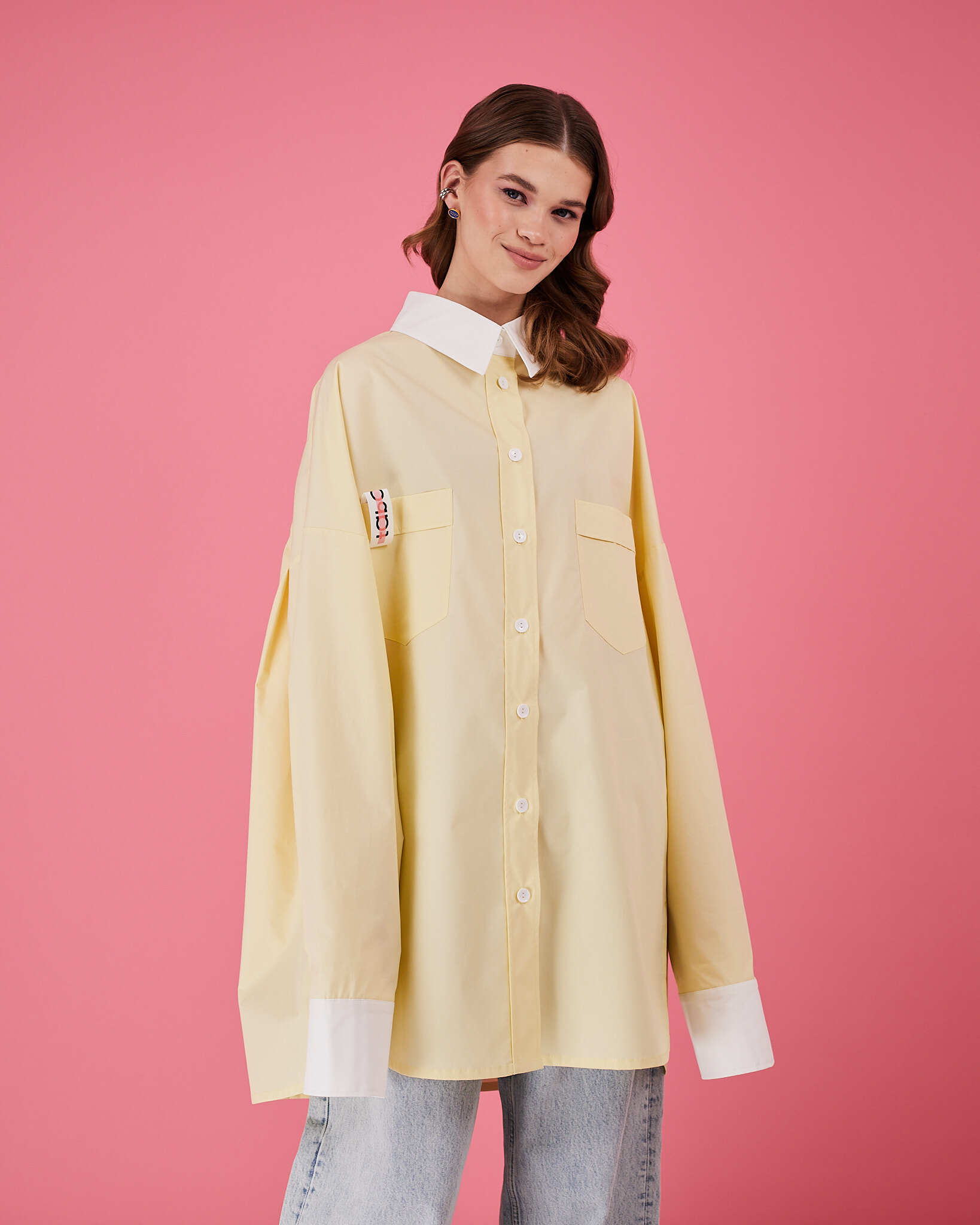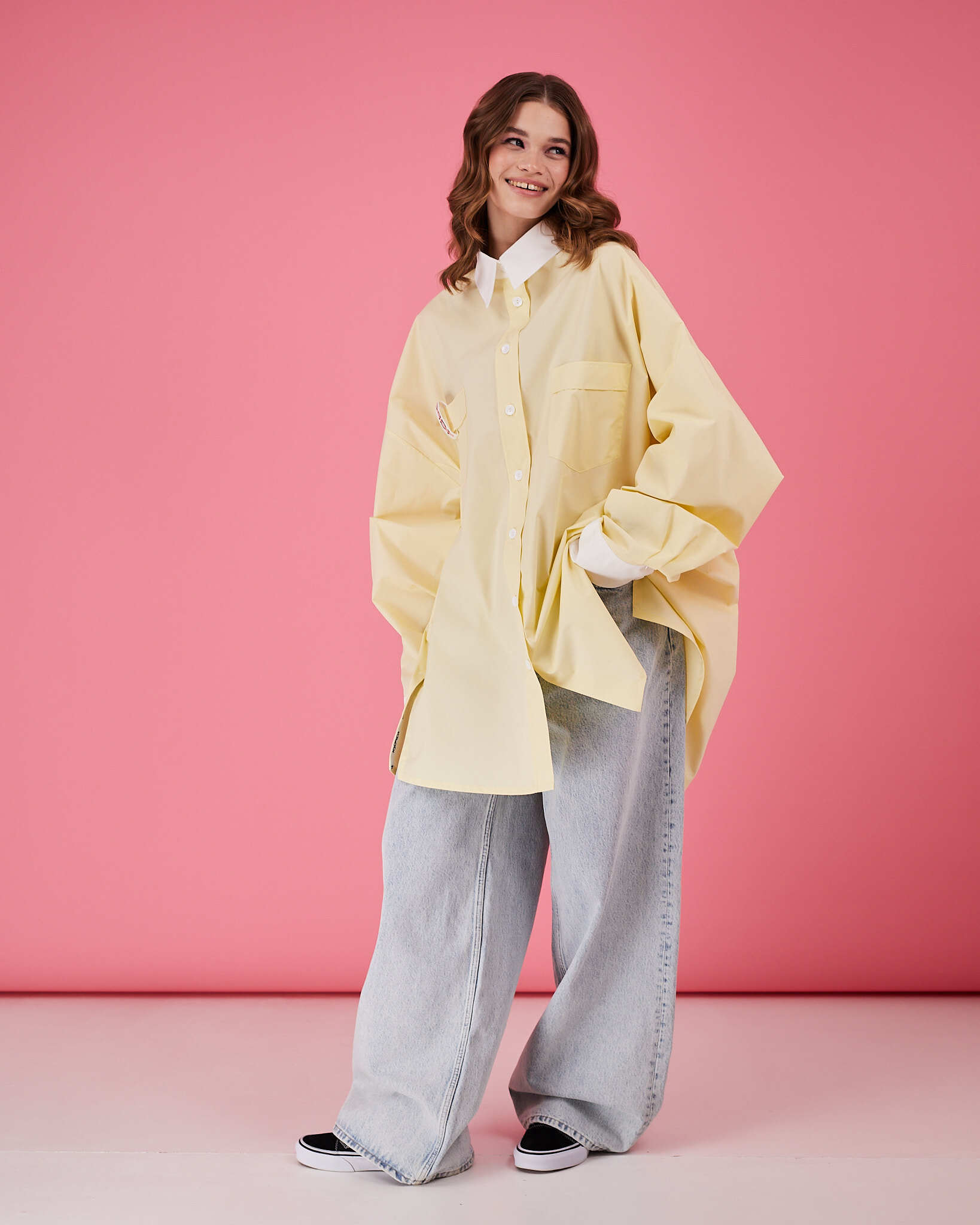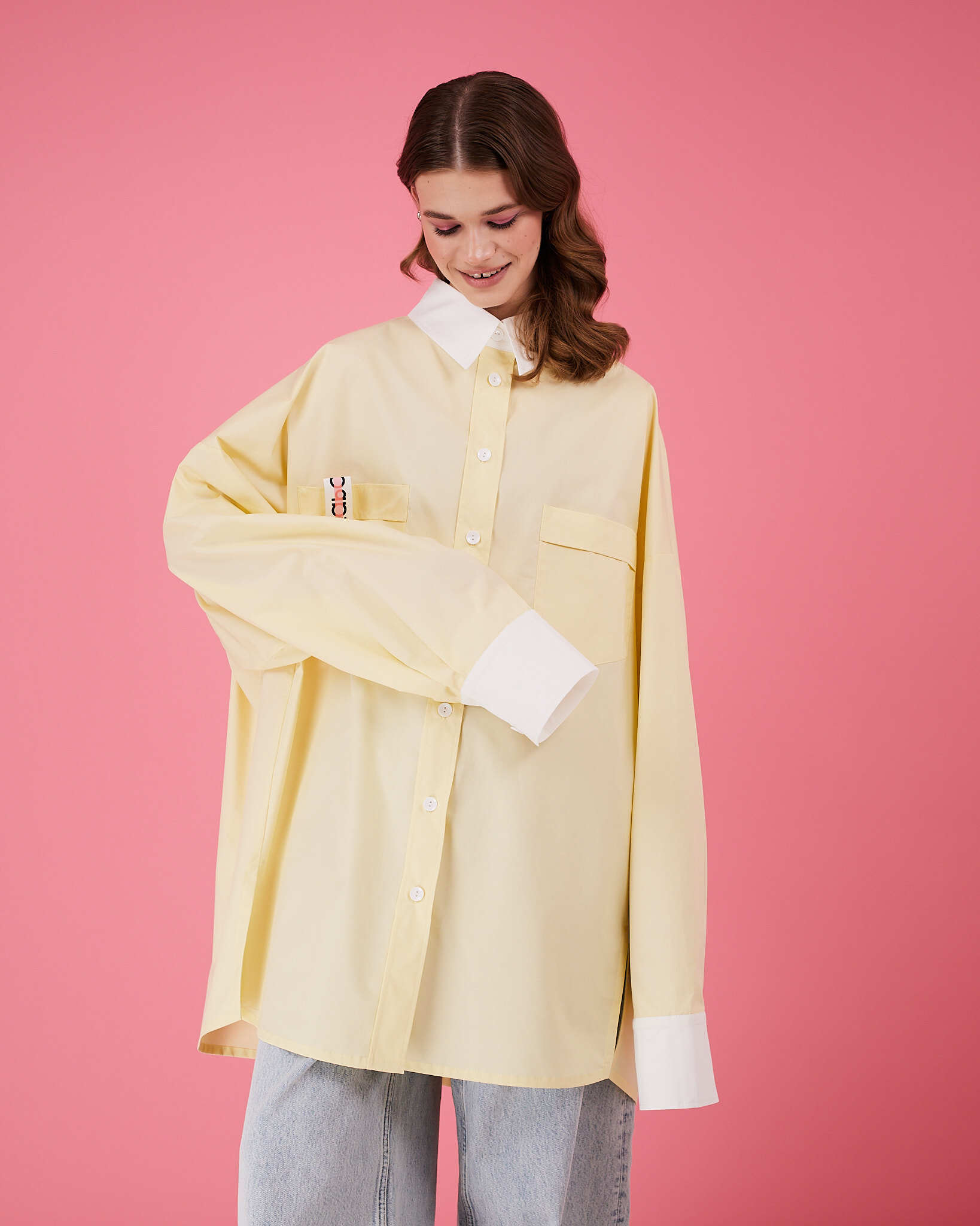 Рубашка прямого очень объемного силуэта имеет отложной воротник, кокетку и двойную складку на спинке. Рукава со складками на притачной манжете с застежкой на пуговицу. Линия низа немного скруглена. В боковых швах разрезы обработаны киперной лентой с логотипом бренда. Два передних кармана, на одном из которых логотип бренда.