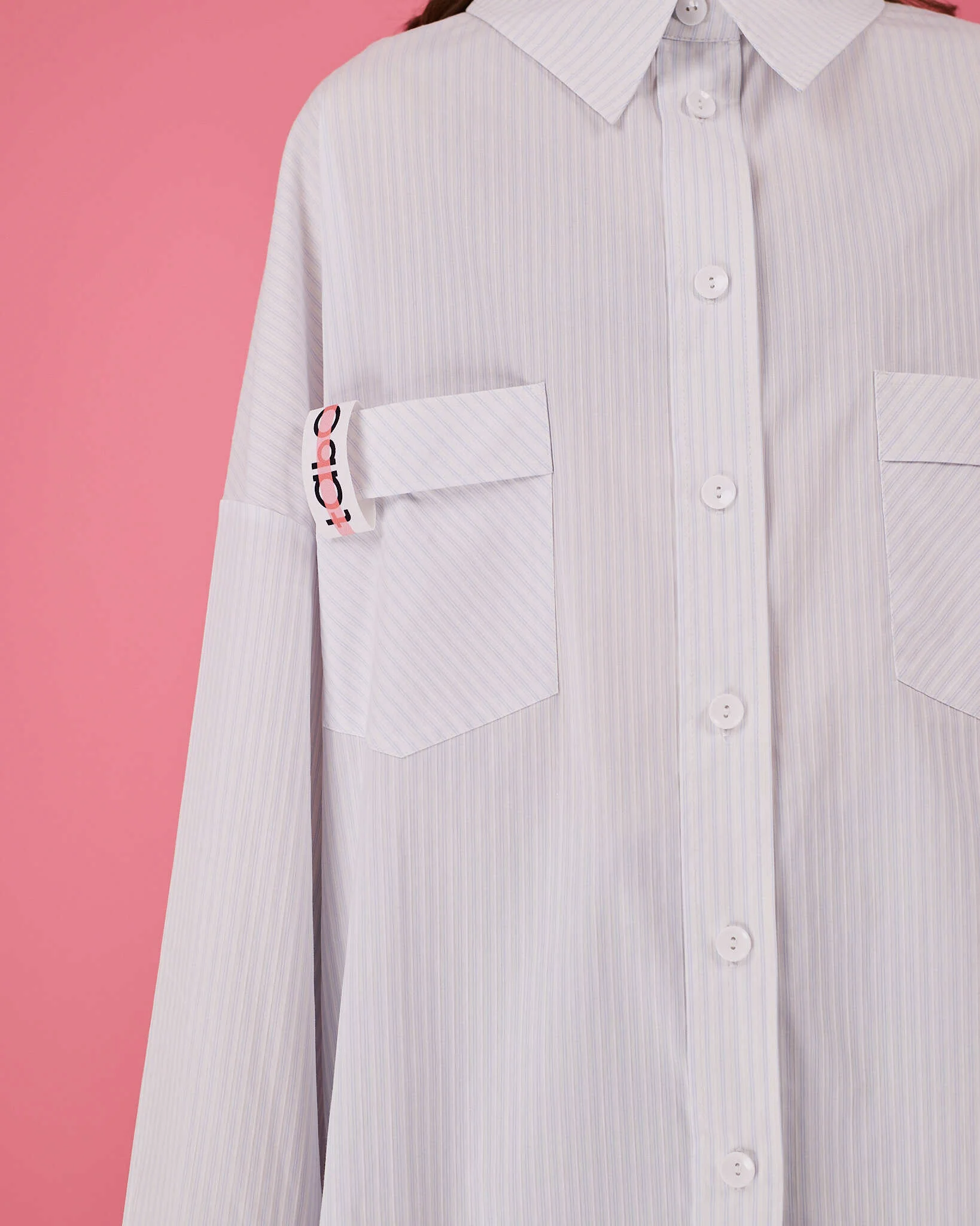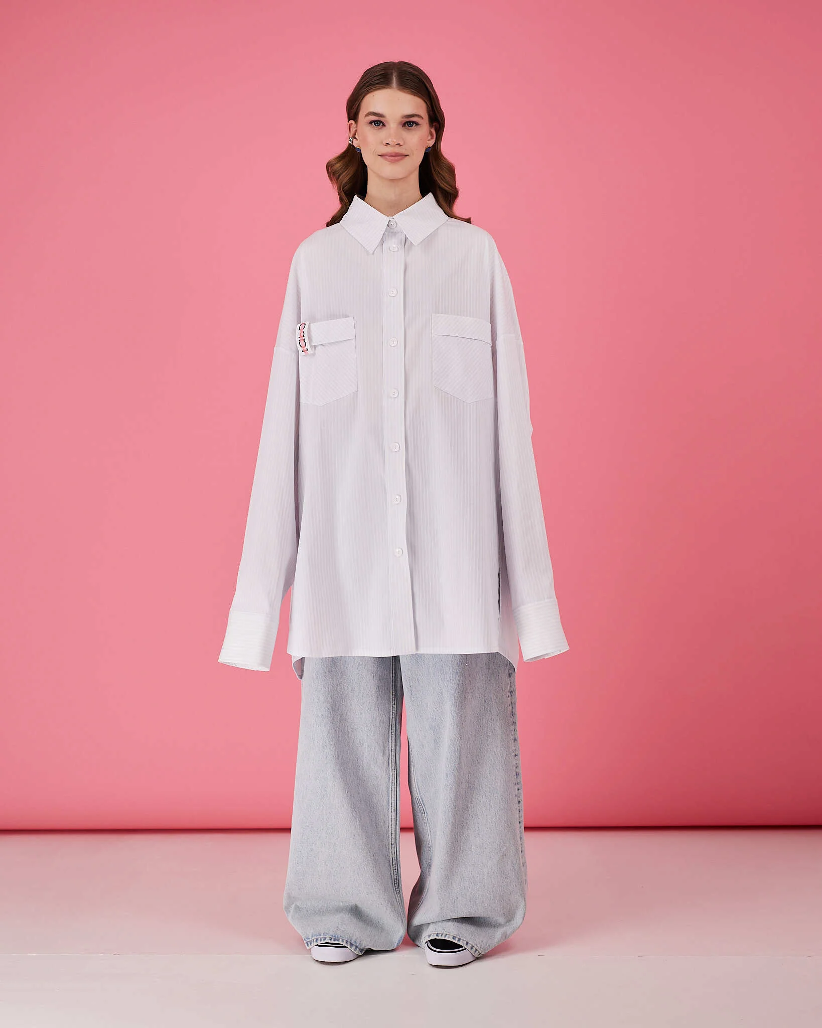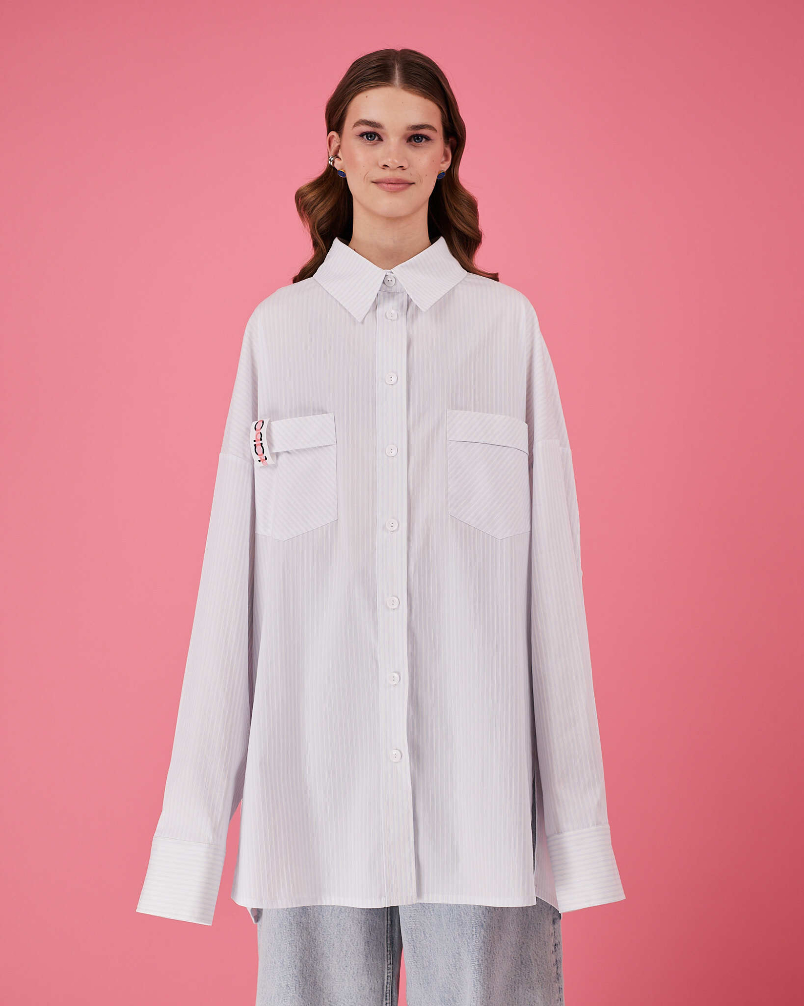Рубашка прямого очень объемного силуэта имеет отложной воротник, кокетку и двойную складку на спинке. Рукава со складками на притачной манжете с застежкой на пуговицу. Линия низа немного скруглена. В боковых швах разрезы обработаны киперной лентой с логотипом бренда. Два передних кармана, на одном из которых логотип бренда.