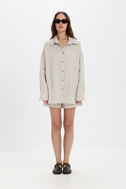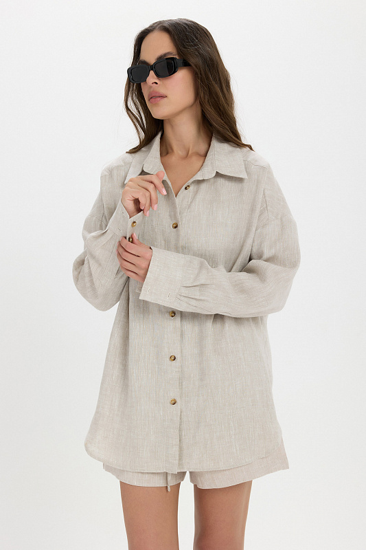 - Отложной воротник и центральная застежка на контрастных пуговицах