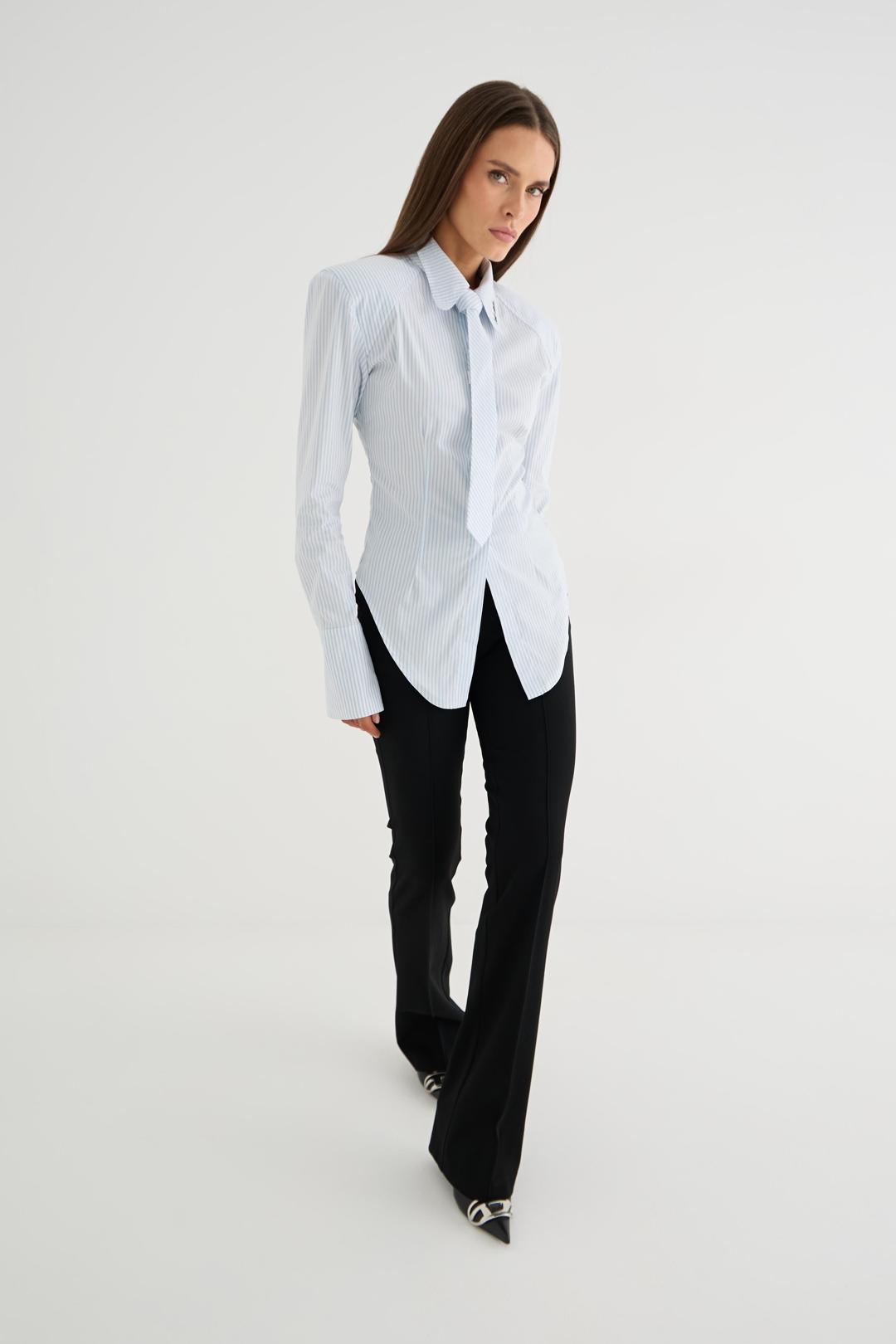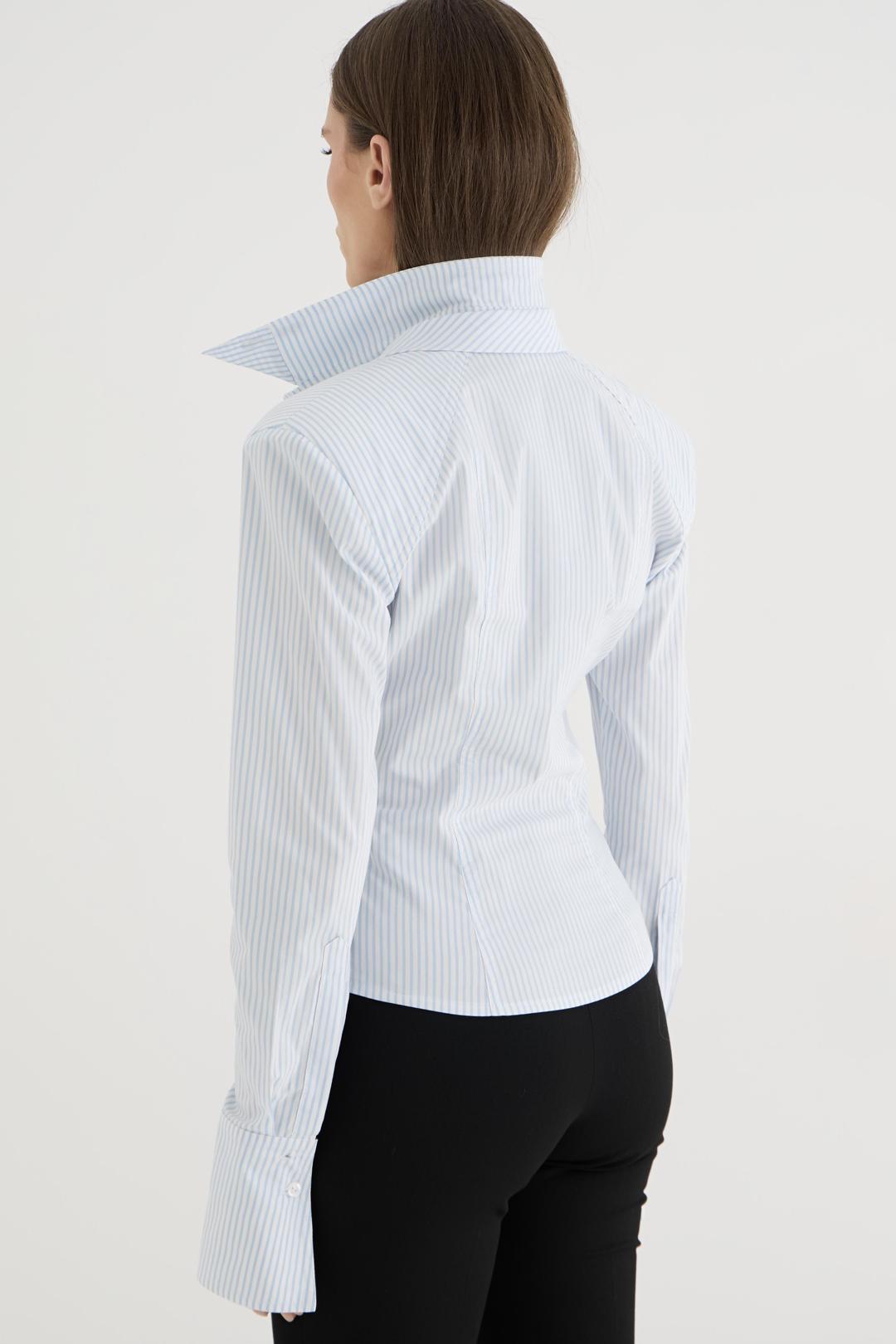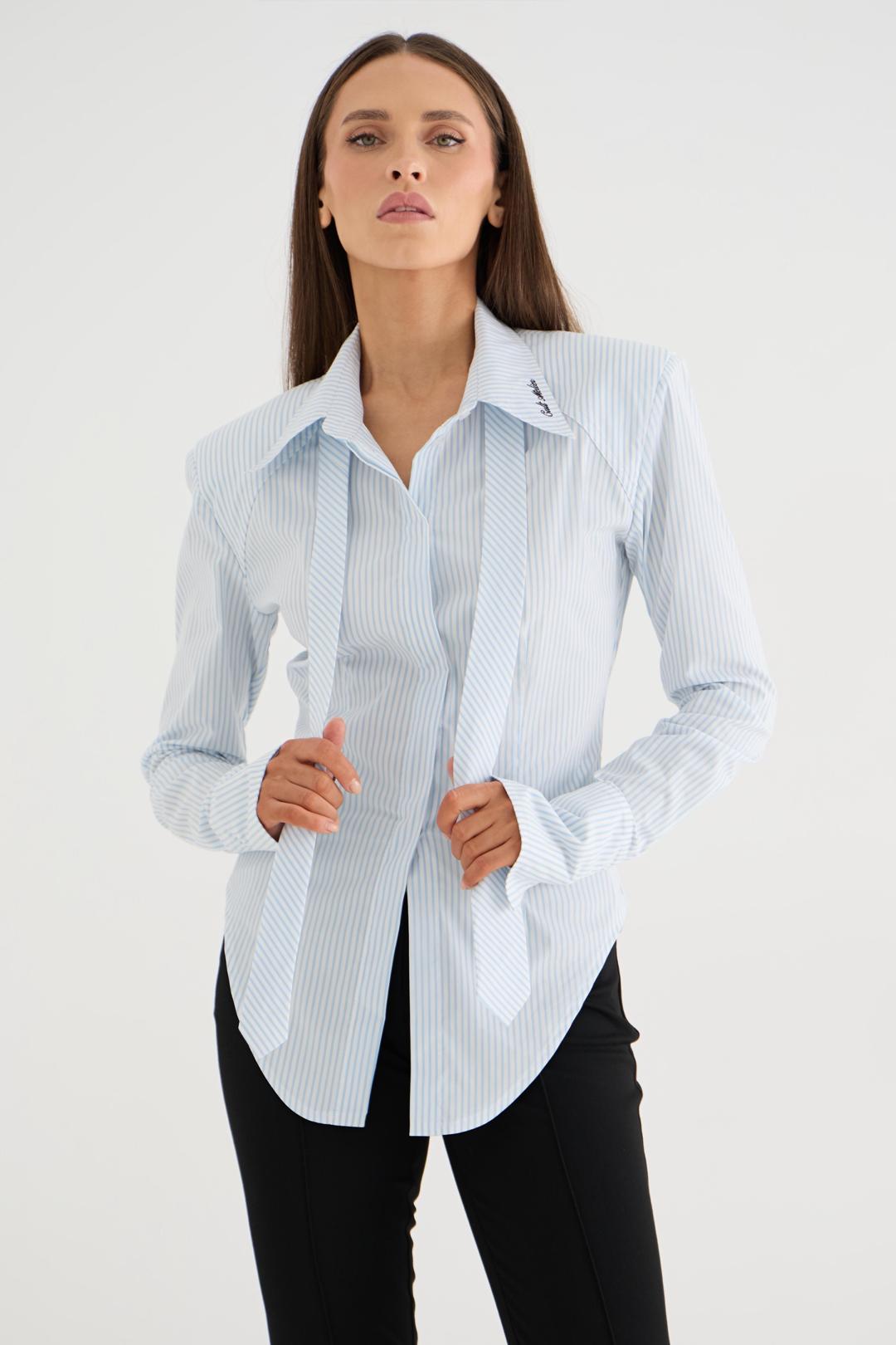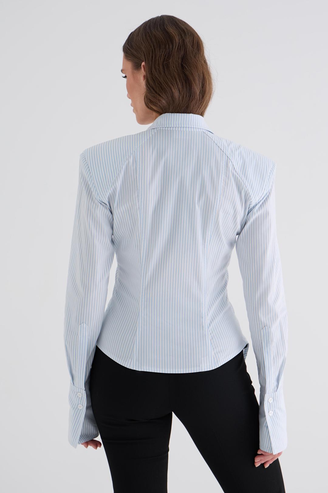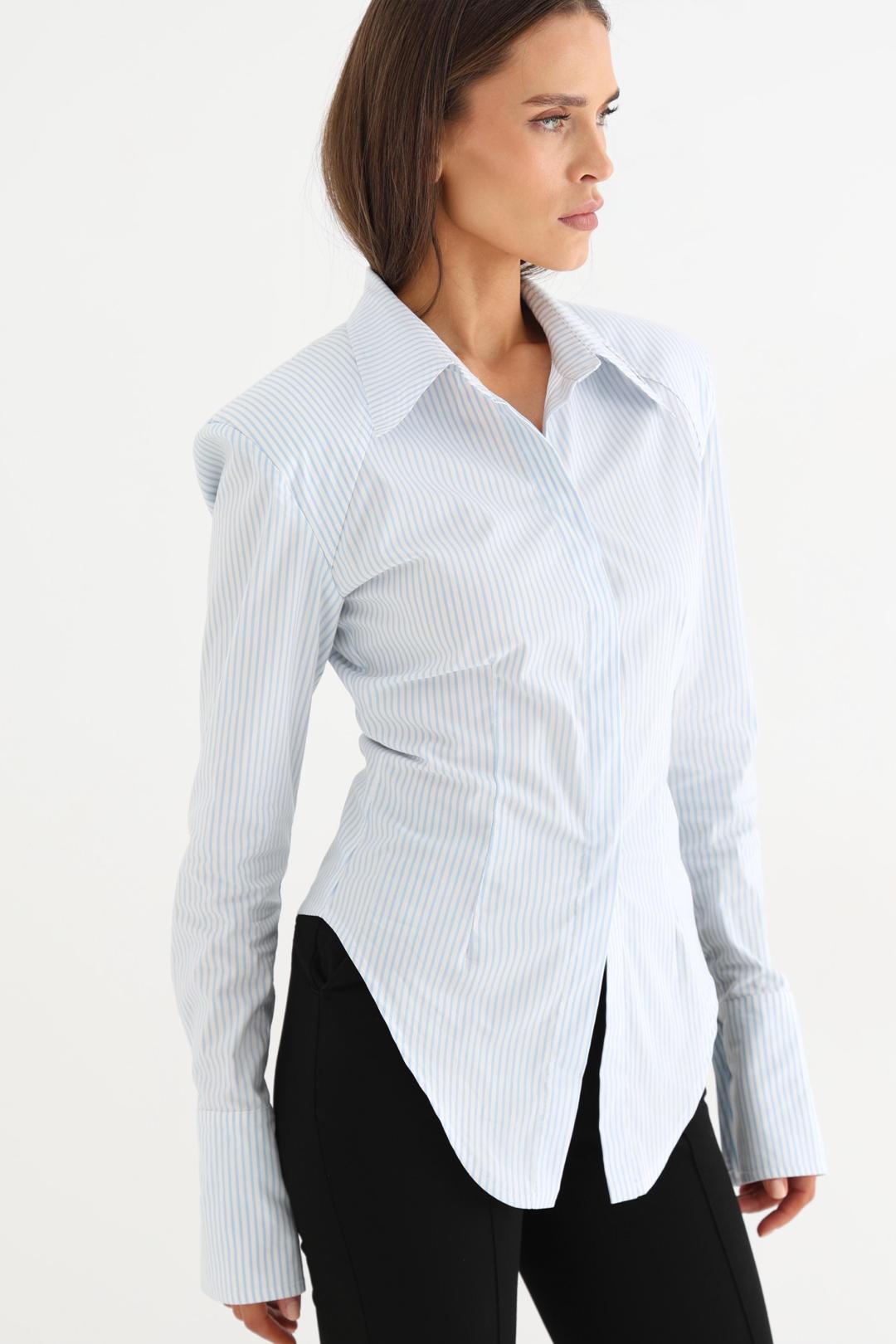 Элегантная рубашка в полоску с приталенным кроем и объёмными плечами — идеальный выбор для создания стильного образа. Модель подчеркнёт вашу фигуру и добавит образу выразительности.