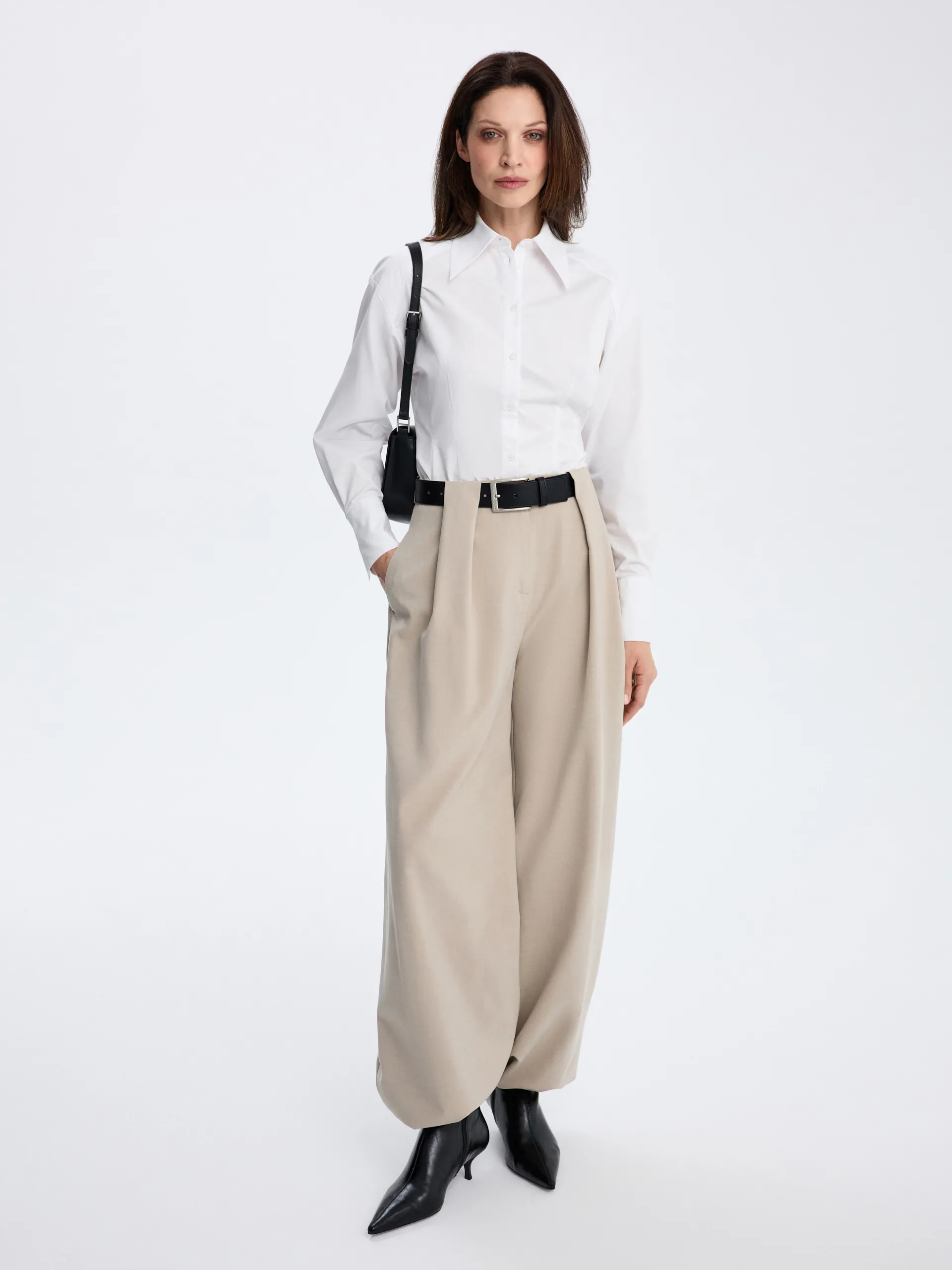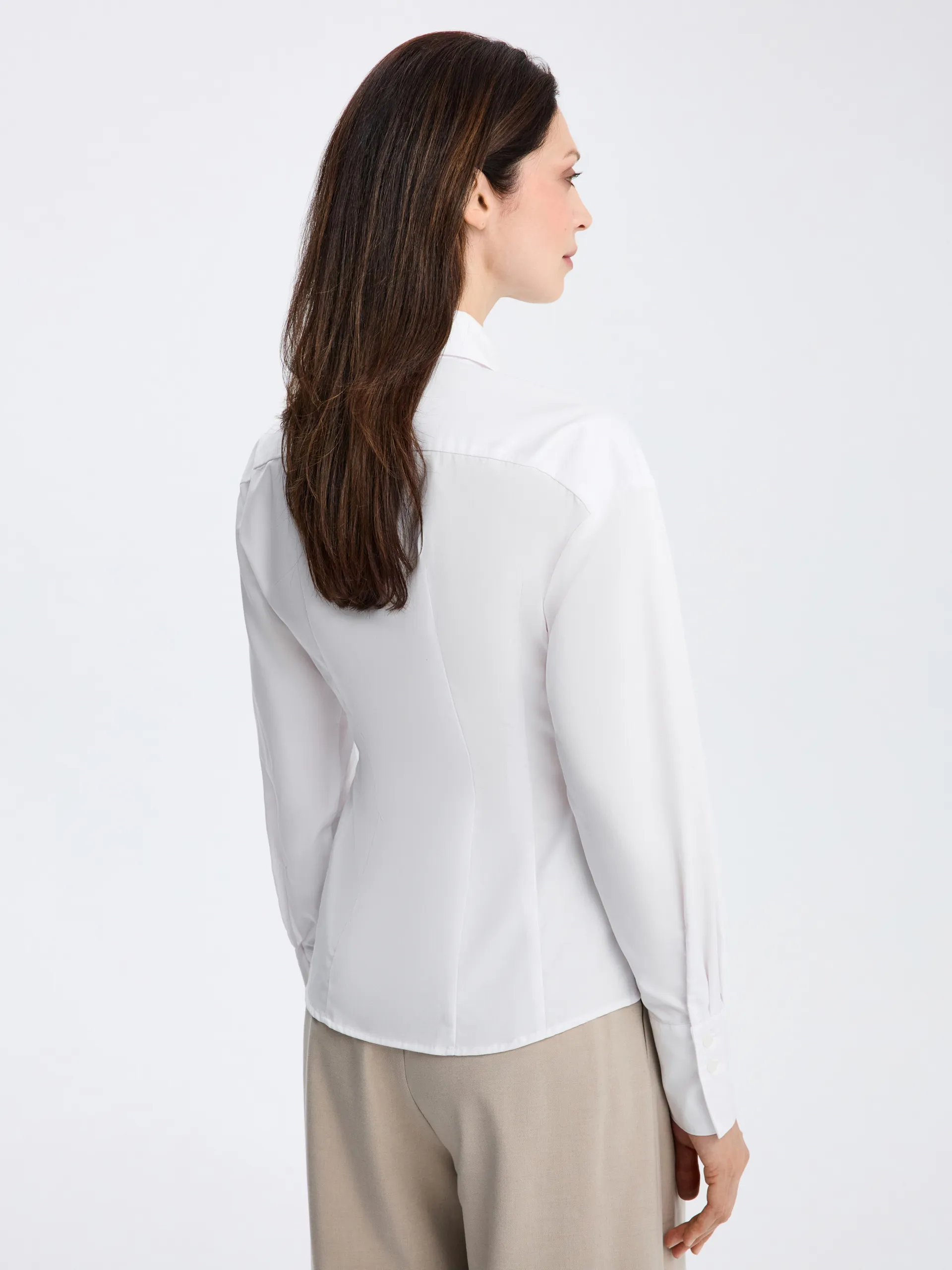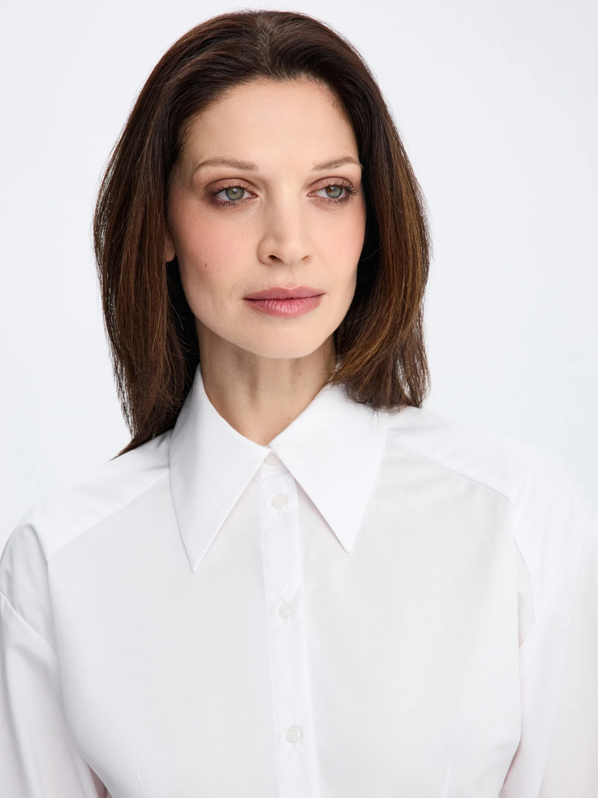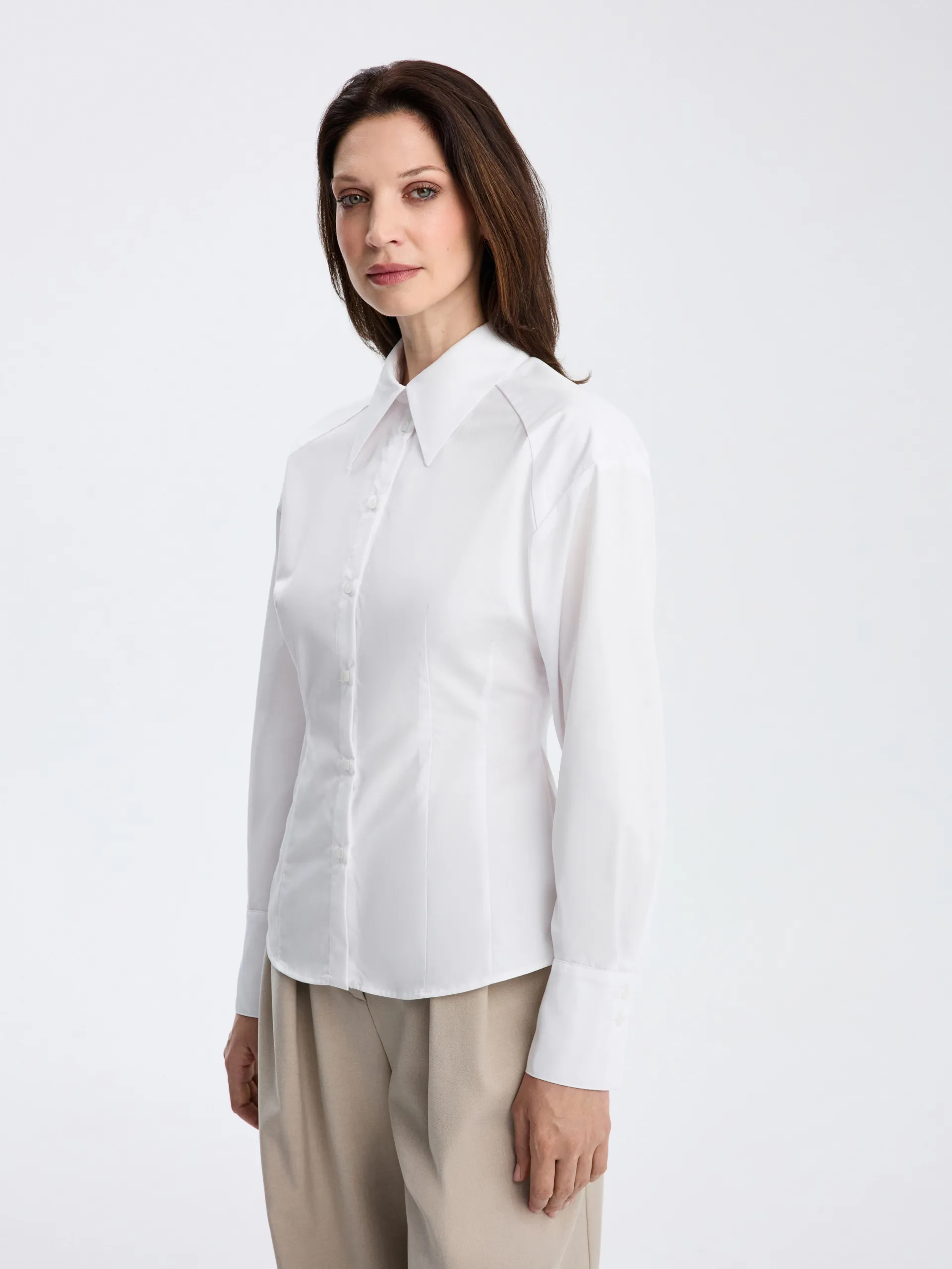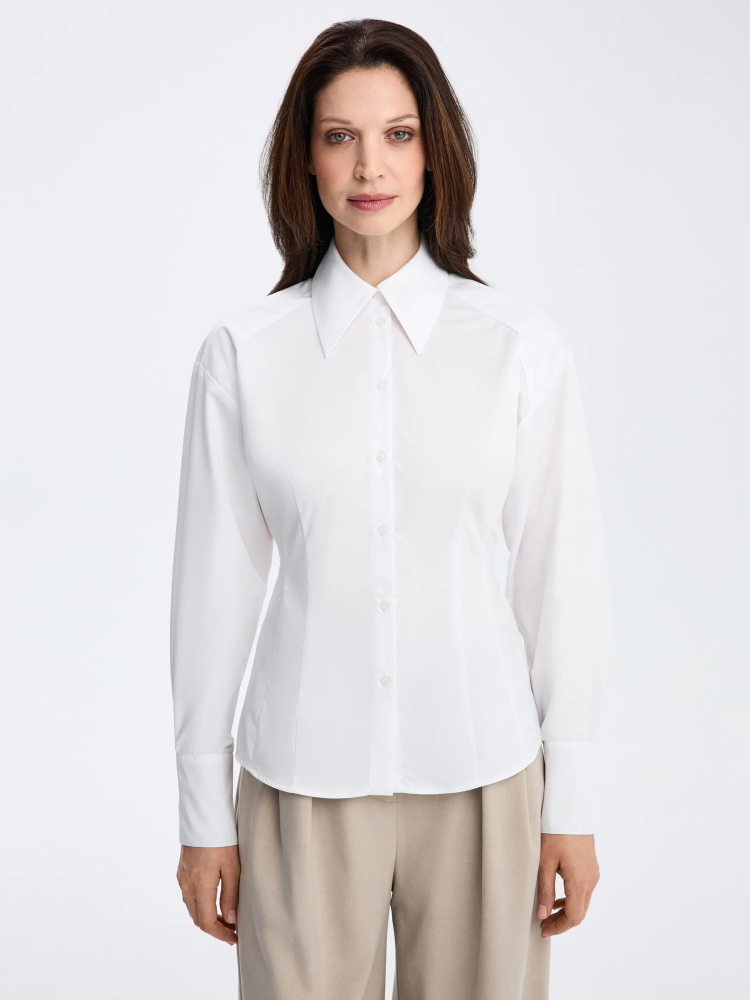 Рубашка Daniel приталенного силуэта в белом цвете выполнена из ткани с содержанием хлопка. Модель со спущенной линией плеч выглядит современно и легко, сохраняя аккуратную посадку по фигуре. Универсальный крой позволяет сочетать рубашку с костюмными брюками, юбками и денимом из коллекции, создавая сдержанные и актуальные образы.
