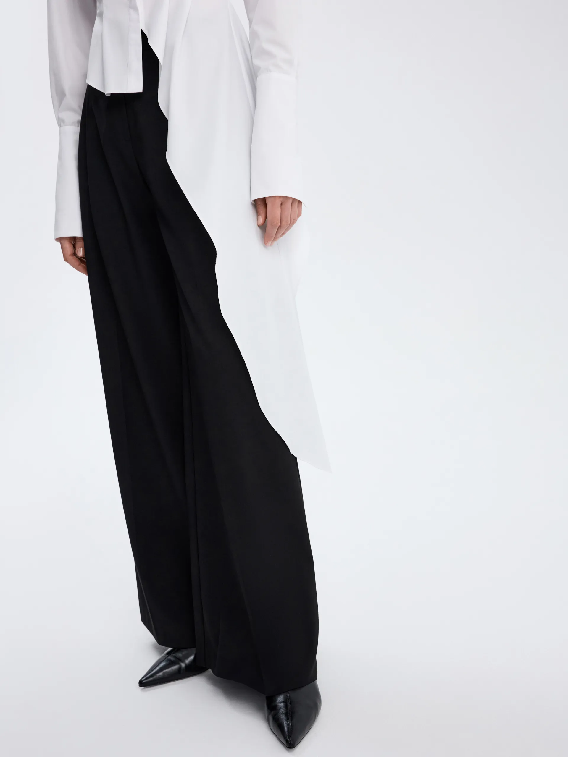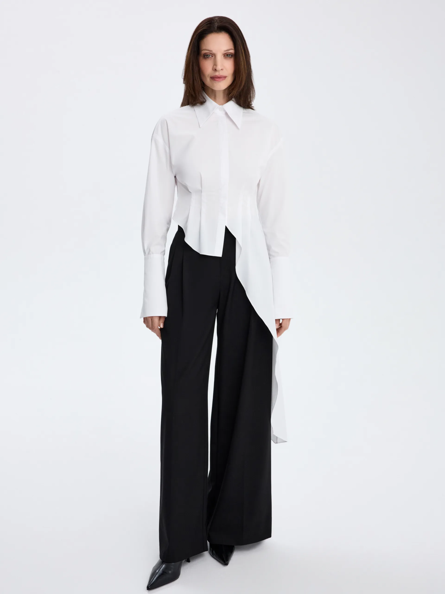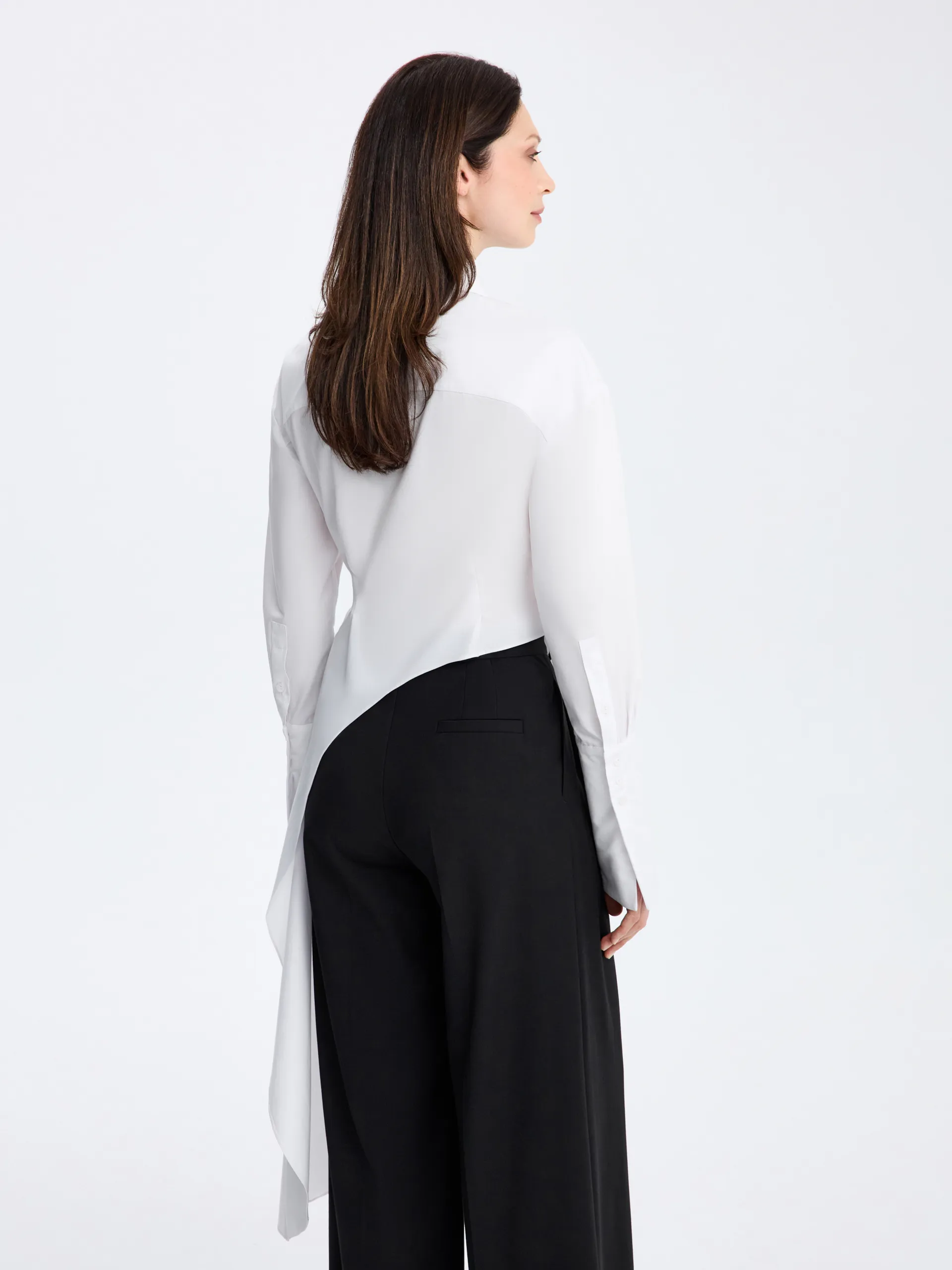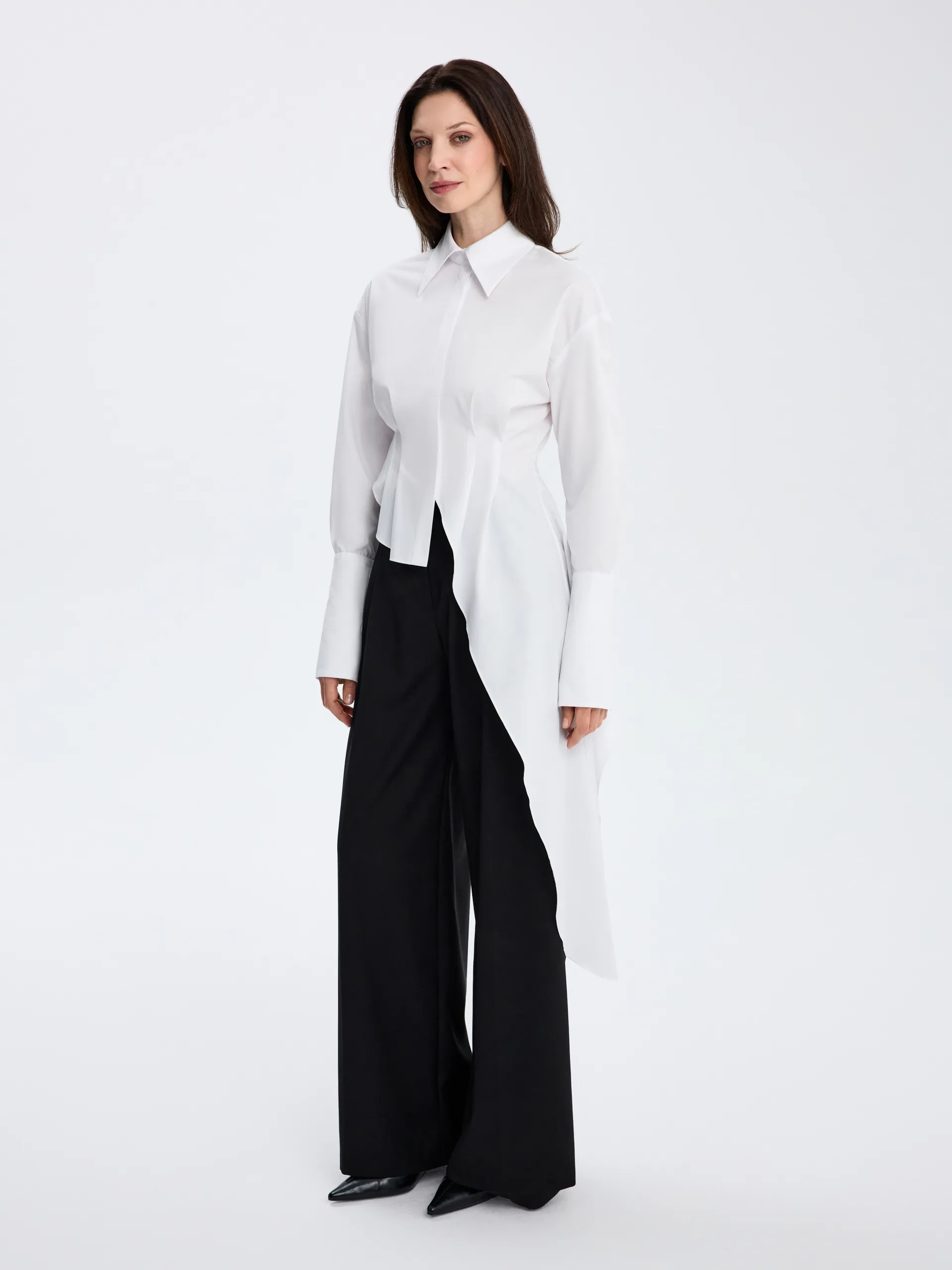 Белая приталенная модель с асимметричным кроем и удлинёнными манжетами, которые добавляют образу выразительность и графичность. Выполнена из хлопковой ткани, комфортной для повседневной носки. Чёткий силуэт подчёркивает фигуру и легко вписывается как в деловые, так и в более расслабленные сочетания — с брюками, юбками или денимом.
